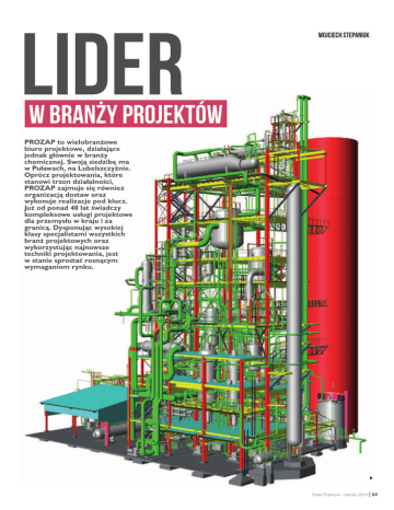 Lider Wojciech Stepaniuk w branży projektów PROZAP to wielobranżowe biuro projektowe, działające jednak głównie w branży chemicznej. Swoją siedzibę ma w Puławach, na Lubelszczyźnie. Oprócz projektowania, które stanowi trzon działalności, PROZAP zajmuje się również organizacją dostaw oraz wykonuje realizacje pod klucz. Już od ponad 40 lat świadczy kompleksowe usługi projektowe dla przemysłu w kraju i za granicą. Dysponując wysokiej klasy specjalistami wszystkich branż projektowych oraz wykorzystując najnowsze techniki projektowania, jest w stanie sprostać rosnącym wymaganiom rynku. Polski Przemysł – marzec 2014 | 64 planowanie realizacji inwestycji, transfer technologii, oceny stanu technicznego, dochodzi do uzgodnień z władzami lokalnymi, sporządza się wnioski o wydanie pozwoleń zintegrowanych oraz specyfikacje techniczne do kontraktów. Na etapie projektowania najwyraźniej uwidoczniają się zalety dużego biura wielobranżowego. PROZAP jest w stanie własnymi siłami wykonać dokumentację projektową we wszystkich branżach: technologicznej, budowlanej, konstrukcyjnej, montażowej, aparaturowej, kontrolno-pomiarowej, elektrycznej i instalacyjno-sanitarnej. Dzięki bezpośredniej komunikacji pomiędzy projektantami wszystkich specjalności można łatwo zidentyfikować i wyeliminować ewentualne problemy. Obsługa projektu inwestycyjnego przez PROZAP nie kończy się w momencie finalizowania projektowania. W czasie budowy projektanci sprawują nadzory autorskie, aby zapewnić zgodność z dokumentacją i wspierać w tym zakresie firmę wykonawczą. Po zakończeniu budowy PROZAP oferuje usługi przeprowadzania odbiorów poszczególnych elementów instalacji i całości inwestycji oraz rozruch mechaniczny i technologiczny. Biuro może nadal towarzyszyć inwestorowi, przygotowując instrukcje obsługi, szkoląc personel oraz wykonując dokumentację powykonawczą. „W ostatnim czasie firma zrealizowała szereg ciekawych kontraktów dla dużych klientów krajowych i zagranicznych, na przykład instalację odsiarczania spalin metodą mokrą, amoniakalną oraz część magazynową nowego kompleksu nawozowego na terenie Grupy Azoty Zakłady Azotowe «Puławy» SA. Oprócz prac, które przebiegały w Polsce, realizowano zlecenia projektowe poza granicami kraju, a nawet kontynentu. Chodzi o światowego potentata z branży chemicznej i nawozowej, firmę SABIC z Arabii Saudyjskiej. Należy podkreślić, że jest to już drugie zamówienie od tej firmy w ciągu ostatnich kilku lat, co wobec faktu, że konkurujemy tam z najsilniejszymi światowymi firmami projektowymi, świadczy o wysokiej ocenie jakości naszych usług przez tego strategicznego dla nas klienta” – dodaje prezes Zatorski. Realizacje jeszcze bardziej kompleksowe N Niedawno PROZAP sp. z o.o. i Grupa Azoty Polskie Konsorcjum Chemiczne sp. z o.o. podpisały porozumienie o współpracy. Jeszcze bliższe współdziałanie dwóch znaczących podmiotów inżynierskich z Grupy Azoty umożliwi bardziej kompleksową realizację inwestycji w ramach grupy kapitałowej oraz poza nią, w kraju i za granicą. „Dzięki zawarciu porozumienia będziemy mogli pełniej wykorzystać możliwości projektowe PROZAP-u i kompetencje projektantów z PKCh. Potencjał obu organizacji – a mam tu na myśli dwustu projektantów posiadających wieloletnie doświadczenie w projektowaniu dla inwestycji w przemyśle chemicznym (ale nie tylko), pracujących na najwyższej klasy oprogramowaniu projektowym – stawia nasze firmy w pozycji jednego z największych i najlepszych biur projektowych w Polsce. Cennym wsparciem jest dla nas również firma projektowa Koncept sp. z o.o. z Polic, która będzie mogła dodatkowo wzmocnić nasz zespół przy realizacji większych projektów” – mówi Marek Zatorski. arodziny firmy przypadły na rok 1970, kiedy to w Puławach powstało Biuro Projektów Zakładów Azotowych. Był to okres rozbudowy polskiej chemii i powstania nowych instalacji. Przez pierwszych 18 lat biuro działało w strukturach Zakładów Azotowych Puławy. Po tym czasie podjęto decyzję o rozszerzeniu działalności i biuro przekształcono w spółkę prawa handlowego – jedną z pierwszych w województwie lubelskim. Od momentu sformowania spółki PROZAP działa na rynku bardzo odważnie. „Można śmiało powiedzieć, że jesteśmy jedną z nielicznych firm naszego pokroju, prowadzącą tak aktywną działalność na zewnątrz: dla klientów krajowych i zagranicznych, praktycznie na całym świecie. Osiągnięcie dzisiejszego poziomu wymagało oczywiście odwagi w przekraczaniu kolejnych granic wytyczonych przez własny zakład, miasto i kraj. Przede wszystkim musieliśmy wykazać się dużymi kompetencjami, być nastawieni na ciągły rozwój i rozszerzanie zakresu naszej działalności. PROZAP wywodzi się z branży nawozowej, ale w tej chwili działa w wielu innych, wcześniej nieznanych sobie sektorach rynku. Rozwijamy się intensywnie na przykład w branży ochrony środowiska. Mamy w ofercie różne rozwiązania mające na celu ograniczenie emisji szkodliwych substancji do atmosfery, przeznaczone dla instalacji przemysłowych oraz energetycznych. Na swej liście referencyjnej – oprócz projektów z branży chemicznej i nawozowej – mamy również wiele innych, związanych z doraźnymi potrzebami naszych klientów spoza branży chemicznej, na przykład spalarnie śmieci czy stacje uzdatniania wody. Generalnie jesteśmy elastyczni i wychodzimy naprzeciw oczekiwaniom klienta” – mówi Marek Zatorski, prezes PROZAP. Od projektu do przecięcia wstęgi PROZAP specjalizuje się też w projektach ochrony środowiska i redukcji emisji spalin. Do takich sztandarowych projektów należy zaliczyć wspomnianą już Instalację Odsiarczania Spalin w Puławach. W ramach tej realizacji PROZAP pełnił funkcje kierującego biura projektów. Zadaniem biura było dostarczenie wszelkiej koniecznej dokumentacji dla r