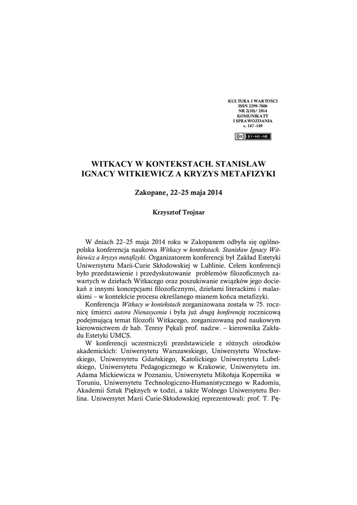 KULTURA I WARTOŚCI ISSN 2299-7806 NR 2(10)/ 2014 KOMUNIKATY I SPRAWOZDANIA s. 147–149 WITKACY W KONTEKSTACH. STANISŁAW IGNACY WITKIEWICZ A KRYZYS METAFIZYKI Zakopane, 22–25 maja 2014 Krzysztof Trojnar W dniach 22–25 maja 2014 roku w Zakopanem odbyła się ogólnopolska konferencja naukowa Witkacy w kontekstach. Stanisław Ignacy Witkiewicz a kryzys metafizyki. Organizatorem konferencji był Zakład Estetyki Uniwersytetu Marii-Curie Skłodowskiej w Lublinie. Celem konferencji było przedstawienie i przedyskutowanie problemów filozoficznych zawartych w dziełach Witkacego oraz poszukiwanie związków jego dociekań z innymi koncepcjami filozoficznymi, dziełami literackimi i malarskimi – w kontekście procesu określanego mianem końca metafizyki. Konferencja Witkacy w kontekstach zorganizowana została w 75. rocznicę śmierci autora Nienasycenia i była już drugą konferencją rocznicową podejmującą temat filozofii Witkacego, zorganizowaną pod naukowym kierownictwem dr hab. Teresy Pękali prof. nadzw. – kierownika Zakładu Estetyki UMCS. W konferencji uczestniczyli przedstawiciele z różnych ośrodków akademickich: Uniwersytetu Warszawskiego, Uniwersytetu Wrocławskiego, Uniwersytetu Gdańskiego, Katolickiego Uniwersytetu Lubelskiego, Uniwersytetu Pedagogicznego w Krakowie, Uniwersytetu im. Adama Mickiewicza w Poznaniu, Uniwersytetu Mikołaja Kopernika w Toruniu, Uniwersytetu Technologiczno-Humanistycznego w Radomiu, Akademii Sztuk Pięknych w Łodzi, a także Wolnego Uniwersytetu Berlina. Uniwersytet Marii Curie-Skłodowskiej reprezentowali: prof. T. Pę- 148 Krzysztof Trojnar, Witkacy w kontekstach… kala – kierownik naukowy konferencji, dr hab. C. Mordka, dr R. Czekaj, dr M. Krawczyk – sekretarz konferencji. Udział wzięli także doktoranci: mgr L. Kozak i mgr K. Trojnar. Przedstawicielem Zakładu Historii Filozofii Nowożytnej był dr hab. A. Ostrowski. Ponadto na konferencję została zaproszona prof. dr hab. K. Wilkoszewska – prezes Polskiego Towarzystwa Estetycznego. Tematy wygłoszonych referatów i żywe dyskusje ogniskowały się wokół zagadnień filozoficznych, estetycznych, artystycznych i literackich myśli Witkacego. Rozpiętość tematyczna i zróżnicowanie perspektyw interpretacyjnych potwierdziły trafność otwartej na różne dyscypliny formuły konferencji. Oto pełna lista dwudziestu sześciu referatów wygłoszonych podczas tej konferencji. Pierwszego dnia odbyły się trzy sesje tematyczne, w trakcie których wygłoszono trzynaście referatów. Konferencję otworzyło wystąpienie prof. Teresy Pękali (UMCS) Nowe konteksty- stare pytania. W części pierwszej, poświęconej ontologii Witkacego, referaty wygłosili: dr Maciej Dombrowski (UWr), Ontologia Ogólna S. I. Witkiewicza a tzw. kryzys metafizyki.; mgr Anna Duda-Szafranek (UMCS) Realizm monadologiczny Stanisława Ignacego Witkiewicza wobec kryzysu metafizyki.; dr Kazimierz Piotrowski (ASP w Łodzi) Metafizyka i perwersja. Problem ontogenezy w monadologii Witkacego; dr Kazimierz Łyszcz (UTH w Radomiu) Witkacy jako turysta. Druga część została poświęcona koncepcjom teoretycznym w myśli Witkacego. Głos zabrali: dr Beata Garlej „Rozmowy istotne” Witkiewicza z Ingardenem; prof. Piotr Przybysz( UG) Witkacy w oczach Stefana Morawskiego: punkty kluczowe i krytyka, mgr Liliana Kozak (UMCS) Portrety Witkacego – twarze niepokoju; Włodzimierz Mirski Moja droga do fascynacji Witkacym. W trzeciej części podjęto próbę dokonania literackiej analizy powieści i tragedii Witkacego. Referaty wygłosili: mgr Agnieszka Hudzik (Wolny Uniwersytet Berlina) Witkacy i Broch – eksperymenty z formą powieściową; dr Dorota Niedziałkowska (KUL) Autoportrety rosyjskie w kontekstach; mgr Paweł Polit (Muzeum Sztuki w Łodzi) Jedność osobowości i plastyczny stan umysłu. Witkiewicz i Boccioni (z Bergsonem w tle). Drugiego dnia wygłoszono jedenaście referatów. W części czwartej, poświęconej metafizycznym zagadnieniom myśli Witkacego, głos zabrali: prof. Ewa Łubieniewska (UP w Krakowie) Czy „to piekło myszką trąci?” (o Witkiewiczowskiej metafizyce zła); prof. Tadeusz Szkołut (UMCS) „Przeżyć siebie istotnie”. Metafizyka Witkacego w kontekście idei nieredukowalnej 149 Krzysztof Trojnar, Witkacy w kontekstach… obcości świata; dr hab. Andrzej Ostrowski (UMCS) Konieczność Nicości Absolutnej; dr hab. Cezary Mordka (UMCS) Pożegnanie Witkacego? Uwagi o aktualności poglądów metafizycznych i estetycznych S. I. Witkiewicza. Część piąta została poświęcona zagadnieniom estetycznym myśli Witkacego, swoje referaty wygłosili: prof. Artur Mordka (UR) Jedność artystyczna malarskiego dzieła sztuki a odczucie jedności istnienia; dr Olga Kłosiewicz (UW) S. I. Witkiewicza walka z mimesis: forma, deformacja, transformacja; dr Irena Górska (UAM w Poznaniu) Witkacy w „Listach do żony”. Między psychofizyką a somaestetyką; dr Ewa Szkudlarek (UAM w Poznaniu) W metafizycznych prześwitach obrazów – estetyka błękitu Witkacego. Odniesienia myśli Witkacego do współczesnej kultury zdominowały część szóstą, w której referaty przedstawili: mgr Przemysław Pawlak Narodziny biocybernetyki źródłem Witkacowskiego katastrofizmu; mgr Eryk Maciejowski (UMCS) Czy żyjemy w świecie po katastrofie? Próba refleksji nad katastroficznymi prognozami Stanisława Ignacego Witkiewicza; mgr Krzysztof Trojnar (UMCS) Witkacy – prekursor memu? W ostatnim dniu konferencji, w części siódmej, wygłoszono dwa referaty: dr Rafał Czekaj (UMCS) Tam, gdzie Adorno spotyka Witkacego – wspólne motywy filozoficzne; dr Marcin Krawczyk (UMCS) Estetyzacja a metafizyka w perspektywie Witkacego. Na zakończenie obrad prof. Teresa Pękala dokonała podsumowania konferencji oraz podziękowała uczestnikom za udział w tym naukowym spotkaniu. Duże zainteresowanie konferencją, przejawiające się w liczbie wygłoszonych referatów, może świadczyć o ważności i aktual