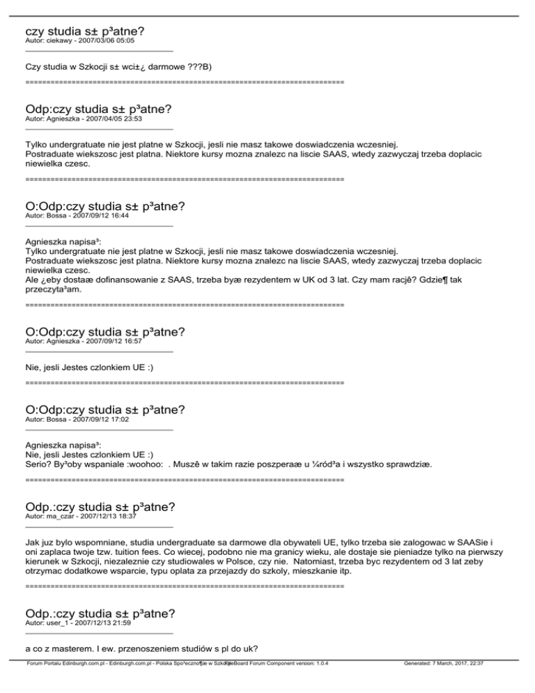 czy studia s± p³atne? Autor: ciekawy - 2007/03/06 05:05 _____________________________________ Czy studia w Szkocji s± wci±¿ darmowe ???B) ============================================================================ Odp:czy studia s± p³atne? Autor: Agnieszka - 2007/04/05 23:53 _____________________________________ Tylko undergratuate nie jest platne w Szkocji, jesli nie masz takowe doswiadczenia wczesniej. Postraduate wiekszosc jest platna. Niektore kursy mozna znalezc na liscie SAAS, wtedy zazwyczaj trzeba doplacic niewielka czesc. ============================================================================ O:Odp:czy studia s± p³atne? Autor: Bossa - 2007/09/12 16:44 _____________________________________ Agnieszka napisa³: Tylko undergratuate nie jest platne w Szkocji, jesli nie masz takowe doswiadczenia wczesniej. Postraduate wiekszosc jest platna. Niektore kursy mozna znalezc na liscie SAAS, wtedy zazwyczaj trzeba doplacic niewielka czesc. Ale ¿eby dostaæ dofinansowanie z SAAS, trzeba byæ rezydentem w UK od 3 lat. Czy mam racjê? Gdzie¶ tak przeczyta³am. ============================================================================ O:Odp:czy studia s± p³atne? Autor: Agnieszka - 2007/09/12 16:57 _____________________________________ Nie, jesli Jestes czlonkiem UE :) ============================================================================ O:Odp:czy studia s± p³atne? Autor: Bossa - 2007/09/12 17:02 _____________________________________ Agnieszka napisa³: Nie, jesli Jestes czlonkiem UE :) Serio? By³oby wspaniale :woohoo: . Muszê w takim razie poszperaæ u ¼ród³a i wszystko sprawdziæ. ============================================================================ Odp.:czy studia s± p³atne? Autor: ma_czar - 2007/12/13 18:37 _____________________________________ Jak juz bylo wspomniane, studia undergraduate sa darmowe dla obywateli UE, tylko trzeba sie zalogowac w SAASie i oni zaplaca twoje tzw. tuition fees. Co wiecej, podobno nie ma granicy wieku, ale dostaje sie pieniadze tylko na pierwszy kierunek w Szkocji, niezaleznie czy studiowales w Polsce, czy nie. Natomiast, trzeba byc rezydentem od 3 lat zeby otrzymac dodatkowe wsparcie, typu oplata za przejazdy do szkoly, mieszkanie itp. ============================================================================ Odp.:czy studia s± p³atne? Autor: user_1 - 2007/12/13 21:59 _____________________________________ a co z masterem. I ew. przenoszeniem studiów s pl do uk? Forum Portalu Edinburgh.com.pl - Edinburgh.com.pl - Polska Spo³eczno¶æ w Szkocji FireBoard Forum Component version: 1.0.4 Generated: 7 March, 2017, 22:37 ============================================================================ Odp.:czy studia s± p³atne? Autor: Agnieszka - 2007/12/14 18:28 _____________________________________ Mgr zalezy w jakiej dziedzinie, ale w wiekszosci trzeba placic, no i znow czlonkowie EU placa polowe tego co reszta swiata :) ============================================================================ Odp.:czy studia s± p³atne? Autor: pektusa - 2009/02/24 10:02 _____________________________________ dlaczego oplaca sie studiowac w szkocji? czy poziom szkoly jest wyzszy? ============================================================================ Odp.:czy studia s± p³atne? Autor: Bossa - 2009/02/24 12:15 _____________________________________ Poziom jakiej szkoly? Wyzszy niz co? :) ============================================================================ Odp.:czy studia s± p³atne? Autor: Kafka - 2011/02/04 12:07 _____________________________________ Mo¿e g³upie pytanie, ale na SAASie rejestrujesz siê jak ju¿ wiesz, ¿e siê dosta³e¶ na dany kierunek czy wcze¶niej? Wiecie co¶ na temat innych mo¿liwo¶ci dofinansowania studiów postgraduates? ============================================================================ Odp.:czy studia s± p³atne? Autor: Hansjugend von Zaataan - 2011/02/04 12:21 _____________________________________ zdaje sie mi, ze saas nie palci za postgraduate jest jeszcze opcja zasponsorowania ============================================================================ Odp.:czy studia s± p³atne? Autor: lakoma - 2011/02/04 12:38 _____________________________________ Ask uncle Google :) Zalezy, co chcesz studiowac i na jakim poziomie: http://www.student-supportsaas.gov.uk/student_support/special_circumstances/postgrad_courses.htm Ale nie wszystko stracone, jest od groma i ciut ciut roznych stypendiow (scholarships, studentships, bursaries) - wiecej tu: http://www.npc.org.uk/page/1082154863 Prosie. ============================================================================ Forum Portalu Edinburgh.com.pl - Edinburgh.com.pl - Polska Spo³eczno¶æ w Szkocji FireBoard Forum Component version: 1.0.4 Generated: 7 March, 2017, 22:37 Odp.:czy studia s± p³atne? Autor: keyjeysi - 2011/02/05 12:59 _____________________________________ Z tego co pamietam to: Aplikuje sie przez UCAS Undergraduate jest pokrywany przez SAAS Postgraduate - odplatne studia. Moga byc oplacane przez SAAS ale to nie zdarza sie czesto i zalezy od Uniwersytetu. Dodam ciekawostke, ze Uniwersytety w UK otrzymuja limitowana liczbe miejsc na postgradzie, ktora sa oplacane przez SAAS (sponsored placements). Najlepszym sposobem jest najpierw byc pewnym tego co sie chce studiowac i gdzie. Pozniej dowiedziec sie kto jest szefem kierunku i umowic sie na rozmowe. Uczelnie tutaj maja czysto biznesowe podejscie do studiow i potencjalnych studentow. ============================================================================ Odp.:czy studia s± p³atne? Autor: Kafka - 2011/02/06 23:01 _____________________________________ dziêki za wskazówki, jako nie do koñca mogê siê odnale¼æ w tutejszym systemie (nie tylko edukacyjnym) ============================================================================ Odp.:czy studia s± p³atne? Autor: keyjeysi - 2011/02/08 00:00 _____________________________________ To dobre miejsce, zeby pytac. Nikt s