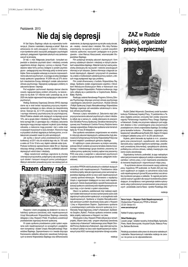 2 X 2013_Layout 1 2013-10-30 20:24 Page 1 Nie daj się depresji Październik 2013 W Sali Sejmu Śląskiego odbyła się wojewódzka konferencja pt. „Dziecko i nastolatek z depresją w szkole". Była ona adresowana do osób pracujących z dziećmi i młodzieżą, w tym dyrektorów szkół, nauczycieli, pedagogów i psychologów szkolnych, pielęgniarek i higienistek szkolnych oraz zainteresowanych tą tematyką. Dr hab. n. med. Małgorzata Janas-Kozik - konsultant wojewódzki w dziedzinie psychiatrii dzieci i młodzieży omówiła zagadnienie etiologii, diagnozy i pomocy w depresji. Przedstawiono także formy pomocy dostępne w poradni psychologiczno - pedagogicznej oraz informację policji na temat samobójstw. Dane europejskie wskazują na znaczne rozpowszechnienie zaburzeń psychicznych, co pociąga za sobą narastające koszty społeczne i gospodarcze. W 2004 roku aż 27% dorosłych mieszkańców Europy dotkniętych zostało zaburzeniami zdrowia psychicznego. Najczęściej występujące problemy to zaburzenia lękowe i depresje. Pod względem zachorowań depresja stanowi obecnie czwarty najpopularniejszy problem zdrowotny, na świecie cierpi na nią około 121 milionów osób i przewiduje się, że do 2020 roku będzie najpowszechniej występującym zaburzeniem psychicznym. Według Światowej Organizacji Zdrowia (WHO) depresja stanie się w skali świata najczęstszą przyczyną niepełnosprawności wynikającej ze stanu zdrowia (za niewydolnością serca). Szacuje się, że 5-10% populacji cierpi na depresję i wymaga interwencji psychiatrycznej lub psychologicznej. Wśród Polaków odsetek osób cierpiących na depresję wynosi 10%, zaś w grupie dzieci i młodzieży 20% populacji. Podkreślenia wymaga fakt, iż ujawniające się u młodzieży zaburzenia depresyjne mogą znacząco wpływać na jakość życia młodego człowieka, a nieleczone mogą pozostać i dać o sobie znać w sytuacjach kryzysowych w życiu dorosłym. Wzorce te mogą w przyszłości utrudniać sięgnięcie po fachową pomoc, a w ostateczności prowadzić nawet do prób samobójczych. Jak wynika z danych policji przedstawionych podczas konferencji, od 2011 roku do września tego roku ok. 100 osób w wieku od 15 do 19 lat w woj. śląskim odebrało sobie życie. Podczas konferencji zaprezentowano także film pt. Depresja dotyczący etiologii, przebiegu, leczenia i profilaktyki zaburzeń depresyjnych wśród dzieci i młodzieży. - Mając świadomość wielkiego zagrożenia tą chorobą i dramatycznych jej skutków, podejmujemy cały szereg konkretnych działań i kampanii niosących pomoc potrzebującym. Ważnym elementem prowadzonej przez nas edukacji jest uś- Razem damy radę Hiszpanie i Litwini przyglądają się działaniom na rzecz rehabilitacji społeczno-zawodowej osób niepełnosprawnych Urząd Marszałkowski Województwa Śląskiego odwiedziły delegacje z Litwy, Hiszpanii i Polski. W spotkaniu uczestniczyli przedstawiciele organizacji ekonomii społecznej. W czasie spotkania przedstawiono polski system wspierania osób niepełnosprawnych ze szczególnym uwzględnieniem kompetencji i działań Urzędu Marszałkowskiego Województwa Śląskiego. Zaprezentowano m.in. kwestie dotyczące finansowania zakładów aktywności zawodowej funkcjonujących na terenie Województwa Śląskiego oraz dofinansowania wiadomienie, że depresją zagrożone są nie tylko osoby dorosłe, ale - niestety - również dzieci i młodzież. Film, który Państwu prezentujemy, ma wyczulić dorosłych, a przede wszystkim rodziców, opiekunów, nauczycieli i pedagogów na to groźne zjawisko - mówi Mariusz Kleszczewski, wicemarszałek Województwa Śląskiego. Film podejmuje tematykę zaburzeń depresyjnych i form pomocy udzielanych dzieciom i młodzieży w różnych placówkach województwa śląskiego. Materiał może być ważną wskazówką edukacyjną dla nauczycieli i rodziców poszukujących informacji w tym obszarze. Zawiera informacje o diagnozie zaburzeń depresyjnych, objawach i przyczynach ich powstawania, a także o możliwościach udzielenia pomocy osobom, u których mogą występować tego typu problemy. Film został sfinansowany z budżetu Województwa Śląskiego. Spotkanie zostało zorganizowane wspólnie z Ośrodkiem Metodyczno-Edukacyjnym Metis w Katowicach oraz Śląskim Urzędem Wojewódzkim. Podobne konferencje z tego cyklu odbędą się w październiku w Częstochowie, BielskuBiałej i Rybniku. Realizując zadania Narodowego Programu Ochrony Zdrowia Psychicznego dotyczące promocji zdrowia psychicznego i zapobiegania zaburzeniom psychicznym, Wydział Zdrowia i Polityki Społecznej Urzędu Marszałkowskiego Województwa Śląskiego organizuje cykl warsztatów szkoleniowych o tematyce zdrowia psychicznego. Pierwsze z pięciu warsztatów pt. Zaburzenia więzi jako przyczyna tworzenia zaburzeń psychicznych u dzieci i młodzieży odbyły się w czerwcu br., zostały skierowane do pracowników Ośrodków Pomocy Społecznej, Ośrodków Interwencji Kryzysowej oraz Powiatowych Centrów Pomocy Rodzinie terenu naszego województwa. Kolejne dwa spotkania na ten temat odbędą się 19 oraz 25 listopada br. Dwa spotkania warsztatowe zorganizowane we wrześniu br. dotyczyły zaburzeń depresyjnych u adolescentów i były skierowane do funkcjonariuszy Komendy Wojewódzkiej Policji oraz komend miejskich i powiatowych garnizonu śląskiego. W najbliższym czasie planowane są kolejne warsztaty, podczas których zostanie poruszona tematyka dziecka krzywdzonego i molestowanego (grupa docelowa: pracownicy ośrodków pomocy społecznej, kuratorzy sądowi oraz pracownicy PCK) oraz pracy z pacjentem z zaburzeniami psychicznymi w opiece środowiskowej (grupa docelowa: pielęgniarki środowiskowe). redakcja ze środków PFRON robót budowlanych w obiektach służących rehabilitacji osób niepełnosprawnych. Przedstawiono także konkretne projekty, takie jak organizowany przez samorząd województwa śląskiego pikniki na rzecz os