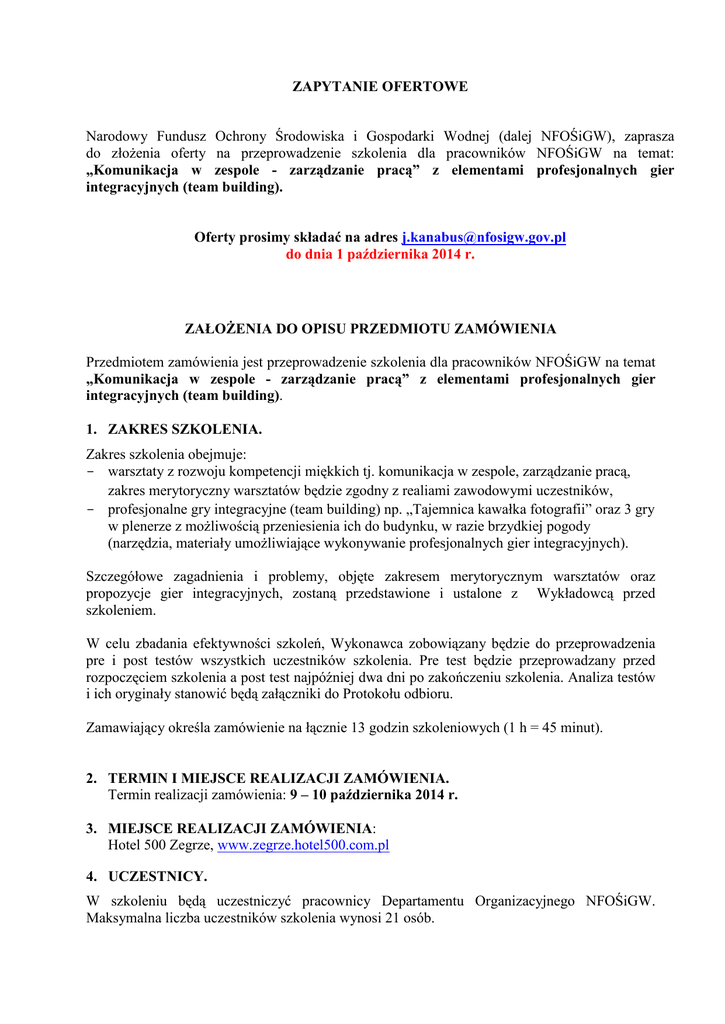 ZAPYTANIE OFERTOWE Narodowy Fundusz Ochrony Środowiska i Gospodarki Wodnej (dalej NFOŚiGW), zaprasza do złożenia oferty na przeprowadzenie szkolenia dla pracowników NFOŚiGW na temat: „Komunikacja w zespole - zarządzanie pracą” z elementami profesjonalnych gier integracyjnych (team building). Oferty prosimy składać na adres [email protected] do dnia 1 października 2014 r. ZAŁOŻENIA DO OPISU PRZEDMIOTU ZAMÓWIENIA Przedmiotem zamówienia jest przeprowadzenie szkolenia dla pracowników NFOŚiGW na temat „Komunikacja w zespole - zarządzanie pracą” z elementami profesjonalnych gier integracyjnych (team building). 1. ZAKRES SZKOLENIA. Zakres szkolenia obejmuje: - warsztaty z rozwoju kompetencji miękkich tj. komunikacja w zespole, zarządzanie pracą, zakres merytoryczny warsztatów będzie zgodny z realiami zawodowymi uczestników, - profesjonalne gry integracyjne (team building) np. „Tajemnica kawałka fotografii” oraz 3 gry w plenerze z możliwością przeniesienia ich do budynku, w razie brzydkiej pogody (narzędzia, materiały umożliwiające wykonywanie profesjonalnych gier integracyjnych). Szczegółowe zagadnienia i problemy, objęte zakresem merytorycznym warsztatów oraz propozycje gier integracyjnych, zostaną przedstawione i ustalone z Wykładowcą przed szkoleniem. W celu zbadania efektywności szkoleń, Wykonawca zobowiązany będzie do przeprowadzenia pre i post testów wszystkich uczestników szkolenia. Pre test będzie przeprowadzany przed rozpoczęciem szkolenia a post test najpóźniej dwa dni po zakończeniu szkolenia. Analiza testów i ich oryginały stanowić będą załączniki do Protokołu odbioru. Zamawiający określa zamówienie na łącznie 13 godzin szkoleniowych (1 h = 45 minut). 2. TERMIN I MIEJSCE REALIZACJI ZAMÓWIENIA. Termin realizacji zamówienia: 9 – 10 października 2014 r. 3. MIEJSCE REALIZACJI ZAMÓWIENIA: Hotel 500 Zegrze, www.zegrze.hotel500.com.pl 4. UCZESTNICY. W szkoleniu będą uczestniczyć pracownicy Departamentu Organizacyjnego NFOŚiGW. Maksymalna liczba uczestników szkolenia wynosi 21 osób. 5. TRENER / WYKŁADOWCA. 5.1. Wykładowca przeprowadził łącznie przynajmniej 3 szkolenia z elementami profesjonalnych gier integracyjnych (team building), w ciągu ostatnich 12 miesięcy od dnia otrzymania / publikacji zapytania ofertowego. 5.2. Wykładowca powinien spełniać poniższe wymagania: - charyzmatyczny, ciepły, komunikatywny, zdecydowany, elastyczny, z dużym doświadczeniem, - posiadający praktyczną znajomość warsztatu trenerskiego, a także wiedzę i doświadczenie eksperckie oraz doświadczenie praktyczne, - proponujący grupie nie tylko potrzebne wiadomości ale i całe spektrum technik, - angażujący grupę, mobilizujący do zmiany po szkoleniu, wprowadzających autorskie ćwiczenia i metody pracy, - potrafiący łączyć dobry warsztat trenerski z praktycznymi doświadczeniami zarówno uczestników, jak i własnymi, - materiał szkoleniowy przygotowany przez trenera powinien być zgodny z realiami zawodowymi uczestników. 5.3. W przypadku uzasadnionej konieczności zmiany Wykładowcy, Wykonawca zapewnia zastępstwo osoby o kwalifikacjach i doświadczeniu zawodowym nie gorszych, niż Wykładowcy zastępowanego, przedstawiając Zamawiającemu potwierdzenie jego kwalifikacji i doświadczenia. 5.4. Zamawiający dopuszcza możliwość prowadzenia warsztatów przez więcej niż jednego trenera / wykładowcę pod warunkiem, że osoby te zostały zgłoszone do prowadzenia szkolenia w ofercie i spełniają warunki udziału w postępowaniu (bez dodatkowych kosztów - cena za 1 h szkolenia bez względu na liczbę Wykładowców). 6. PROGRAM SZKOLENIA. I DZIEŃ – 09.10.2014 r. Działania Godziny od 8.30 do 19.00 8.30 Zbiórka pod siedzibą NFOŚiGW 8.45 10.30 - 12.00 (1,5) Wyjazd spod siedziby NFOŚiGW Rejestracja uczestników (zakwaterowanie w miarę możliwości) · szkolenie 12.00-12.30 Przerwa kawowa 12.30 -14.00 (1,5) · 14.00- 15.00 Przerwa obiadowa 15.00 - 16.30 (1,5) · 16.30-17.00 Przerwa kawowa 17.00 - 18.30 (1,5) · 19.00 Kolacja (opcjonalnie w formie ogniska lub grilla) 10.00 szkolenie szkolenie szkolenie 2 II DZIEŃ - 10.10.2014 r. Działania Godziny od 8.00 do 15.30 8.00-9.00 Śniadanie 9.00 - 11.00 (2) · 11.00-11.30 Przerwa kawowa 11.30 - 13.30 (2) · 13.30-14.30 Przerwa obiadowa, wykwaterowanie 14.30 Zakończenie szkolenia, wyjazd do Warszawy - pod siedzibę NFOŚiGW 15.30 Przyjazd pod siedzibę NFOŚiGW szkolenie szkolenie Zamawiający oczekuje od Wykonawcy, przed rozpoczęciem szkolenia, propozycji programu szkolenia opartego o wymienione w pkt. 1, zagadnienia wraz z propozycją czasu na poszczególne zagadnienia. Wykonawca powinien kierować się swoim doświadczeniem w doborze metod szkolenia. 7. MATERIAŁY SZKOLENIOWE. 7.1. Wykonawca przygotuje i przekaże Zamawiającemu najpóźniej na 2 dni robocze przed rozpoczęciem szkolenia jeden egzemplarz materiałów merytorycznych i reminderów (przypominaczy – specjalnie przygotowanych arkuszy zawierających najważniejsze elementy szkolenia w formie skondensowanej, w celu łatwiejszego wykorzystania ich w codziennej pracy) w formie elektronicznej do zatwierdzenia przez Zamawiającego. 7.2. Wykonawca zapewni każdemu uczestnikowi szkolenia papierową wersję merytorycznych materiałów szkoleniowych i reminderów. 7.3. Wykonawca przekaże jeden egzemplarz materiałów szkoleniowych, reminderów oraz pre i post testów w formie papierowej i elektronicznej (płyta CD) dla Zamawiającego, jako załącznik do protokołu odbioru szkolenia, które zostaną załączone do dokumentacji szkolenia. 7.4. Treść materiałów merytorycznych będzie zgodna z realiami zawodowymi uczestników. 7.5. Wykonawca poniesie pełny koszt przygotowania dokumentów określonych w ppkt. 1, 2, 3 i 4 bez dodatkowych roszczeń w stosunku do Zamawiającego związanych ze zwrotem kosztów zakupu, czy ich przygotowania. 8. ORGANIZACJA SZKOLENIA. 8.1. Zamawiający dostarczy 