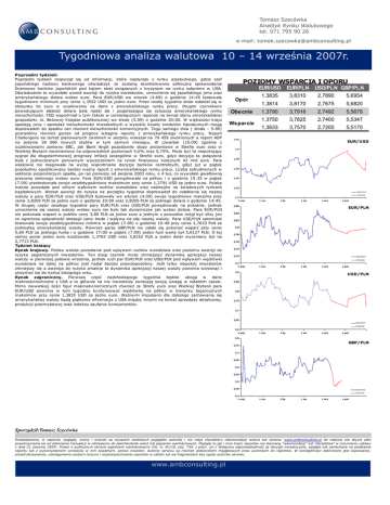 Tomasz Szecówka Analityk Rynku Walutowego tel. 071 795 90 26 e-mail: [email protected] Tygodniowa analiza walutowa 10 – 14 września 2007r. Poprzedni tydzień: Poprzedni tydzień rozpoczął się od informacji, które napłynęły z rynku azjatyckiego, gdzie szef japońskiego nadzoru bankowego oświadczył, że zostaną skontrolowane półroczne sprawozdania finansowe banków japońskich pod kątem strat związanych z kryzysem na rynku subprime w USA. Oświadczenie to wywołało wzrost awersji do ryzyka inwestorów, umocnienie się japońskiego jena oraz amerykańskiego dolara wobec euro. Para EUR/USD we wtorek (4.09) o godzinie 14:45 testowała tygodniowe minimum przy cenie 1,3552 USD za jedno euro. Przez resztę tygodnia dolar osłabiał się w stosunku do euro w oczekiwaniu na dane z amerykańskiego rynku pracy. Drugim czynnikiem powodującym słabość dolara była nadal zła i pogarszająca się sytuacja amerykańskiego rynku nieruchomości. FED wspomniał o tym fakcie w comiesięcznym raporcie na temat stanu amerykańskiej gospodarki, tz. Beżowej Księdze publikowanej we środę (5.09) o godzinie 20:00. W większości kraju spadają ceny i sprzedaż nieruchomości mieszkalnych a wysokie koszty kredytów hipotecznych mogą doprowadzić do spadku cen również nieruchomości komercyjnych. Tego samego dnia ( środa – 5.09) poznaliśmy również gorsze od prognoz wstępne raporty z amerykańskiego rynku pracy. Raport Challengera na temat planowanych zwolnień w sierpniu wskazał na 79 459 zwolnionych a raport ADP na jedynie 38 000 nowych etatów w tym samym miesiącu. W czwartek (10.09) zgodnie z oczekiwaniami zarówno EBC, jak Bank Anglii pozostawiły stopy procentowe w Strefie euro oraz w Wielkiej Brytanii niezmienione na odpowiednich poziomach 4,0% oraz 5,75%. Może być to niepokojący sygnał dla długoterminowej prognozy inflacji szczególnie w Strefie euro, gdyż decyzja ta połączona była z jednoczesnym ponownym wpuszczeniem na rynek finansowy kolejnych 42 mld euro. Para właściwie nie reagowała na wyżej wspomniane decyzje banków centralnych, gdyż już w piątek popołudniu opublikowany bardzo ważny raport z amerykańskiego rynku pracy. Liczba zatrudnionych w sektorze pozarolniczym spadła, po raz pierwszy od sierpnia 2003 roku, o 4 tys, co wywołało gwałtowną przecenę zielonego wobec euro. Para EUR/USD powędrowała na północ i o godzinie 15:35 w piątek (7.09) przetestowała swoje zeszłotygodniowe maksimum przy cenie 1,3791 USD za jedno euro. Polska waluta pozostała pod silnym wpływem ruchów eurodolara oraz nastrojów na światowych rynkach kapitałowych. Wzrost awersji do ryzyka na początku tygodnia doprowadził do osłabienia się naszej waluty a pary EUR/PLN oraz USD/PLN testowały we wtorek (4.09) swoje tygodniowe maksima przy cenie 3,8269 PLN za jedno euro o godzinie 10:00 oraz 2,8205 PLN za jednego dolara o godzinie 14:45. W drugiej części zeszłego tygodnia pary EUR/PLN oraz USD/PLN powędrowały na południe, jednak umocnienie się naszej waluty wobec euro nie było tak dynamiczne jak wobec dolara. Para EUR/PLN nie pokonała wsparć w pobliżu ceny 3,80 PLN za jedno euro a jednym z powodów mógł być silny jen co ogranicza opłacalność strategii carry trade i wpływa na siłę naszej waluty. Para USD/PLN natomiast testowała swoje zeszłotygodniowe minima w piątek (7.09) o godzinie 15:40 przy cenie 2,7633 PLN za jednostkę amerykańskiej waluty. Również parze GBP/PLN nie udało się pokonać wsparć przy cenie 5,60 PLN za jednego funta i o godzinie 17:00 w piątek (7.09) jeden funt warty był 5,6127 PLN. O tej samej porze jedno euro kosztowało 1,3763 USD oraz 3,8152 PLN a jeden dolar wyceniany był na 2,7713 PLN. Tydzień bieżący Rynek krajowy. Polska waluta pozostanie pod wpływem ruchów eurodolara oraz poziomu awersji do ryzyka zagranicznych inwestorów. Ten drugi czynnik może zmniejszyć dynamikę aprecjacji naszej waluty w pierwszej połowie września, jednak ruch par EUR/PLN oraz USD/PLN pod wpływem wędrówki eurodolara na dalej na północ jest nadal bardzo prawdopodobny. Jeśli tylko niepokój inwestorów zmniejszy się a awersja do ryzyka zmaleje to dynamika aprecjacji naszej waluty powinna wzrosnąć i utrzymać się do końca bieżącego roku. Rynek zagraniczny. Pierwsza część nadchodzącego tygodnia będzie uboga w dane makroekonomiczne z USA a to głównie na nie inwestorzy zwracają swoją uwagę w ostatnim czasie. Mimo niewielkiej ilości figur makroekonomicznych również ze Strefy euro oraz Wielkiej Brytanii para EUR/USD powinna w tym tygodniu kontynuować wędrówkę na północ w kierunku tegorocznych maksimów przy cenie 1,3835 USD za jedno euro. Ważnymi impulsami dla dalszego zachowania się amerykańskiej waluty będą piątkowe informacje z USA między innymi na temat sprzedaży detalicznej, produkcji przemysłowej oraz indeksu zaufania konsumentów. POZIOMY WSPARCIA I OPORU Opór Obe cnie Wsparcie EUR/USD EUR/PLN 1,3835 3,8310 USD/PLN GBP/PLN 2,7890 5,6954 1,3814 3,8170 2,7675 5,6820 1,3790 3,7916 2,7492 5,5678 1,3750 3,7825 2,7400 5,5347 1,3633 3,7570 2,7200 5,5170 1,42 EUR/USD 1,4 1,38 1,36 1,34 1,32 wykonanie prognoza 1,3 1 maj 1 cze 1 lip 1 sie 1 wrz 3,86 1 paź EUR/PLN 3,84 3,82 3,8 3,78 3,76 3,74 3,72 wykonanie prognoza 3,7 1 maj 1 cze 1 lip 1 sie 1 wrz 2,9 1 paź USD/PLN 2,85 2,8 2,75 2,7 2,65 wykonanie prognoza 2,6 1 maj 1 cze 1 lip 1 sie 1 wrz 1 paź 5,8 GBP/PLN 5,75 5,7 5,65 5,6 5,55 5,5 5,45 wykonanie prognoza 5,4 1 maj 1 cze 1 lip 1 sie 1 wrz 1 paź Sporządził:Tomasz Szecówka Przedstawione, w raporcie, poglądy, oceny i wnioski sa wyrazem osobistych poglądów autorów i nie maja charakteru rekomendacji autora lub serwisu www.ambconsulting.pl do nabycia lub zbycia albo powstrzymania sie od dokonania transakcji w odniesieniu do jakichkolwiek walut lub papierów wartościowych. Poglądy te jak i inne treści raportów nie stanowią "rekomendacji" lub "doradztwa" w rozumieniu ustawy z dnia