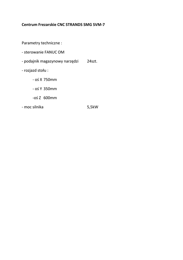 Centrum Frezarskie CNC STRANDS SMG SVM-7 Parametry techniczne : - sterowanie FANUC OM - podajnik magazynowy narzędzi 24szt. - rozjazd stołu : - oś X 750mm - oś Y 350mm -oś Z 600mm - moc silnika 5,5kW