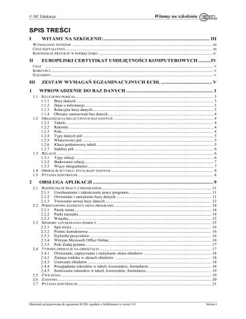 © DC Edukacja Witamy na szkoleniu SPIS TREŚCI I WITAMY NA SZKOLENIU...................................................................................... III WYMAGANIA WSTĘPNE ....................................................................................................................................... III CELE KSZTAŁCENIA ............................................................................................................................................. III KONWENCJE PRZYJĘTE W PODRĘCZNIKU ............................................................................................................. IV II EUROPEJSKI CERTYFIKAT UMIEJĘTNOŚCI KOMPUTEROWYCH ..........IV CELE ................................................................................................................................................................. V KORZYŚCI............................................................................................................................................................. V EGZAMINY............................................................................................................................................................ V III 1 ZESTAW WYMAGAŃ EGZAMINACYJNYCH ECDL ......................................... V WPROWADZENIE DO BAZ DANYCH ...................................................................... 1 1.1 KLUCZOWE POJĘCIA..................................................................................................................................... 3 1.1.1 Bazy danych .................................................................................................................................... 3 1.1.2 Dane a informacje ........................................................................................................................... 3 1.1.3 Relacyjne bazy danych.................................................................................................................... 3 1.1.4 Obszary zastosowań baz danych ..................................................................................................... 4 1.2 ORGANIZACJA RELACYJNYCH BAZ DANYCH ................................................................................................ 4 1.2.1 Tabele.............................................................................................................................................. 4 1.2.2 Rekordy........................................................................................................................................... 4 1.2.3 Pola.................................................................................................................................................. 4 1.2.4 Typy danych pól.............................................................................................................................. 5 1.2.5 Właściwości pól .............................................................................................................................. 5 1.2.6 Klucz podstawowy tabeli ................................................................................................................ 5 1.2.7 Indeksy pól ...................................................................................................................................... 6 1.3 RELACJE ...................................................................................................................................................... 6 1.3.1 Typy relacji ..................................................................................................................................... 6 1.3.2 Budowanie relacji............................................................................................................................ 7 1.3.3 Więzy integralności......................................................................................................................... 7 1.4 OPERACJE W CYKLU śYCIA BAZY DANYCH .................................................................................................. 8 1.5 PYTANIA KONTROLNE .................................................................................................................................. 8 2 OBSŁUGA APLIKACJI ................................................................................................. 9 2.1 ROZPOCZĘCIE PRACY Z PROGRAMEM ......................................................................................................... 11 2.1.1 Uruchamianie i zakończenie pracy programu ............................................................................... 11 2.1.2 Otwieranie i zamykanie bazy danych............................................................................................ 11 2.1.3 Tworzenie nowej bazy danych ...................................................................................................... 12 2.2 PODSTAWOWE ELEMENTY OKNA PROGRAMU ............................................................................................. 14 2.2.1 Pasek menu.................................................................................................................................... 14 2.2.2 Paski narzędzi................................................................................................................................ 14 2.2.3 WstąŜka ......................................................................................................................................... 15 2.3 SPOSOBY UZYSKIWANIA POMOCY .............................................................................................................. 15 2.3.1 Spis treści ...................................................................................................................................... 16 2.3.2 Pomoc kontekstowa ...................................................................................................................... 16 2.3.3 Etykie