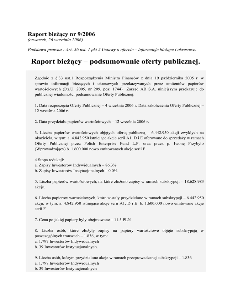Raport bieŜący nr 9/2006 (czwartek, 26 września 2006) Podstawa prawna : Art. 56 ust. 1 pkt 2 Ustawy o ofercie – informacje bieŜące i okresowe. Raport bieŜący – podsumowanie oferty publicznej. Zgodnie z §.33 ust.1 Rozporządzenia Ministra Finansów z dnia 19 października 2005 r. w sprawie informacji bieŜących i okresowych przekazywanych przez emitentów papierów wartościowych (Dz.U. 2005, nr 209, poz. 1744) Zarząd AB S.A. niniejszym przekazuje do publicznej wiadomości podsumowanie Oferty Publicznej: 1. Data rozpoczęcia Oferty Publicznej – 4 września 2006 r. Data zakończenia Oferty Publicznej – 12 września 2006 r. 2. Data przydziału papierów wartościowych – 12 września 2006 r. 3. Liczba papierów wartościowych objętych ofertą publiczną – 6.442.950 akcji zwykłych na okaziciela, w tym: a. 4.842.950 istniejące akcje serii A1, D i E oferowane do sprzedaŜy w ramach Oferty Publicznej przez Polish Enterprise Fund L.P. oraz przez p. Iwonę Przybyło (Wprowadzający) b. 1.600.000 nowo emitowanych akcje serii F 4.Stopa redukcji: a. Zapisy Inwestorów Indywidualnych – 86.3% b. Zapisy Inwestorów Instytucjonalnych – 0,0% 5. Liczba papierów wartościowych, na które złoŜono zapisy w ramach subskrypcji – 18.628.983 akcje. 6. Liczba papierów wartościowych, które zostały przydzielone w ramach subskrypcji – 6.442.950 akcji, w tym: a. 4.842.950 istniejące akcje serii A1, D i E b. 1.600.000 nowo emitowane akcje serii F 7. Cena po jakiej papiery były obejmowane – 11.5 PLN 8. Liczba osób, które złoŜyły zapisy na papiery wartościowe objęte subskrypcją w poszczególnych transzach – 1.836, w tym: a. 1.797 Inwestorów Indywidualnych b. 39 Inwestorów Instytucjonalnych. 9. Liczba osób, którym przydzielono akcje w ramach przeprowadzanej subskrypcji – 1.836 a. 1.797 Inwestorów Indywidualnych b. 39 Inwestorów Instytucjonalnych 10. Subemitenci: w dniu 24 sierpnia, Spółka i Wprowadzający zawarli umowę o subemisję inwestycyjną, w wyniku której funkcję Subemitenta inwestycyjnego pełnił Bank Austria Creditanstalt AG. Ze względu na fakt, iŜ w trakcie trwania zapisów, wszystkie oferowane w ramach Oferty Publicznej akcje zostały objęte i opłacone przez inwestorów, Subemitent nie objął Ŝadnych akcji w wyniku wykonania umowy subemisyjnej. Z tytułu zobowiązania subemisyjnego, Subemitent nie uzyskał Ŝadnego dodatkowego wynagrodzenia ponad to wymienione w pkt. 12 poniŜej. 11. Wartość przeprowadzanej Oferty Publicznej – 74.093.925 PLN brutto (przed uwzględnieniem kosztów przeprowadzenia Oferty Publicznej), w tym: a. 55.693.925,00 PLN wartość oferty sprzedaŜy istniejących akcji serii A1, D i E b. 18.400.000,00 PLN wartość subskrypcji nowo emitowanych akcji serii F 12. Łączna wartość kosztów, które zaliczono do kosztów emisji – 1.200.942,43 PLN (kwota netto) / 1.465.149,77 PLN (kwota brutto), w tym: a. Koszty przygotowania i przeprowadzenia ofe0rty (w tym wynagrodzenie Subemitenta i prowizja z tytułu sprzedaŜy akcji) – 683.857,50 PLN (kwota netto) / 834.306,15 PLN (kwota brutto) b. Koszty sporządzenia prospektu emisyjnego, z uwzględnieniem kosztów doradztwa – 345.772,93 PLN (kwota netto) / 421.842,98 PLN (kwota brutto) c. Koszty promocji oferty – 171.312,00 PLN (kwota netto) / 209.000,64 PLN (kwota brutto) WyŜej wymienione koszty dotyczą całości kosztów jakie zostały poniesione w związku z Ofertą Publiczną akcji serii F przez Emitenta. Oprócz tych kosztów, Wprowadzający ponieśli ponadto koszty prowizji z tytułu sprzedaŜy istniejących akcji serii A1, D i E. W związku z faktem, iŜ koszty te nie dotyczą Emitenta, nie zostały one uwzględnione w niniejszym podsumowaniu. Metoda rozliczenia kosztów: poniesione przez Spółkę: koszty emisji w wartości brutto akcji serii F tj. kwota 1.465.149,77 pomniejszą kapitał zapasowy. 13. Średni koszt przeprowadzenia subskrypcji na jednostkę papieru wartościowego objętego subskrypcją: 75 gr (koszt netto) / 92 gr (koszt brutto).