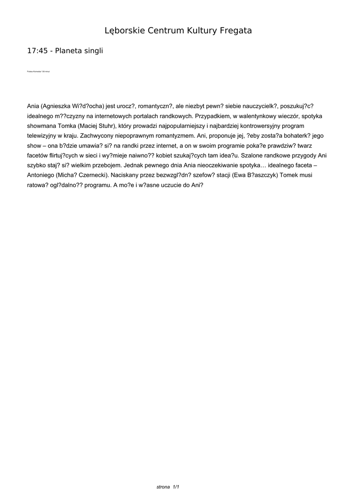 Lęborskie Centrum Kultury Fregata 17:45 - Planeta singli Polska /Komedia/ 136 minut Ania (Agnieszka Wi?d?ocha) jest urocz?, romantyczn?, ale niezbyt pewn? siebie nauczycielk?, poszukuj?c? idealnego m??czyzny na internetowych portalach randkowych. Przypadkiem, w walentynkowy wieczór, spotyka showmana Tomka (Maciej Stuhr), który prowadzi najpopularniejszy i najbardziej kontrowersyjny program telewizyjny w kraju. Zachwycony niepoprawnym romantyzmem. Ani, proponuje jej, ?eby zosta?a bohaterk? jego show – ona b?dzie umawia? si? na randki przez internet, a on w swoim programie poka?e prawdziw? twarz facetów flirtuj?cych w sieci i wy?mieje naiwno?? kobiet szukaj?cych tam idea?u. Szalone randkowe przygody Ani szybko staj? si? wielkim przebojem. Jednak pewnego dnia Ania nieoczekiwanie spotyka… idealnego faceta – Antoniego (Micha? Czernecki). Naciskany przez bezwzgl?dn? szefow? stacji (Ewa B?aszczyk) Tomek musi ratowa? ogl?dalno?? programu. A mo?e i w?asne uczucie do Ani? strona 1/1 Powered by TCPDF (www.tcpdf.org)