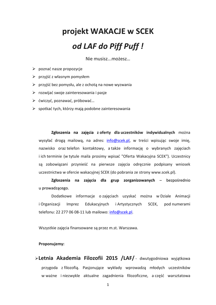 projekt WAKACJE w SCEK od LAF do Piff Puff ! Nie musisz...możesz… poznać nasze propozycje przyjść z własnym pomysłem przyjść bez pomysłu, ale z ochotą na nowe wyzwania rozwijać swoje zainteresowania i pasje ćwiczyć, poznawać, próbować… spotkać tych, którzy mają podobne zainteresowania Zgłoszenia na zajęcia z oferty dla uczestników indywidualnych można wysyłać drogą mailową, na adres: [email protected], w treści wpisując swoje imię, nazwisko oraz telefon kontaktowy, a także informację o wybranych zajęciach i ich terminie (w tytule maila prosimy wpisać "Oferta Wakacyjna SCEK"). Uczestnicy są zobowiązani przynieść na pierwsze zajęcia odręcznie podpisany wniosek uczestnictwa w ofercie wakacyjnej SCEK (do pobrania ze strony www.scek.pl). Zgłoszenia na zajęcia dla grup zorganizowanych – bezpośrednio u prowadzącego. Dodatkowe informacje o zajęciach uzyskać można w Dziale Animacji i Organizacji Imprez Edukacyjnych i Artystycznych SCEK, pod numerami telefonu: 22 277 06 08-11 lub mailowo: [email protected]. Wszystkie zajęcia finansowane są przez m.st. Warszawa. Proponujemy: Letnia Akademia Filozofii 2015 /LAF/ - dwutygodniowa wyjątkowa przygoda z filozofią. Pasjonujące wykłady wprowadzą młodych uczestników w ważne i niezwykle aktualne zagadnienia filozoficzne, a część warsztatowa 1 umożliwi wszystkim aktywny udział w dyskusji i filozoficznym dociekaniu. W tym roku zdecydowaliśmy się zorganizować Letnią Akademię Filozofii wokół tematu: Spory w filozofii. Zapewne każde czasy wymagają namysłu nad nimi. I jakkolwiek wydaje się, że filozofia swoją problematyką dotyka zagadnień ponadczasowych i powinny czy uniwersalnych, zostać wykorzystane to jednak także narzędzia do próby filozoficzne zrozumienia mogą otaczającej nas rzeczywistości w jej historycznym momencie. W trakcie Letniej Akademii Filozofii zostaną zaprezentowane niektóre z nurtów we współczesnej filozofii, jak na przykład filozofia eksperymentalna. Opiekunowie merytoryczni: Magdalena Gawin i Wojciech Kubiak Termin: 29 czerwca - 10 lipca, godz. 10.00-13.30 Więcej informacji o projekcie: http://scek.pl/aktualnosci/pozostale/letnia- akademia-filozofii-2015-zapisy-0 „Piff Puff” - głównym punktem projektu będą dwutygodniowe warsztaty, które odbędą się w Starej Prochowni SCEK w dniach 17-28 sierpnia. Przez dwa tygodnie uczestnicy będą brali udział w zajęciach dotyczących pracy nad tekstem, świadomości ciała, pantomimy, elementów walk pokazowych, tańca współczesnego, pracy nad głosem, improwizacji i wiele innych. Zajęcia prowadzą studenci, miłośnicy teatru oraz goście specjalni, których nazwiska ujawnimy wkrótce. Zwieńczeniem warsztatów będzie pokaz spektaklu, powstałego z wymiany doświadczeń prowadzących i uczestników. Opiekun merytoryczny: Monika Domagała Prowadzący: Urszula Hajdukiewicz ("reżyser") Termin castingu: 22 czerwca i 25 czerwca 2015 r. Czas trwania projektu: 17-28 sierpnia 2015 r., godz. 10:00-16:00 Miejsce: Stara Prochownia SCEK, ul. Boleść 2 Więcej informacji o projekcie: http://scek.pl/aktualnosci/pozostale/piff-puffzapraszamy-na-casting-do-udzialu-w-letnim-projekcie-teatralnym 2 ZAJĘCIA INDYWIDUALNE dla młodzieży Lp. Zajęcia Terminy i miejsce Prowadzący 29.06-3.07.2015 1. Polski Helikon współczesny - zajęcia literackie Konstanty Pieńkosz 16:30-20:00 1-29.07.2015 2. 3. Zajęcia projektowania przestrzennego Pracownia otwarta rysunku i malarstwa Kalina Downar-Zapolska pon. 12:00-16:45 śr. 11:15-13:30 Magdalena Gintowt-Juchniewicz 1.07-8.07.2015 pon., wt. i śr. 17:00-20:00; czw. i pt. 13:00-15:15 3.07.2015 i 6-8.07.2015 4. 5. Zajęcia batiku Pracownia 2 i 3 Dorota Wielkosielec-Ciapało 10:00-12:00 lub 10:00-13:00 11.07- 25.07.2015 pon. i wt. 09:00-13:00; śr. i czw. 16:30-19:30 Ewa Kunkowska 3 Opis Polski Helikon współczesny czy istnieje? Dlaczego klasycy? – poezja polska wobec tradycji i wyzwań awangardy ubiegłego wieku. Analizy, syntezy i rewizje. Zdobywanie umiejętności kształtowania formy przestrzennej, poprawnego wykorzystania właściwości użytego materiału. Zastosowanie wartości kolorystycznych do wartości przestrzennych. Nauka obserwacji rzeczywistości i tworzenia obrazu na podstawie zauważonych relacji światła, barw, proporcji. Zapoznanie kandydatów chcących uczestniczyć w zajęciach ze specyfiką techniki batiku. Nauka rysowania i malowania z natury z wykorzystaniem: martwych natur w pracowniach 2 i 3, Camera Obscura, ćwiczeń kształtujących myślenie obrazem. 6. 7. Projekt TAMATarasy Malarskie Wakacyjne Warsztaty Twórczego Pisania 24-28.08.2015 09:00 - 13:00 Ewa Kunkowska 1-3.07.2015 i 25-27.08.2015 Joanna Wenek 17:00-19:15 29.06-7.07.2015 8. Historia sztuki 9. Warsztaty w zakresie dykcji, impostacji i emisji głosu Halina Polak 14:00-16:30 Urszula Napiórkowska 25-28.08.2015 10:00-13:30 18 i 25.08.2015 10. 11. Historia Sztuki Projektujemy plakat - warsztaty projektowania graficznego Magdalena Bibińska 15:30-18:30 Praca w plenerze. Praktyczne ćwiczenie krótkich form pisemnych, niezwiązanych z formami szkolnymi. Warsztaty dla zainteresowanych historią sztuki: maturzystów, olimpijczyków, przyszłych studentów kierunków artystycznych i humanistycznych. Uruchamianie świadomości, znajomości budowy i funkcjonowania aparatu wokalnego i artykulacyjnego. Barok - epoka kontrastów. Prezentacja epoki na szerokim tle kulturowym: myśli filozoficznej, literatury, muzyki, rewolucji naukowej, obyczaju i specyfiki geograficznej. 14-16.07.2015 i 18-20.08.2015 Dariusz Skwarcan 16:00-19:00 lub 15:00-18:00 4 Przybliżenie podstawowych problemów projektowania graficznego. 10-31.08.2015 12. Warsztaty Filmowe i Fotograficzne Włodzimierz Szpak pn., wt. i śr. 16:00-19:30 Zajęcia praktyczne zarówno w salach, jak i w plenerze. Nauka sztuki fotografii i filmu. ZAJĘCIA DLA GRUP ZORGANIZOWANYCH 1. Letni klub filmowo-teatralny: zajęcia dla grup zorganizowanych 2
