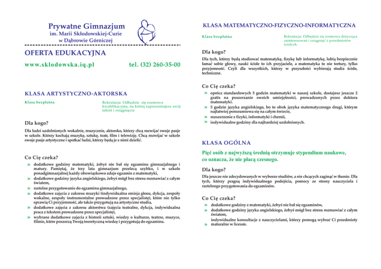 Prywatne Gimnazjum KLASA MATEMATYCZNO-FIZYCZNO-INFORMATYCZNA im. Marii Sk³odowskiej-Curie w D¹browie Górniczej Klasa bezp³atna Dla kogo? OFERTA EDUKACYJNA tel. (32) 260-35-00 www.sklodowska.iq.pl Rekrutacja: Odbêdzie siê rozmowa dotycz¹ca zainteresowañ i osi¹gniêæ z przedmiotów œcis³ych. Dla tych, którzy bêd¹ studiowaæ matematykê, fizykê lub informatykê, lubi¹ bezpiecznie ³amaæ sobie g³owy, nauki œcis³e to ich przyjaciele, a matematyka to nie tortury, tylko przyjemnoœæ. Czyli dla wszystkich, którzy w przysz³oœci wybieraj¹ studia œcis³e, techniczne. Co Ciê czeka? KLASA ARTYSTYCZNO-AKTORSKA Klasa bezp³atna Rekrutacja: Odbêdzie siê rozmowa kwalifikacyjna, na której zaprezentujesz swój talent i osi¹gniêcia Dla kogo? Dla ludzi uzdolnionych wokalnie, muzycznie, aktorsko, którzy chc¹ rozwijaæ swoje pasje w szkole. Którzy kochaj¹ muzykê, sztukê, teatr, film i telewizjê. Chc¹ rozwijaæ w szkole swoje pasje artystyczne i spotkaæ ludzi, którzy bêd¹ je z nimi dzieliæ. Co Ciê czeka? » » » » » » dodatkowe godziny matematyki, ¿ebyœ nie ba³ siê egzaminu gimnazjalnego i matury. Pamiêtaj, ¿e trzy lata gimnazjum przelec¹ szybko, i w szkole ponadgimnazjalnej ka¿dy obowi¹zkowo zdaje egzamin z matematyki, dodatkowe godziny jêzyka angielskiego, ¿ebyœ móg³ bez stresu rozmawiaæ z ca³ym œwiatem, rzetelne przygotowanie do egzaminu gimnazjalnego, dodatkowe zajêcia z zakresu muzyki (indywidualna emisja g³osu, dykcja, zespo³y wokalne, zespo³y instrumentalne prowadzone przez specjalistê), które nie tylko sprawi¹ Ci przyjemnoœæ, ale tak¿e przygotuj¹ na artystyczne studia, dodatkowe zajêcia z zakresu aktorstwa (zajêcia teatralne, dykcja, indywidualna praca z tekstem prowadzone przez specjalistê), wybrane dodatkowe zajêcia z historii sztuki, wiedzy o kulturze, teatrze, muzyce, filmie, które poszerz¹ Twoj¹ teoretyczn¹ wiedzê i przygotuj¹ do egzaminu. » » » » oprócz standardowych 5 godzin matematyki w naszej szkole, dostajesz jeszcze 2 gratis na poszerzanie swoich umiejêtnoœci, prowadzonych przez doktora matematyki. 5 godzin jêzyka angielskiego, bo to obok jêzyka matematycznego drugi, którym naj³atwiej porozumiewa siê na ca³ym œwiecie, rozszerzenie z fizyki, informatyki i chemii, indywidualne godziny dla najbardziej uzdolnionych. KLASA OGÓLNA Piêæ osób z najwy¿sz¹ œredni¹ otrzymuje stypendium naukowe, co oznacza, ¿e nie p³ac¹ czesnego. Dla kogo? Dla jeszcze nie zdecydowanych w wyborze studiów, a nie chc¹cych zagin¹æ w t³umie. Dla tych, którzy pragn¹ indywidualnego podejœcia, pomocy ze strony nauczyciela i rzetelnego przygotowania do egzaminów. Co Ciê czeka? » » » dodatkowe godziny z matematyki, ¿ebyœ nie ba³ siê egzaminów, dodatkowe godziny jêzyka angielskiego, ¿ebyœ móg³ bez stresu rozmawiaæ z ca³ym œwiatem, indywidualne konsultacje z nauczycielami, którzy pomog¹ wybraæ Ci przedmioty maturalne w liceum. Fundacja Fundacja Fundacja Fundacja Fundacja Fundacja Fundacja Fundacja Fundacja Fundacja Fundacja Fundacja Fundacja Fundacja Fundacja Fundacja Fundacja Fundacja Fundacja Fundacja Fundacja Fundacja Fundacja Fundacja Fundacja Fundacja Fundacja Fundacja Fundacja Fundacja Fundacja Fundacja Fundacja Serce SzkoleSerce SzkoleSerce SzkoleSerce SzkoleSerce SzkoleSerce SzkoleSerce SzkoleSerce SzkoleSerce SzkoleSerce SzkoleSerce SzkoleSerce SzkoleSerce SzkoleSerce SzkoleSerce SzkoleSerce SzkoleSerce SzkoleSerce SzkoleSerce SzkoleSerce SzkoleSerce SzkoleSerce SzkoleSerce SzkoleSerce SzkoleSerce SzkoleSerce SzkoleSerce SzkoleSerce SzkoleSerce SzkoleSerce SzkoleSerce SzkoleSerce SzkoleSerce Szkole Chcemy ¿ebyœ siê rozwija³ i tworzymy Ci do tego warunki! Prywatne Gimnazjum im. Marii Sk³odowskiej-Curie w D¹browie Górniczej Z myœl¹ o Tobie otwieramy w roku 2010/2011 nowe klasy: » artystyczn¹ - dla dzieci uzdolnionych wokalnie, muzycznie, aktorsko, które www.sklodowska.iq.pl tel. (32) 260-35-00 Nasza szko³a to dobry wybór! Po co wydawaæ pieni¹dze na korepetycje? Na pewno masz wa¿niejsze wydatki. Jeœli boisz siê na egzaminie matematyki, jeœli brakuje Ci godzin jêzyka angielskiego, to przyjdŸ do naszej szko³y! U nas bez problemu zdasz bardzo wysoko zewnêtrzne egzaminy bez dodatkowych wydatków! chc¹ rozwijaæ swoje pasje W szkole. Które kochaj¹ muzykê, sztukê, teatr, film i telewizjê. Chc¹ rozwijaæ w szkole swoje pasje artystyczne i spotkaæ ludzi, którzy bêd¹ je z nimi dzieliæ, » matematyczno-fizyczn¹ - dla tych, którzy lubi¹ matematykê, fizykê lub informatykê, lubi¹ bezpiecznie ³amaæ sobie g³owy, nauki œcis³e to ich przyjaciele, a matematyka to nie tortury, tylko przyjemnoœæ, czyli dla wszystkich, którzy w przysz³oœci wybieraj¹ studia œcis³e, techniczne, » ogóln¹ - z rozszerzeniami ró¿nych przedmiotów. DOBRZE WIEMY, ¯E SZKO£A TO TAK¯E PRZYJAZNA ATMOSFERA. LATA KTÓRE U NAS SPÊDZISZ MAJ¥ BYÆ DLA CIEBIE NIEZAPOMNIANE, BO ODDAJESZ NAM KAWA£EK SWOJEJ M£ODOŒCI! Dlaczego? U nas w ka¿dej klasie masz: » » » 5 godzin matematyki w tygodniu w ma³ych grupach, 5 godzin jêzyka angielskiego w tygodniu, rozszerzenia z ka¿dego wybranego przedmiotu. Model lekcji gwarancj¹ sukcesu! Specjalnie dla uczniów opracowany zosta³ przez specjalistów NOWY, skuteczny model lekcji, który pozwoli Ci w lepszy sposób przyswoiæ wiedzê. To naprawdê dzia³a! Sam sprawdŸ jak œwietnie nasi uczniowie zdaj¹ zewnêtrzne egzaminy pañstwowe! U nas uczysz siê na lekcji w szkole, w domu mo¿esz odpocz¹æ! Nie chcesz zgin¹æ w t³umie? Nasze Liceum jest dla Ciebie wymarzon¹ szko³¹! Dobrze wiemy, ¿e ka¿dy m³ody cz³owiek jest niepowtarzalny i bardzo cenimy jego indywidualnoœæ i zainteresowania. ¯eby by³o Ci u nas przyjemnie, mamy dla Ciebie: » budynki z klimatem, » aulê ze scen¹, na której ka¿dy mo¿e wyst¹piæ, » tereny zielone, boisko do siatkówki i koszykówki dla spragnionych sportu i tych, którzy przerwy lubi¹ spê