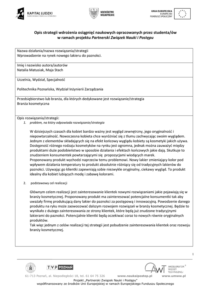 Opis strategii wdrożenia osiągnięć naukowych opracowanych przez studenta/ów w ramach projektu Partnerski Związek Nauki i Postępu Nazwa działania/nazwa rozwiązania/strategii Wprowadzenie na rynek nowego lakieru do paznokci. Imię i nazwisko autora/autorów Natalia Matusiak, Maja Stach Uczelnia, Wydział, Specjalnośd Politechnika Poznaoska, Wydział Inżynierii Zarządzania Przedsiębiorstwo lub branża, dla których dedykowane jest rozwiązanie/strategia Branża kosmetyczna Opis rozwiązania/strategii: 1. problem, na który odpowiada rozwiązanie/strategia W dzisiejszych czasach dla kobiet bardzo ważny jest wygląd zewnętrzny, jego oryginalnośd i niepowtarzalnośd. Nowoczesna kobieta chce wyróżniad się z tłumu zachwycając swoim wyglądem. Jednym z elementów składających się na efekt koocowy wyglądu kobiety są kosmetyki jakich używa. Dostępnośd różnego rodzaju kosmetyków na rynku jest ogromna, jednak można zauważyd między produktami duże podobieostwo w sposobie działania i efektach koocowych jakie dają. Skutkuje to znudzeniem konsumentek powtarzającymi się propozycjami wiodących marek. Proponowany produkt wychodzi naprzeciw temu problemowi. Nowy lakier zmieniający kolor pod wpływem działania temperatury to produkt absolutnie różniący się od tradycyjnych lakierów do paznokci. Używając go klientki zapewniają sobie niezwykle oryginalny, ciekawy wygląd. To produkt idealny dla kobiet lubiących modę i zabawę kolorami. 2. podstawowy cel realizacji Głównym celem realizacji jest zainteresowanie klientek nowymi rozwiązaniami jakie pojawiają się w branży kosmetycznej. Proponowany produkt ma zainteresowad potencjalne konsumentki tak aby uważały firmę produkującą dany lakier do paznokci za postępową i innowacyjną. Powodzenie danego produktu na ryku może zaowocowad dalszym rozwojem rozwiązao w branży kosmetycznej. Będzie to wynikało z dużego zainteresowania ze strony klientek, które będą już znudzone tradycyjnymi lakierami do paznokci. Potencjalnie klientki będą oczekiwad coraz to nowych równie oryginalnych produktów. Tak więc jednym z celów realizacji tej strategii jest pobudzenie zainteresowania klientek oraz rozwoju branży kosmetycznej. 1 61-713 Poznań, al. Niepodległości 18, tel. 61 64 75 326 www.naukaipostep.pl www.umww.pl Projekt „Partnerski Związek Nauki i Postępu” współfinansowany ze środków Unii Europejskiej w ramach Europejskiego Funduszu Społecznego Elementy innowacyjne rozwiązania/strategii (jeśli istnieją) Proponowany produkt jest bardzo innowacyjny, gdyż oferuje zupełnie nowe rozwiązanie w kwestii koloryzacji płytki paznokcia. Jest to produkt niezwykle oryginalny. Wyróżnia się spośród gamy produktów oferowanych na rynku dzięki swoim świetnym właściwością. Proponowany produkt różni się od tradycyjnych lakierów do paznokci tym, że zmienia on swój kolor po zaaplikowaniu za płytce paznokcia. Zmiana koloru wynika z wpływu temperatury na odpowiedni składniki zawarte w lakierze. Zarówno przy spadku jak i wzroście temperatury barwa lakieru zmienia się dając zdumiewający efekt. To rozwiązanie sprawi, że produkt jest unikalny i jedyny w swoim rodzaju. Idealny dla kobiet w każdym wieku, chcących zachwycad pięknymi, zadbanymi paznokciami. Produkt wyróżnia się spośród innych swoją jakością jak i właściwościami. Spodziewane korzyści dla przedsiębiorstwa wdrażającego rozwiązanie/strategię Przedsiębiorstwo, które skorzysta z możliwości wprowadzenia takiego produktu do swojej oferty ma szanse zaspokoid jedną z potrzeb konsumentów. Dzięki temu może zyskad zainteresowanie konsumentów oraz wielu klientów zainteresowanych innowacyjnym produktem. Wiążą się z tym także korzyści finansowe wynikające z wysokiego popytu na dany produkt. Przedsiębiorstwo będzie kojarzone z innowacyjnością i ciekawymi pomysłami. Niekonwencjonalne rozwiązania spodobają się każdemu kto ceni sobie oryginalnośd. Firma wzbudzi sobą zainteresowanie wprowadzając tak niepowtarzalny produkt. Może to owocowad trwałym zainteresowaniem firmą i zdobyciem popularności i zysków. Klienci prawdopodobnie będą oczekiwali dalszych nowości wprowadzonych na rynek, co będzie wiązało się z kolejnymi zyskami, ponieważ zaspokajając jedną potrzebę konsumenta pojawiają się kolejne – nowe. Produkt może stad się „wyznacznikiem mody”, tak jak niektóre produkty będące aktualnie na rynku. Łączyd się będzie to z prawdopodobnym rozwojem tj. ulepszaniem produktu będącego już na rynku i wprowadzaniu nowych Wyrażam zgodę na przetwarzanie danych osobowych zgodnie z ustawą z dnia 29 sierpnia 1997 r. o ochronie danych osobowych z póz. zmianami. Natalia Matusiak Maja Stach 2 61-713 Poznań, al. Niepodległości 18, tel. 61 64 75 326 www.naukaipostep.pl www.umww.pl Projekt „Partnerski Związek Nauki i Postępu” współfinansowany ze środków Unii Europejskiej w ramach Europejskiego Funduszu Społecznego