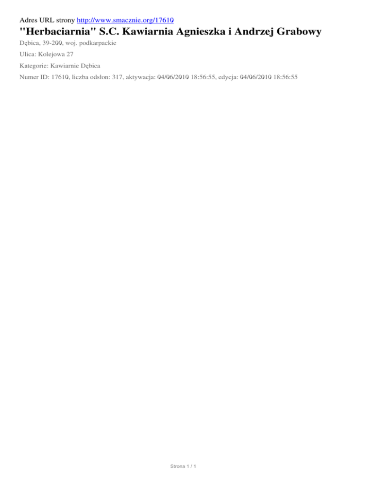 Adres URL strony http://www.smacznie.org/17610 "Herbaciarnia" S.C. Kawiarnia Agnieszka i Andrzej Grabowy Dębica, 39-200, woj. podkarpackie Ulica: Kolejowa 27 Kategorie: Kawiarnie Dębica Numer ID: 17610, liczba odsłon: 317, aktywacja: 04/06/2010 18:56:55, edycja: 04/06/2010 18:56:55 Strona 1 / 1