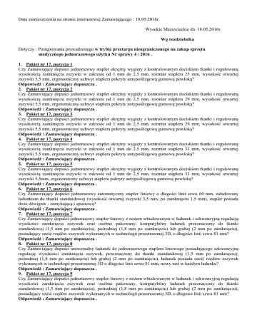 Data zamieszczenia na stronie internetowej Zamawiającego : 18.05.2016r. Wysokie Mazowieckie dn. 18.05.2016r. Wg rozdzielnika Dotyczy : Postępowania prowadzonego w trybie przetargu nieograniczonego na zakup sprzętu medycznego jednorazowego użytku Nr sprawy 4 / 2016 . 1. Pakiet nr 17, pozycja 1 Czy Zamawiający dopuści jednorazowy stapler okrężny wygięty z kontrolowanym dociskiem tkanki i regulowaną wysokością zamknięcia zszywki w zakresie od 1 mm do 2,5 mm, rozmiar staplera 25 mm, wysokość otwartej zszywki 5,5 mm, ergonomiczny uchwyt staplera pokryty antypoślizgową gumową powłoką? Odpowiedź : Zamawiający dopuszcza . 2. Pakiet nr 17, pozycja 2 Czy Zamawiający dopuści jednorazowy stapler okrężny wygięty z kontrolowanym dociskiem tkanki i regulowaną wysokością zamknięcia zszywki w zakresie od 1 mm do 2,5 mm, rozmiar staplera 29 mm, wysokość otwartej zszywki 5,5 mm, ergonomiczny uchwyt staplera pokryty antypoślizgową gumową powłoką? Odpowiedź : Zamawiający dopuszcza . 3. Pakiet nr 17, pozycja 3 Czy Zamawiający dopuści jednorazowy stapler okrężny wygięty z kontrolowanym dociskiem tkanki i regulowaną wysokością zamknięcia zszywki w zakresie od 1 mm do 2,5 mm, rozmiar staplera 29 mm, wysokość otwartej zszywki 5,5 mm, ergonomiczny uchwyt staplera pokryty antypoślizgową gumową powłoką? Odpowiedź : Zamawiający dopuszcza . 4. Pakiet nr 17, pozycja 4 Czy Zamawiający dopuści jednorazowy stapler okrężny wygięty z kontrolowanym dociskiem tkanki i regulowaną wysokością zamknięcia zszywki w zakresie od 1 mm do 2,5 mm, rozmiar staplera 33 mm, wysokość otwartej zszywki 5,5 mm, ergonomiczny uchwyt staplera pokryty antypoślizgową gumową powłoką? Odpowiedź : Zamawiający dopuszcza . 5. Pakiet nr 17, pozycja 5 Czy Zamawiający dopuści jednorazowy stapler okrężny wygięty z kontrolowanym dociskiem tkanki i regulowaną wysokością zamknięcia zszywki w zakresie od 1 mm do 2,5 mm, rozmiar staplera 33 mm, wysokość otwartej zszywki 5,5mm, ergonomiczny uchwyt staplera pokryty antypoślizgową gumową powłoką? Odpowiedź : Zamawiający dopuszcza . 6. Pakiet nr 17, pozycja 6 Czy Zamawiający dopuści jednorazowy automatyczny stapler liniowy o długości linii szwu 60 mm, załadowany ładunkiem do tkanki standardowej (wysokość otwartej zszywki 3,5 mm, po zamknięciu 1,5 mm), stapler posiada dwie dźwignie - zamykającą i spustową? Odpowiedź : Zamawiający dopuszcza . 7. Pakiet nr 17, pozycja 7 Czy Zamawiający dopuści jednorazowy stapler liniowy z nożem wbudowanym w ładunek i sekwencyjną regulacją wysokości zamknięcia zszywek oraz osobno pakowany, kompatybilny ładunek przeznaczony do tkanki standardowej (1,5 mm po zamknięciu), pośredniej (1,8 mm po zamknięciu) lub grubej (2 mm po zamknięciu), posiadający sześć rzędów zszywek wykonanych w technologii przestrzennej 3D, o długości linii szwu 81 mm? Odpowiedź : Zamawiający dopuszcza . 8. Pakiet nr 17, pozycja 8 Czy Zamawiający dopuści uniwersalny ładunek do jednorazowego staplera liniowego posiadającego sekwencyjną regulację wysokości zamknięcia zszywek, przeznaczony do tkanki standardowej (1,5 mm po zamknięciu), pośredniej (1,8 mm po zamknięciu) lub grubej (2 mm po zamknięciu), ładunek posiada sześć rzędów zszywek wykonanych w technologii przestrzennej 3D o długości linii szwu 81 mm, nowy nóż w każdym ładunku? Odpowiedź : Zamawiający dopuszcza . 9. Pakiet nr 17, pozycja 9 Czy Zamawiający dopuści jednorazowy stapler liniowy z nożem wbudowanym w ładunek i sekwencyjną regulacją wysokości zamknięcia zszywek oraz osobno pakowany, kompatybilny ładunek przeznaczony do tkanki standardowej (1,5 mm po zamknięciu), pośredniej (1,8 mm po zamknięciu) lub grubej (2 mm po zamknięciu), posiadający sześć rzędów zszywek wykonanych w technologii przestrzennej 3D, o długości linii szwu 81 mm? Odpowiedź : Zamawiający dopuszcza . 10. Pakiet nr 17, pozycja 10 Czy Zamawiający dopuści uniwersalny ładunek do jednorazowego staplera liniowego posiadającego sekwencyjną regulację wysokości zamknięcia zszywek przeznaczony do tkanki standardowej (1,5 mm po zamknięciu), pośredniej (1,8 mm po zamknięciu) lub grubej (2 mm po zamknięciu), ładunek posiada sześć rzędów zszywek wykonanych w technologii przestrzennej 3D o długości linii szwu 81 mm, nowy nóż w każdym ładunku? Odpowiedź : Zamawiający dopuszcza . 11. Pakiet nr 17, pozycja 11 Czy Zamawiający dopuści jednorazowy automatyczny stapler liniowy o długości linii szwu 60 mm, załadowany ładunkiem do tkanki grubej (wysokość otwartej zszywki 4,8 mm po zamknięciu 2,0mm), stapler posiada dwie dźwignie - zamykającą i spustową? Odpowiedź : Zamawiający dopuszcza . 12. Pakiet nr 17, pozycja 12 Czy Zamawiający dopuści jednorazowy ładunek do automatycznego staplera liniowego o długości linii szwu 60mm do tkanki standardowej (wysokość zszywki otwartej 3,5 mm, po zamknięciu 1,5 mm)? Odpowiedź : Zamawiający dopuszcza . 13. Pakiet nr 17, pozycja 13 Czy Zamawiający dopuści jednorazowy ładunek do automatycznego staplera liniowego o długości linii szwu 60mm do tkanki grubej (wysokość zszywki otwartej 4,8 mm, po zamknięciu 2,0 mm)? Odpowiedź : Zamawiający dopuszcza . 14. Pakiet nr 17, pozycja 14 Czy Zamawiający dopuści jednorazowy, bezostrzowy trokar zakończony dwoma separatorami tkanek, o średnicy odpowiednio 11, 5, 12, 12 mm i długości 100 mm każdy, trokar z przezierną kaniulą na całej długości w celu lepszej wizualizacji, kaniula rowkowana (niegwintowana) ze ściętym szczytem, trokar umożliwiający insuflację i desuflację? Odpowiedź : Zamawiający dopuszcza . 15. Pakiet nr 17, pozycja 15 Czy Zamawiający dopuści stapler laparoskopowy kilkukrotnego użytku podczas jednego zabiegu, z wbudowaną artykulacją, przeznaczony do ładunków wykonujących zespolenie o długości 45 mm lub 60 mm, długość ramienia 28 cm lub 34 cm (Zamawiający określ