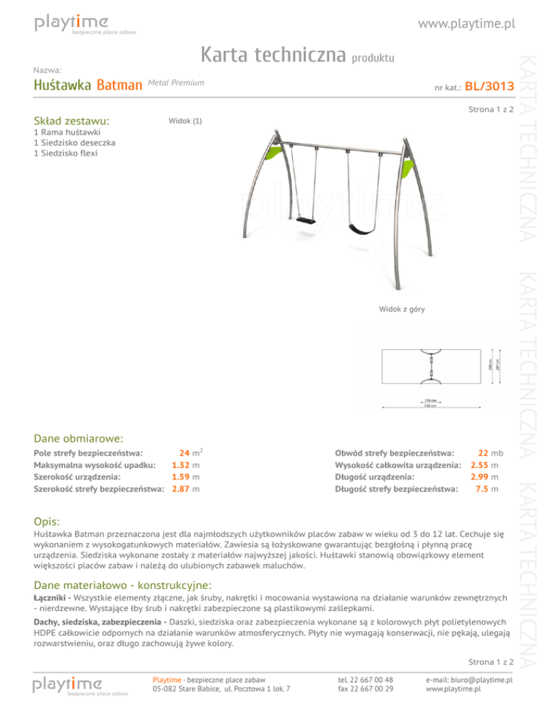 playtime www.playtime.pl bezpieczne place zabaw Huśtawka Batman Metal Premium nr kat.: BL/3013 Strona 1 z 2 Skład zestawu: Widok (1) 1 Rama huśtawki 1 Siedzisko deseczka 1 Siedzisko flexi Dane obmiarowe: Obwód strefy bezpieczeństwa: Wysokość całkowita urządzenia: Długość urządzenia: Długość strefy bezpieczeństwa: 22 mb 2.55 m 2.99 m 7.5 m Opis: Huśtawka Batman przeznaczona jest dla najmłodszych użytkowników placów zabaw w wieku od 3 do 12 lat. Cechuje się wykonaniem z wysokogatunkowych materiałów. Zawiesia są łożyskowane gwarantując bezgłośną i płynną pracę urządzenia. Siedziska wykonane zostały z materiałów najwyższej jakości. Huśtawki stanowią obowiązkowy element większości placów zabaw i należą do ulubionych zabawek maluchów. Dane materiałowo - konstrukcyjne: Łączniki - Wszystkie elementy złączne, jak śruby, nakrętki i mocowania wystawiona na działanie warunków zewnętrznych - nierdzewne. Wystające łby śrub i nakrętki zabezpieczone są plastikowymi zaślepkami. Dachy, siedziska, zabezpieczenia - Daszki, siedziska oraz zabezpieczenia wykonane są z kolorowych płyt polietylenowych HDPE całkowicie odpornych na działanie warunków atmosferycznych. Płyty nie wymagają konserwacji, nie pękają, ulegają rozwarstwieniu, oraz długo zachowują żywe kolory. Strona 1 z 2 playtime bezpieczne place zabaw Playtime - bezpieczne place zabaw 05-082 Stare Babice, ul. Pocztowa 1 lok. 7 tel. 22 667 00 48 fax 22 667 00 29 e-mail: [email protected] www.playtime.pl KARTA TECHNICZNA Pole strefy bezpieczeństwa: 24 m2 Maksymalna wysokość upadku: 1.32 m Szerokość urządzenia: 1.59 m Szerokość strefy bezpieczeństwa: 2.87 m KARTA TECHNICZNA Widok z góry KARTA TECHNICZNA Karta techniczna produktu Nazwa: playtime www.playtime.pl bezpieczne place zabaw Huśtawka Batman Metal Premium nr kat.: BL/3013 Strona 2 z 2 Stal nierdzewna - Wszystkie elementy konstrukcyjne, takie jak rury, uchwyty i poprzeczki zostały wykonane ze stali nierdzewnej. Jeśli w danym urządzeniu występują łańcuchy lub/i zjeżdżalnia to jej płyta zjazdowa oraz łańcuchy także wykonane są ze stali nierdzewnej. Zawiesia huśtawek - Zawiesia wykonane zostały ze stali nierdzewnej najwyższej jakości. Elementy mocujące są łożyskowane, by zapewnić bezszelestną i długotrwałą pracę. Siedziska huśtawek wykonane z elementów gumowych najwyższej jakości, odpornych na uszkodzenia mechaniczne i wpływ warunków atmosferycznych. KARTA TECHNICZNA Karta techniczna produktu Nazwa: KARTA TECHNICZNA playtime bezpieczne place zabaw Powered by TCPDF (www.tcpdf.org) Playtime - bezpieczne place zabaw 05-082 Stare Babice, ul. Pocztowa 1 lok. 7 tel. 22 667 00 48 fax 22 667 00 29 e-mail: [email protected] www.playtime.pl KARTA TECHNICZNA Strona 2 z 2