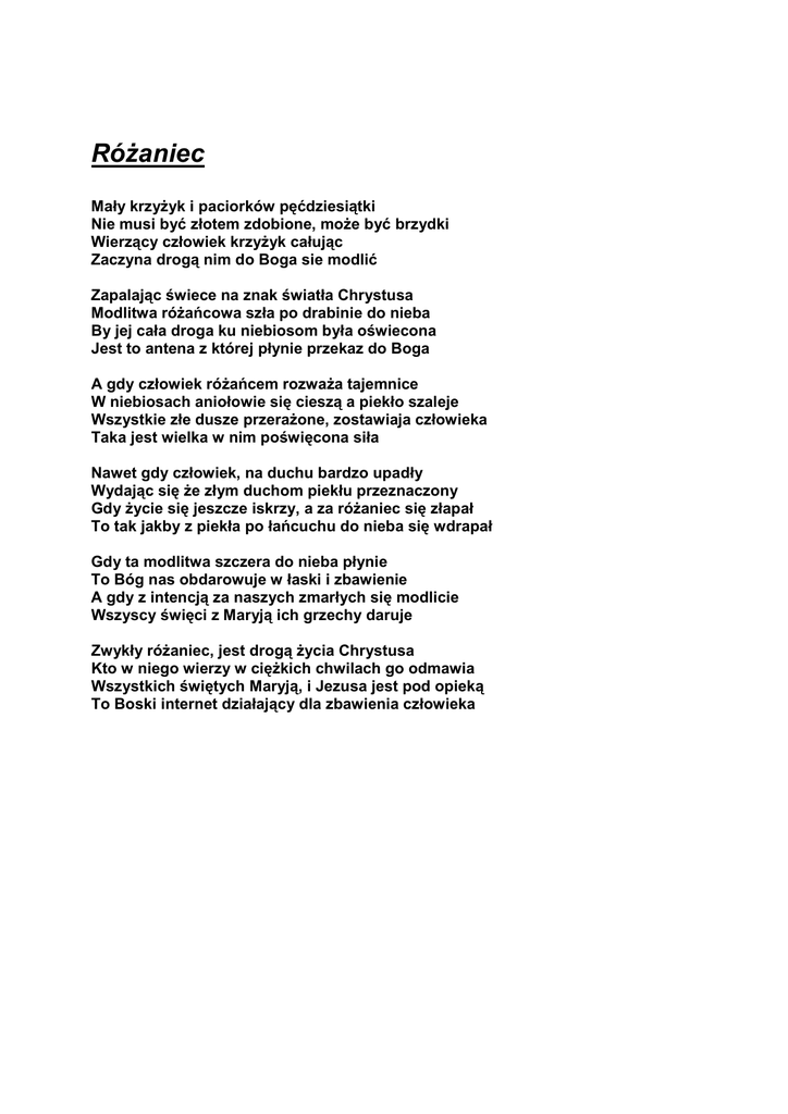 Różaniec Mały krzyżyk i paciorków pęćdziesiątki Nie musi być złotem zdobione, może być brzydki Wierzący człowiek krzyżyk całując Zaczyna drogą nim do Boga sie modlić Zapalając świece na znak światła Chrystusa Modlitwa różańcowa szła po drabinie do nieba By jej cała droga ku niebiosom była oświecona Jest to antena z której płynie przekaz do Boga A gdy człowiek różańcem rozważa tajemnice W niebiosach aniołowie się cieszą a piekło szaleje Wszystkie złe dusze przerażone, zostawiaja człowieka Taka jest wielka w nim poświęcona siła Nawet gdy człowiek, na duchu bardzo upadły Wydając się że złym duchom piekłu przeznaczony Gdy życie się jeszcze iskrzy, a za różaniec się złapał To tak jakby z piekła po łańcuchu do nieba się wdrapał Gdy ta modlitwa szczera do nieba płynie To Bóg nas obdarowuje w łaski i zbawienie A gdy z intencją za naszych zmarłych się modlicie Wszyscy święci z Maryją ich grzechy daruje Zwykły różaniec, jest drogą życia Chrystusa Kto w niego wierzy w ciężkich chwilach go odmawia Wszystkich świętych Maryją, i Jezusa jest pod opieką To Boski internet działający dla zbawienia człowieka