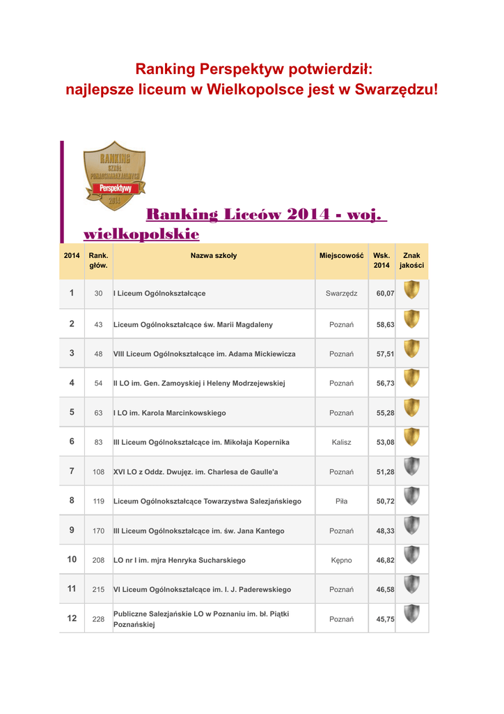 Ranking Perspektyw potwierdził: najlepsze liceum w Wielkopolsce jest w Swarzędzu! Ranking Liceów 2014 - woj. wielkopolskie 2014 Rank. głów. Nazwa szkoły 1 30 I Liceum Ogólnokształcące 2 43 3 Miejscowość Wsk. 2014 Swarzędz 60,07 Liceum Ogólnokształcące św. Marii Magdaleny Poznań 58,63 48 VIII Liceum Ogólnokształcące im. Adama Mickiewicza Poznań 57,51 4 54 II LO im. Gen. Zamoyskiej i Heleny Modrzejewskiej Poznań 56,73 5 63 I LO im. Karola Marcinkowskiego Poznań 55,28 6 83 III Liceum Ogólnokształcące im. Mikołaja Kopernika Kalisz 53,08 7 108 XVI LO z Oddz. Dwujęz. im. Charlesa de Gaulle'a Poznań 51,28 8 119 Liceum Ogólnokształcące Towarzystwa Salezjańskiego Piła 50,72 9 170 III Liceum Ogólnokształcące im. św. Jana Kantego Poznań 48,33 10 208 LO nr I im. mjra Henryka Sucharskiego Kępno 46,82 11 215 VI Liceum Ogólnokształcące im. I. J. Paderewskiego Poznań 46,58 12 228 Publiczne Salezjańskie LO w Poznaniu im. bł. Piątki Poznańskiej Poznań 45,75 Znak jakości 2014 Rank. głów. Nazwa szkoły Miejscowość Wsk. 2014 13 243 I Liceum Ogólnokształcące Leszno 45,05 14 245 PLO Zakonu Pijarów im. św. Józefa Kalasancjusza Poznań 45,02 15 246 Liceum Ogólnokształcące Sióstr Urszulanek U.Rz. Poznań 45,00 Znak jakości