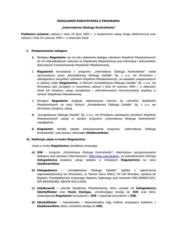 REGULAMIN KORZYSTANIA Z PROGRAMU „Internetowa Obsługa Kontrahenta” Podstawa prawna: ustawa z dnia 18 lipca 2002 r. o świadczeniu usług drogą elektroniczną oraz ustawa z dnia 24 czerwca 1994 r. o własności lokali I. Postanowienia wstępne 1. Niniejszy Regulamin ma na celu ułatwienie dostępu członkom Wspólnot Mieszkaniowych do ich indywidualnych rozliczeń ze Wspólnotą Mieszkaniową oraz informacji i dokumentów dotyczących funkcjonowania Wspólnoty Mieszkaniowej. 2. Regulamin korzystania z programu „Internetowa Obsługa Kontrahenta” został wprowadzony przez „Kompleksową Obsługę Osiedla” Sp. z o.o. we Wrocławiu i udostępniony wszystkim członkom Wspólnot Mieszkaniowych, na zasadach uregulowanych w dalszej części Regulaminu, w których „Kompleksowa Obsługa Osiedla” Sp. z o.o. we Wrocławiu jest zarządem w rozumieniu ustawy z dnia 24 czerwca 1994 r. o własności lokali lub świadczy usługi zarządzania i administrowania nieruchomością wspólną w ramach Wspólnoty Mieszkaniowej. 3. Niniejszy Regulamin znajduje zastosowanie również do członków Spółdzielni Mieszkaniowych na rzecz których „Kompleksowa Obsługa Osiedla” Sp. z o.o. we Wrocławiu świadczy usługi. 4. „Kompleksowa Obsługa Osiedla” Sp. z o.o. we Wrocławiu udostępnia członkom Wspólnot Mieszkaniowych usługi w ramach programu „Internetowa Obsługa Kontrahenta” nieodpłatnie. 5. Regulamin określa zasady funkcjonowania programu Kontrahenta” oraz prawa i obowiązki Użytkowników. „Internetowa Obsługa II. Definicje użyte w treści Regulaminu Użyte w treści Regulaminu określenia oznaczają: a) IOK – program „Internetowa Obsługa Kontrahenta”; internetowe oprogramowanie dostępne pod adresem internetowym: http://koo.com.pl/dom, za pośrednictwem którego Usługodawca świadczy usługi opisane w niniejszym Regulaminie na rzecz Użytkowników, b) Usługodawca – „Kompleksowa Obsługa Osiedla” Spółka z ograniczoną odpowiedzialnością we Wrocławiu, ul. Bulwar Ikara 29A/3, 54-130 Wrocław, wpisana do Rejestru Przedsiębiorców Krajowego Rejestru Sądowego pod numerem KRS 0000021524, NIP 8942581082, REGON 932112559, c) Użytkownik – członek Wspólnoty Mieszkaniowej, który uzyskał od Usługodawcy Identyfikator oraz Hasło Dostępu, umożliwiające dostęp do IOK oraz który zaakceptował Regulamin korzystania z IOK i rozpoczął korzystanie z IOK, d) Identyfikator – indywidualny i niepowtarzalny ciąg znaków przypisany każdemu z Użytkowników, który umożliwia dostęp do IOK, e) Hasło Dostępu – indywidualny ciąg znaków, zabezpieczający Indywidualnego Konta Użytkownika, który umożliwia dostęp do IOK, dostęp do f) Indywidualne Konto – miejsce w IOK, w którym Użytkownik udostępnia swoje dane kontaktowe oraz za pośrednictwem którego ma dostęp do wszystkich usług świadczonych w ramach IOK. III. Usługi świadczone w ramach programu Internetowa Obsługa Kontrahenta W ramach IOK Użytkownicy mają możliwość skorzystania z następujących usług: a) Dostęp do danych identyfikacyjnych i kontaktowych Wspólnoty Mieszkaniowej, b) Udostępnianie i zmiana danych kontaktowych Użytkownika, c) Dostęp do danych z odczytów liczników przypisanych do lokalu Użytkownika, d) Możliwość samodzielnego wprowadzania przez Użytkownika danych dotyczących stanu licznika, e) Dostęp do informacji o stanie rozliczeń Użytkownika w stosunku do Wspólnoty Mieszkaniowej, jak również do informacji o aktualnych wysokościach naliczeń, f) Dostęp do historii rozliczeń Użytkownika w stosunku do Wspólnoty Mieszkaniowej, obejmującej 1 rok wstecz, g) Dostęp do wszelkich ogłoszeń i informacji kierowanych przez Usługodawcę do Wspólnoty Mieszkaniowej, h) Dostęp do treści uchwał podjętych przez Wspólnotę Mieszkaniową i zamieszczonych w IOK, i) Możliwość oddania głosu przez Użytkownika w ramach podejmowania uchwały przez Wspólnotę Mieszkaniową, na zasadach opisanych w dalszej części Regulaminu. IV. Zasady i warunki korzystania z usług świadczonych w ramach programu Internetowa Obsługa Kontrahenta 1. Skorzystanie z usług w ramach IOK wymaga dostępu do sieci Internet oraz komputera PC/Tabletu z zainstalowaną przeglądarką stron internetowych. 2. Dostęp do usług w ramach IOK możliwy jest wyłącznie poprzez użycie Identyfikatora oraz Hasła Dostępu wydanego Użytkownikowi przez Usługodawcę. 3. Identyfikator oraz Hasło Dostępu wydawane jest na wniosek złożony Usługodawcy przez Użytkownika. Identyfikator oraz Hasło Dostępu wydane jest przez Usługodawcę na wskazany przez Użytkownika adres poczty elektronicznej bądź w formie pisemnej na wskazany adres. 4. W celu skorzystania z usług w ramach IOK należy wprowadzić Identyfikator oraz Hasło Dostępu w odpowiednim polu na stronie internetowej http://koo.com.pl/dom. 5. Użytkownik może zmienić wydane przez Usługodawcę Hasło Dostępu po pierwszym zalogowaniu do IOK. Nowe Hasło Dostępu powinno się składać z co najmniej 8 znaków (w tym litery oraz cyfry). Wydany przez Usługodawcę Identyfikator nie podlega późniejszej zmianie przez Użytkownika. 6. Użytkownik uzyskuje dostęp do wszystkich usług w ramach IOK po akceptacji niniejszego Regulaminu. Każdy z Użytkowników zobowiązany jest do zapoznania się i stosowania postanowień Regulaminu. Akceptacja Regulaminu następuje poprzez zaznaczenie i potwierdzenie kliknięciem właściwej opcji po uruchomieniu IOK. O każdej zmianie Regulaminu korzystania z IOK Użytkownik będzie powiadamiany przy pierwszej rejestracji na Indywidualne Konto po zmianie Regulaminu. Każdą zmianę Regulaminu Użytkownik akceptuje zgodnie ze zdaniem trzecim niniejszego punktu. V. Rezygnacja z dostępu do IOK 1. Użytkownikowi przysługuje prawo rezygnacji z dostępu do IOK. Prawo rezygnacji może być wykonane w każdym czasie. 2. Oświadczenie o rezygnacji z dostępu do IOK Użytkownik może złożyć w formie 