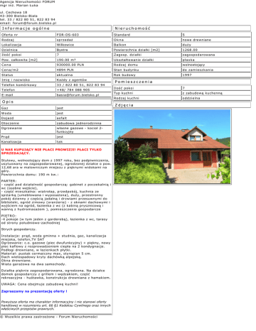 Agencja Nieruchomości FORUM mgr inż. Marian Łuka ul. Cechowa 18 43-300 Bielsko-Biała tel. 33 / 822 80 51, 822 83 94 email: [email protected] Informacje ogólne Nieruchomość Oferta nr FOR-DS-603 Standard 5 Rodzaj sprzedaż Okna nowe drewniane Lokalizacja Wilkowice Balkon duży Dzielnica Bystra Powierzchnia działki [m2] 1268.00 Ilość pokoi 7 Zagosp. działki zagospodarowana Pow. całkowita [m2] 190.00 m² Ukształtowanie działki płaska Cena 930000.00 PLN Rodzaj domu wolnostojący Cena/m2 4894 PLN Stan budynku do zamieszkania Status aktualna Rok budowy 1997 Imię i nazwisko Każdy z agentów Telefon komórkowy 33 / 822 80 51, 822 83 94 Telefon +48/ 784 088 905 E-mail [email protected] Opis Gaz jest Woda jest Dojazd asfalt Otoczenie zabudowa jednorodzinna Ogrzewanie własne gazowe - kocioł 2funkcyjny Prąd jest Kanalizacja tak U NAS KUPUJĄCY NIE PŁACI PROWIZJI! PŁACI TYLKO SPRZEDAJĄCY. Stylowy, wolnostojący dom z 1997 roku, bez podpiwniczenia, usytuowany na zagospodarowanej, ogrodzonej działce o pow. 12,68 ara w malowniczym miejscu z pięknymi widokami na góry. Powierzchnia domu: 190 m kw.: PARTER: - część pod działalność gospodarczą: gabinet z poczekalnią i wc (osobne wejście), - część mieszkalna: wiatrołap, przedpokój, kuchnia ze spiżarką (umeblowana i wyposażona), duży, przestronny pokój dzienny z częścią jadalną i drzwiami przesuwnymi do biblioteki, ogród zimowy (oranżeria) - z oknami dachowymi i wyjściem na ogród, łazienka z wc (z kabiną prysznicową i wanną z hydromasażem ), pomieszczenie gospodarcze PIĘTRO: -4 pokoje (w tym jeden z garderobą), łazienka z wc, tarasy od strony południowo-zachodniej Strych gospodarczy. Instalacje: prąd, woda gminna + studnia, gaz, kanalizacja miejska, telefon,TV SAT Ogrzewanie: c.o. gazowe (piec dwufunkcyjny) + piękny, nowy piec kaflowy z rozprowadzeniem ciepła na 2 kondygnacje. Podłogi drewniane, w łazienkach płytki. Materiał: pustak cermaiczny max, styropian 5 cm. Dach wielospadowy kryty dachówką alpejską. Okna drewniane. Wiata garażowa na dwa samochody. Działka pięknie zagospodarowana, ogrodzona. Na działce domek gospodarczy z grillem i wędzakiem, część rekreacyjna - huśtawka, konstrukcja drewniana z hamakiem. UWAGA: Cena obejmuje zabudowę kuchni! Zapraszamy na prezentację oferty ! Powyższa oferta ma charakter informacyjny i nie stanowi oferty handlowej w rozumieniu art. 66 §1 Kodeksu Cywilnego oraz innych właściwych przepisów prawnych. © Wszelkie prawa zastrzeżone - Forum Nieruchomości Pomieszczenia Ilość pokoi 7 Typ kuchni z zabudową kuchenną Rodzaj kuchni oddzielna Zdjęcia