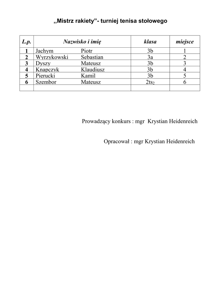 ,,Mistrz rakiety”- turniej tenisa stołowego L.p. 1 2 3 4 5 6 Nazwisko i imię Jachym Wyrzykowski Dyszy Knapczyk Pierucki Szembor Piotr Sebastian Mateusz Klaudiusz Kamil Mateusz klasa miejsce 3b 3a 3b 3b 3b 2ts2 1 2 3 4 5 6 Prowadzący konkurs : mgr Krystian Heidenreich Opracował : mgr Krystian Heidenreich