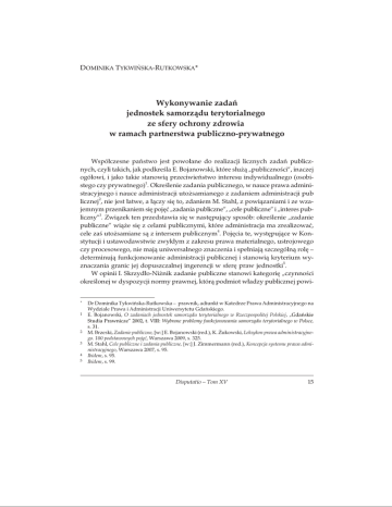 DOMINIKA TYKWIÑSKA-RUTKOWSKA* Wykonywanie zadañ jednostek samorz¹du terytorialnego ze sfery ochrony zdrowia w ramach partnerstwa publiczno-prywatnego Wspó³czesne pañstwo jest powo³ane do realizacji licznych zadañ publicznych, czyli takich, jak podkreœla E. Bojanowski, które s³u¿¹ „publicznoœci“, inaczej ogó³owi, i jako takie stanowi¹ przeciwieñstwo interesu indywidualnego (osobi1 stego czy prywatnego) . Okreœlenie zadania publicznego, w nauce prawa administracyjnego i nauce administracji uto¿samianego z zadaniem administracji pub 2 licznej , nie jest ³atwe, a ³¹czy siê to, zdaniem M. Stahl, z powi¹zaniami i ze wzajemnym przenikaniem siê pojêæ „zadania publiczne“, „cele publiczne“ i „interes pub3 liczny“ . Zwi¹zek ten przedstawia siê w nastêpuj¹cy sposób: okreœlenie „zadanie publiczne“ wi¹¿e siê z celami publicznymi, które administracja ma zrealizowaæ, 4 cele zaœ uto¿samiane s¹ z intersem publicznym . Pojêcia te, wystêpuj¹ce w Konstytucji i ustawodawstwie zwyk³ym z zakresu prawa materialnego, ustrojowego czy procesowego, nie maj¹ uniwersalnego znaczenia i spe³niaj¹ szczególn¹ rolê – determinuj¹ funkcjonowanie administracji publicznej i stanowi¹ kryterium wy5 znaczania granic jej dopuszczalnej ingerencji w sferê praw jednostki . W opinii I. Skrzyd³o-Ni¿nik zadanie publiczne stanowi kategoriê „czynnoœci okreœlonej w dyspozycji normy prawnej, któr¹ podmiot w³adzy publicznej powi- * 1 2 3 4 5 Dr Dominika Tykwiñska-Rutkowska – prawnik, adiunkt w Katedrze Prawa Administracyjnego na Wydziale Prawa i Administracji Uniwersytetu Gdañskiego. E. Bojanowski, O zadaniach jednostek samorz¹du terytorialnego w Rzeczpospolitej Polskiej, „Gdañskie Studia Prawnicze” 2002, t. VIII: Wybrane problemy funkcjonowania samorz¹du terytorialnego w Polsce, s. 31. M. Brzeski, Zadanie publiczne, [w:] E. Bojanowski (red.), K. ¯ukowski, Leksykon prawa administracyjnego. 100 podstawowych pojêæ, Warszawa 2009, s. 325. M. Stahl, Cele publiczne i zadania publiczne, [w:] J. Zimmermann (red.), Koncepcja systemu prawa administracyjnego, Warszawa 2007, s. 95. Ibidem, s. 95. Ibidem, s. 99. Disputatio – Tom XV 15 Dominika Tykwiñska-Rutkowska nien lub mo¿e podj¹æ w okolicznoœciach przewidzianych w hipotezie normy, o ile 6 dana norma zadaniowa hipotezê posiada“ . Natomiast K. Bednarzewski pod pojêciem zadania publicznego rozumie zakres prawnie dopuszczalnej dzia³alnoœci podmiotu publicznego, wykonywanej w interesie podmiotu lub podmiotów zew7 nêtrznych, znajduj¹cych siê poza struktur¹ podmiotu publicznego . Zadaniem publicznym bêdzie wiêc ka¿de zaspokajanie potrzeb wspólnoty, bez wzglêdu na to, czy jest wykonywane w drodze czynnoœci podejmowanych ka¿dorazowo 8 w interesie i na rzecz jednego podmiotu czy te¿ wiêkszej grupy osób . Z kolei M. Brzeski wskazuje, ¿e zadanie publiczne rozumie siê jako konstrukcjê pochodn¹ wobec podstawowego celu administracji publicznej, czyli zaspokajania zró¿nicowanych potrzeb grupowych i indywidualnych zwi¹zanych z ¿yciem lu9 dzi we wspólnotach . Zwróciæ tak¿e nale¿y uwagê na stanowisko prezentowane w literaturze przedmiotu przez W. Dawidowicza, który dokonywa³ rozró¿nienia zadañ i kompetencji. Autor podkreœla³, ¿e oprócz normy wyra¿onej w prawie ustrojowym, wyznaczaj¹cej zadanie, konieczna jest jeszcze norma komptencyjna, na podstawie której mo¿liwe jest podjêcie dzia³añ prowadz¹cych do realizacji za10 dania . Stosownie do przepisu art. 16 ust. 2 w zw. z art. 163 Konstytucji RP samorz¹d terytorialny uczestniczy w sprawowaniu w³adzy publicznej i wykonuje istotn¹ czêœæ zadañ publicznych, które nie zosta³y zastrze¿one przez Konstytucjê lub ustawy dla organów innych w³adz publicznych, we w³asnym imieniu i na w³asn¹ odpowiedzialnoœæ. Zgodnie z postanowieniami przepisów art. 166 ust. 1 i 2 Konstytucji wœród zadañ przypisanych jednostkom samorz¹du terytorialnego mo¿na wyró¿niæ zadania w³asne, s³u¿¹ce zaspokajaniu zbiorowych potrzeb wspólnoty samorz¹dowej, oraz inne zadania publiczne, których wykonanie mo¿e byæ zlecone jednostkom samorz¹du terytorialnego ustaw¹, gdy wynika to z uzasadnionych potrzeb pañstwa. W myœl przepisu art. 169 ust. 1 Konstytucji swoje zadania samorz¹d terytorialny wykonuje za poœrednictwem organów stanowi¹cych i wykonawczych. Konstytucyjnej zasady podzia³u zadañ na w³asne i zlecone nie naruszaj¹ postanowienia trzech ustaw samorz¹dowych: ustawy z dnia 8 marca 1990 r. o samo11 rzadzie gminnym (dalej: u.s.g.) , ustawy z dnia 5 czerwca 1998 r. o samorz¹dzie 12 powiatowym (dalej: u.s.p.) oraz ustawy z dnia 5 czerwca 1998 r. o samorz¹dzie 13 województwa (dalej: u.s.w.) , choæ wprost o zadaniach w³asnych, s³u¿¹cych za6 7 8 9 10 11 12 13 16 I. Skrzyd³o-Ni¿nik, Model ustroju samorz¹du terytorialnego w Polsce na tle zagadnieñ ustrojowego prawa administracyjnego, Warszawa 2007, s. 427. Ibidem, s. 331–332. Ibidem. M. Brzeski, Zadanie publiczne…, s. 525. Por. W. Dawidowicz, Wstêp do nauk prawno-administracyjnych, Warszawa 1974, s. 36–37, s. 57–58. Tekst jedn.: Dz.U. z 2001 r., nr 142, poz. 1591, z póŸn. zm. Tekst jedn.: Dz.U. z 2001 r., nr 142, poz. 1592, z póŸn. zm. Tekst jedn.: Dz.U. z 2001 r., nr 142, poz. 1590, z póŸn. zm. Disputatio – Tom XV Wykonywanie zadañ jednostek samorz¹du terytorialnego ze sfery ochrony zdrowia... spokajaniu zbiorowych potrzeb wspólnoty, oraz o zadaniach zleconych stanowi¹ 14 jedynie przepisy art. 7 i 8 u.s.g. . Natomiast z przepisu art. 4 ust. 1 i 3 u.s.p. wynika w³aœciwoœæ powiatu do realizacji zadañ lokalnych o charakterze ponadgminnym, które to zadania publiczne musz¹ wyraŸnie wynikaæ z przepisów ustaw prawa materialnego. Jak zauwa¿a R. Cybulska, zadania okreœlone w powo³anym przepisie s¹ zadaniami publicznymi, s³u¿¹cymi zaspokajaniu potrzeb wspólnoty samorz¹dowej, a wiêc zgodnie z przepisem art. 166 ust. 1 Kons