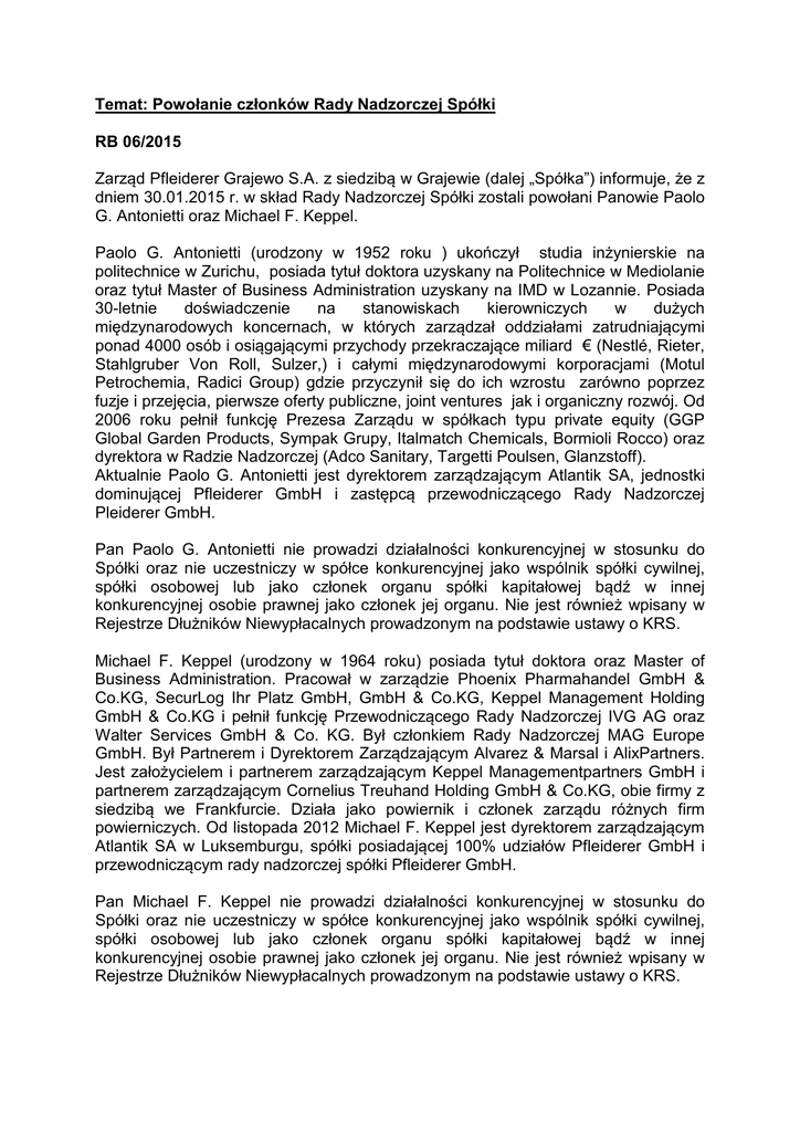 Temat: Powołanie członków Rady Nadzorczej Spółki RB 06/2015 Zarząd Pfleiderer Grajewo S.A. z siedzibą w Grajewie (dalej „Spółka”) informuje, że z dniem 30.01.2015 r. w skład Rady Nadzorczej Spółki zostali powołani Panowie Paolo G. Antonietti oraz Michael F. Keppel. Paolo G. Antonietti (urodzony w 1952 roku ) ukończył studia inżynierskie na politechnice w Zurichu, posiada tytuł doktora uzyskany na Politechnice w Mediolanie oraz tytuł Master of Business Administration uzyskany na IMD w Lozannie. Posiada 30-letnie doświadczenie na stanowiskach kierowniczych w dużych międzynarodowych koncernach, w których zarządzał oddziałami zatrudniającymi ponad 4000 osób i osiągającymi przychody przekraczające miliard € (Nestlé, Rieter, Stahlgruber Von Roll, Sulzer,) i całymi międzynarodowymi korporacjami (Motul Petrochemia, Radici Group) gdzie przyczynił się do ich wzrostu zarówno poprzez fuzje i przejęcia, pierwsze oferty publiczne, joint ventures jak i organiczny rozwój. Od 2006 roku pełnił funkcję Prezesa Zarządu w spółkach typu private equity (GGP Global Garden Products, Sympak Grupy, Italmatch Chemicals, Bormioli Rocco) oraz dyrektora w Radzie Nadzorczej (Adco Sanitary, Targetti Poulsen, Glanzstoff). Aktualnie Paolo G. Antonietti jest dyrektorem zarządzającym Atlantik SA, jednostki dominującej Pfleiderer GmbH i zastępcą przewodniczącego Rady Nadzorczej Pleiderer GmbH. Pan Paolo G. Antonietti nie prowadzi działalności konkurencyjnej w stosunku do Spółki oraz nie uczestniczy w spółce konkurencyjnej jako wspólnik spółki cywilnej, spółki osobowej lub jako członek organu spółki kapitałowej bądź w innej konkurencyjnej osobie prawnej jako członek jej organu. Nie jest również wpisany w Rejestrze Dłużników Niewypłacalnych prowadzonym na podstawie ustawy o KRS. Michael F. Keppel (urodzony w 1964 roku) posiada tytuł doktora oraz Master of Business Administration. Pracował w zarządzie Phoenix Pharmahandel GmbH & Co.KG, SecurLog Ihr Platz GmbH, GmbH & Co.KG, Keppel Management Holding GmbH & Co.KG i pełnił funkcję Przewodniczącego Rady Nadzorczej IVG AG oraz Walter Services GmbH & Co. KG. Był członkiem Rady Nadzorczej MAG Europe GmbH. Był Partnerem i Dyrektorem Zarządzającym Alvarez & Marsal i AlixPartners. Jest założycielem i partnerem zarządzającym Keppel Managementpartners GmbH i partnerem zarządzającym Cornelius Treuhand Holding GmbH & Co.KG, obie firmy z siedzibą we Frankfurcie. Działa jako powiernik i członek zarządu różnych firm powierniczych. Od listopada 2012 Michael F. Keppel jest dyrektorem zarządzającym Atlantik SA w Luksemburgu, spółki posiadającej 100% udziałów Pfleiderer GmbH i przewodniczącym rady nadzorczej spółki Pfleiderer GmbH. Pan Michael F. Keppel nie prowadzi działalności konkurencyjnej w stosunku do Spółki oraz nie uczestniczy w spółce konkurencyjnej jako wspólnik spółki cywilnej, spółki osobowej lub jako członek organu spółki kapitałowej bądź w innej konkurencyjnej osobie prawnej jako członek jej organu. Nie jest również wpisany w Rejestrze Dłużników Niewypłacalnych prowadzonym na podstawie ustawy o KRS. Raport sporządzono na podstawie § 5 ust. 1 pkt. 22 Rozporządzenia Ministra Finansów z dnia 19 lutego 2009 roku w sprawie informacji bieżących i okresowych przekazywanych przez emitentów papierów wartościowych oraz warunków uznawania za równoważne informacji wymaganych przepisami prawa państwa niebędącego państwem członkowskim (Dz. U. Nr 33, poz. 259 z późniejszymi zmianami). 30.01.2015