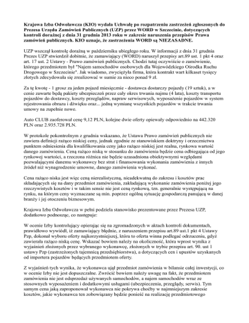 Krajowa Izba Odwoławcza (KIO) wydała Uchwałę po rozpatrzeniu zastrzeżeń zgłoszonych do Prezesa Urzędu Zamówień Publicznych (UZP) przez WORD w Szczecinie, dotyczących kontroli doraźnej z dnia 31 grudnia 2013 roku w zakresie naruszenia przepisów Prawa zamówień publicznych. KIO uznaje, że zastrzeżenia WORD są NIEZASADNE. UZP wszczął kontrolę doraźną w październiku ubiegłego roku. W informacji z dnia 31 grudnia Prezes UZP stwierdził dobitnie, że zamawiający (WORD) naruszył przepisy art.89 ust. 1 pkt 4 oraz art. 17 ust. 2 Ustawy - Prawo zamówień publicznych. Chodzi tutaj oczywiście o zamówienie, którego przedmiotem był "Najem samochodów osobowych dla Wojewódzkiego Ośrodka Ruchu Drogowego w Szczecinie". Jak wiadomo, zwyciężyła firma, która kontrakt wart kilkaset tysięcy złotych zdecydowała się zrealizować w sumie za nieco ponad 9 zł. Za tę kwotę - 1 grosz za jeden pojazd miesięcznie - dostawca dostarczy pojazdy (19 sztuk), a w cenie zawarte będą pakiety ubezpieczeń przez cały okres trwania najmu (4 lata), koszty transportu pojazdów do dostawcy, koszty przeglądów, napraw serwisowych, wyposażenie pojazdów w system rejestrowania obrazu i dźwięku oraz... jedną wymianę wszystkich pojazdów w trakcie trwania umowy na zupełnie nowe. Auto CLUB zaoferował cenę 9,12 PLN, kolejne dwie oferty opiewały odpowiednio na 442.320 PLN oraz 2.935.728 PLN. W protokole pokontrolnym z grudnia wskazano, że Ustawa Prawo zamówień publicznych nie zawiera definicji rażąco niskiej ceny, jednak zgodnie ze stanowiskiem doktryny i orzecznictwa punktem odniesienia dla kwalifikowania ceny jako rażąco niskiej jest realna, rynkowa wartość danego zamówienia. Ceną rażąco niską w stosunku do zamówienia będzie cena odbiegająca od jego rynkowej wartości, a rzeczona różnica nie będzie uzasadniona obiektywnymi względami pozwalającymi danemu wykonawcy bez strat i finansowania wykonania zamówienia z innych źródeł niż wynagrodzenie umowne, danego zamówienia wykonać. Cena rażąco niska jest więc ceną nierealistyczną, nieadekwatną do zakresu i kosztów prac składających się na dany przedmiot zamówienia, zakładającą wykonanie zamówienia poniżej jego rzeczywistych kosztów i w takim sensie nie jest ceną rynkową, tzn. generalnie występującą na rynku, na którym ceny wyznaczane są min. poprzez ogólną sytuację gospodarczą panującą w danej branży i jej otoczeniu biznesowym. Krajowa Izba Odwoławcza w pełni podziela stanowisko prezentowane przez Prezesa UZP, dodatkowo podnosząc, co następuje: W ocenie Izby kontrolujący opierając się na zgromadzonych w aktach kontroli dokumentach, prawidłowo wywiódł, iż zamawiający błędnie, z naruszeniem przepisu art.89 ust.1 pkt 4 Ustawy Pzp, dokonał wyboru oferty najkorzystniejszej, która to oferta winna podlegać odrzuceniu, gdyż zawierała rażąco niską cenę. Wskazać bowiem należy na okoliczność, która wprost wynika z wyjaśnień złożonych przez wybranego wykonawcę, złożonych w trybie przepisu art. 90. ust 1 ustawy Pzp (zastrzeżonych tajemnicą przedsiębiorstwa), a dotyczących cen i upustów uzyskanych od importera pojazdów będących przedmiotem oferty. Z wyjaśnień tych wynika, że wykonawca ujął przedmiot zamówienia w bilansie całej inwestycji, co w ocenie Izby nie jest dopuszczalne. Zwrócić bowiem należy uwagę na fakt, że przedmiotem zamówienia nie jest odsprzedaż używanych samochodów, a najem samochodów wraz ze stosownych wyposażeniem i dodatkowymi usługami (ubezpieczenia, przeglądy, serwis). Tym samym cena jaką zaproponował wykonawca nie pokrywa choćby w najmniejszym zakresie kosztów, jakie wykonawca ten zobowiązany będzie ponieść na realizację przedmiotowego zamówienia, nie mówiąc już o zysku, który nie jest możliwy do osiągnięcia za cenę przedstawioną w ofercie. Dla przykładu podać można chociażby element dotyczący kosztów ubezpieczenia, gdzie wykonawca w wyjaśnieniach podał wartość, która nie zostanie pokryta z ceny ofertowej. Wartości uboczne uzyskiwane przez pośredników mogą odnosić się do realizacji całej inwestycji (mogą stanowić wewnętrzną strategię marketingową firmy), nie mogą zaś stanowić podstawy do wyliczenia ceny ofertowej, która musi być skalkulowana w taki sposób, aby odpowiadała realnie ponoszonym kosztom w danym zamówieniu, z założeniem osiągnięcia realnego zysku. W zakresie zarzutu dotyczącego naruszenia przez zamawiającego przepisu art.17 ust. 2 Ustawy Pzp, Izba w pełni podziela argumentację kontrolującego. Zamawiającemu, w tym przypadku WORD pozostaje jeszcze droga odwołania się za pośrednictwem prezesa KIO do Sądu Okręgowego w Szczecinie. Z naszych informacji wynika, że gdyby to nastąpiło, realnym terminem wyznaczenia rozprawy jest czas do trzech miesięcy. W opinii prawników już na pierwszym posiedzeniu może zapaść wyrok, o ile nie pojawiłby się dodatkowy materiał dowodowy ze strony zamawiającego. Trudno jednak oczekiwać, by po dowodach przedstawionych kontrolerom UZP i w odwołaniu do KIO pojawiły się nowe, istotne fakty przemawiające na korzyść zamawiającego. Na podstawie Art. 146 ust. 6 ustawy Prawo Zamówień Publicznych prezesowi UZP przysługuje prawo wystąpienia do Sądu o unieważnienie umowy w przypadku dokonania przez zamawiającego czynności lub zaniechania dokonania czynności z naruszeniem przepisu ustawy, które miało lub mogło mieć wpływ na wynik postępowania. Ewentualne postanowienie Sądu Okręgowego będzie ostatecznym. Jeżeli będzie niekorzystne dla zamawiającego (WORD), prawdopodobnie rozstrzygnięcie przetargu zostanie unieważnione. LS