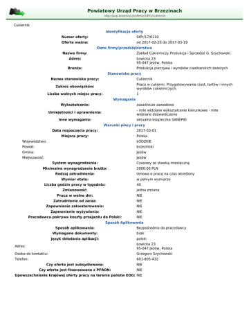 Powiatowy Urząd Pracy w Brzezinach http://pup-brzeziny.pl/oferta/1891/cukiernik Cukiernik Identyfikacja oferty Numer oferty: StPr/17/0110 Oferta ważna: od 2017-02-20 do 2017-03-19 Dane firmy/przedsiębiorstwa Nazwa firmy: Zakład Cukierniczy Produkcja i Sprzedaż G. Szychowski Adres: Łowicka 23 95-047 Jeżów, Polska Branża: Produkcja pieczywa i wyrobów ciastkarskich świeżych Stanowisko pracy Nazwa stanowiska pracy: Cukiernik Praca w cukierni. Przygotowywanie ciast, tortów i innych wyrobów cukierniczych. Zakres obowiązków: Liczba wolnych miejsc pracy: 1 Wymagania Wykształcenie: zasadnicze zawodowe - mile widziane wykształcenie kierunkowe - mile widziane dośwaidczenie Umiejętności i uprawnienia: Inne wymagania: aktualna książeczka SANEPID Warunki płacy i pracy Data rozpoczęcia pracy: 2017-03-01 Miejsce pracy: Polska Województwo: ŁÓDZKIE Powiat: brzeziński Gmina: Jeżów Miejscowość: Jeżów System wynagrodzenia: Czasowy ze stawką miesięczną Minimalne wynagrodzenie brutto: Rodzaj zatrudnienia: 2000.00 PLN Umowa o pracę na czas określony Wymiar etatu: w pełnym wymiarze Liczba godzin pracy w tygodniu: Zmianowość: 40 jedna zmiana Praca w wolne dni: NIE Zatrudnienie od zaraz: NIE Zapewnienie zakwaterowania: NIE Zapewnienie wyżywienia: NIE Pracodawca pokrywa koszty przejazdu do Polski: NIE Sposób Aplikowania Sposób aplikowania: Bezpośrednio do pracodawcy Wymagane dokumenty: brak Język składania aplikacji: polski Adres: Łowicka 23 95-047 Jeżów, Polska Osoba do kontaktu: Grzegorz Szychowski Telefon: 601-805-432 Czy oferta jest subsydiowana: NIE Czy oferta jest finansowana z PFRON: NIE Upowszechnienie krajowej oferty pracy na terenie państw EOG: NIE