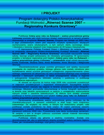 I PROJEKT Program dotacyjny Polsko-Amerykańskiej Fundacji Wolności „Równać Szanse 2007 – Regionalny Konkurs Grantowy” Publikacja Cztery pory roku na Żuławach – walory przyrodnicze gminy Lichnowy powstała jako efekt końcowy działań realizowanych w ramach projektu dotowanego w programie Równać Szanse. Program ten istnieje od 2001 roku, a jego podstawowym celem jest wsparcie inicjatyw społecznych, służących wyrównywaniu szans edukacyjnych, a tym samym startu życiowego dzieci i młodzieży z terenów wiejskich oraz miejscowości do 20 tysięcy mieszkańców. Z zaproszenia Polskiej Fundacji Dzieci i Młodzieży do wzięcia udziału w programie dotacyjnym Polsko-Amerykańskiej Fundacji Wolności „Równać Szanse 2007 – Regionalny Konkurs Grantowy” skorzystali nauczyciele naszej szkoły, tworząc projekt adresowany do młodzieży gimnazjalnej. W opracowaniu projektu o tematyce regionalnej pod hasłem „Cztery pory roku na Żuławach – walory przyrodnicze gminy Lichnowy” – przewodnik wzięli udział nauczyciele: Emilia Dzienniak, Bożena Dera, Anna Borawska, Anna Skorupa i Małgorzata Skorupa. Dwudziestoosobowa grupa uczniów gimnazjum pod opieką nauczycieli przystąpiła do realizacji projektu, którego główne cele zostały określone jako kształtowanie wśród uczniów gimnazjum umiejętności zagospodarowania czasu wolnego, wspieranie ich aktywności na rzecz środowiska lokalnego oraz rozwijanie talentów i twórczych pomysłów, a także propagowanie wiedzy o regionie i wzbogacenie księgozbioru biblioteki szkolnej i publicznej o publikację o charakterze regionalnym. W okresie od stycznia do końca maja 2008 roku uczniowie uczestniczyli w zajęciach pozalekcyjnych i wyjazdach edukacyjnych. Szczególnie dużym zainteresowaniem cieszyły się zajęcia w terenie prowadzone przez fotografa i ornitologa. Młodzież gromadziła dokumentację w formie fotografii wykonanych w terenie oraz tekstów opracowanych w oparciu o umiejętności wykorzystania różnych źródeł z zasobów bibliotecznych. W efekcie tych działań powstała publikacja w formie przewodnika pod tytułem Cztery pory roku na Żuławach – walory przyrodnicze gminy Lichnowy. Opracowanie przedstawia walory przyrodnicze gminy Lichnowy na tle charakterystycznych, a zarazem unikalnych w skali kraju, cech krajobrazu żuławskiego. Ze względu na okres, w którym był realizowany projekt, cała publikacja została podzielona na dwie części. W części pierwszej zawarto opracowany i poparty dokumentacją fotograficzną materiał, zgromadzony w pierwszym półroczu 2008 roku. Przewidziana była także kontynuacja zamierzeń. W związku z tym w drugim półroczu uczniowie zebrali materiał stanowiący uzupełnienie przewodnika. Publikacja składa się głównie z siedmiu rozdziałów. Zostały one skonstruowane tak, aby w optymalnym stopniu przybliżyć walory zarówno regionu Żuław, jak i środowiska lokalnego, czyli gminy Lichnowy. Wydanie przez Urząd Gminy w Lichnowach publikacji Cztery pory roku na Żuławach – walory przyrodnicze gminy Lichnowy przyniosło młodzieży oraz wszystkim, mającym wkład w jej powstanie, wiele satysfakcji. Uczniowie gimnazjum pozostawili po sobie trwały ślad, świadczący o ich aktywnym udziale w życiu społecznym, natomiast środowisko lokalne zyskało opracowanie, które trafi do zbiorów bibliotecznych i przyczyni się do zaspokojenia zapotrzebowań czytelniczych na źródła o tematyce regionalnej. CZTERY PORY ROKU NA ŻUŁAWACH WALORY PRZYRODNICZE GMINY LICHNOWY II PROJEKT Za rękę z Einsteinem : Edycja II Celem projektu jest rozwijanie umiejętności uczniów gimnazjów wiejskich w zakresie kompetencji kluczowych w przedmiotach matematyka, fizyka, chemia i język obcy oraz technologii informacyjno-komunikacyjnych (ICT). Projekt skierowany jest również do nauczycieli i szkół co stanowi integralną całość, gwarantującą powodzenie realizacji założeń projektu. Zaangażowane są trzy uczelnie wyższe: Politechnika Gdańska jako lider projektu oraz partnerzy Uniwersytet Technologiczno-Przyrodniczy w Bydgoszczy i Uniwersytet Warmińsko-Mazurski w Olsztynie. Ponadto jako partner projektu bierze udział firma Betacom S. A. w Warszawie. Zajęcia Wycieczka : „Z Pomorza do Torunia” Wycieczka do Olsztyna III PROJEKT Rozwój przez kompetencje Program Operacyjny Kapitał Ludzki 2007-2013 „Człowiek - Najlepsza Inwestycja” W projekcie udział biorą uczniowie klas pierwszych gimnazjum Główny cel projektu Celem głównym projektu jest: Rozwój kompetencji z nauk matematyczno – i przedsiębiorczości u 10 uczniów stanowiących zespół poziomie dającym im odpowiednie przygotowanie do w obszarze edukacji związanej z matematyką i przedsiębiorczością . przyrodniczych projektowy, na dalszej nauki przyrodą oraz Cele szczegółowe powinny uwzględnić Rozwój zainteresowań tematyką matematyczno – przyrodniczą i przedsiębiorczości u 10 uczniów stanowiących zespół projektowy; pogłębienie i poszerzenie wiedzy merytorycznej, dotyczącej realizowanego tematu; nabycie umiejętności pracy zespołowej; rozwój doświadczenia w podejmowaniu decyzji; nabycie umiejętności związanych z tworzeniem prezentacji wyników projektu. IV PROJEKT „Edukacja wczesnoszkolna bez porażek – wyrównywanie szans edukacyjno – rozwojowych uczniów klas I – III szkół podstawowych Gminy Lichnowy” Wszystkie projekty są współfinansowane przez Unię Europejską w ramach europejskiego funduszu społecznego.