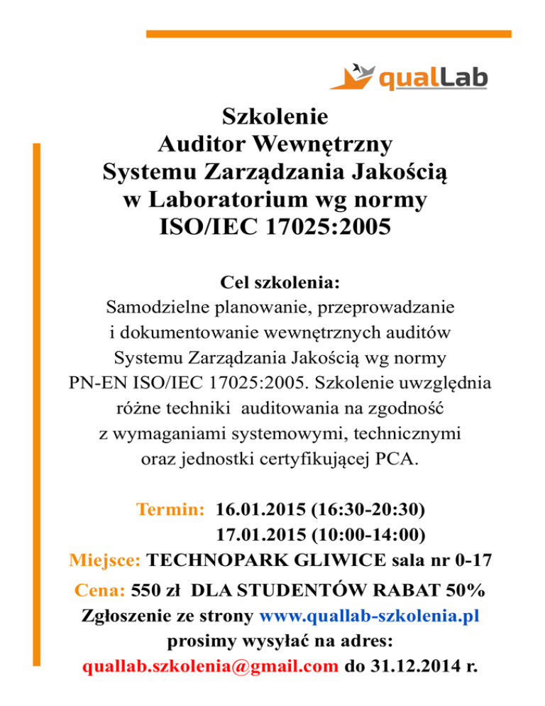 Szkolenie Auditor Wewnętrzny Systemu Zarządzania Jakością w Laboratorium wg normy ISO/IEC 17025:2005 Cel szkolenia: Samodzielne planowanie, przeprowadzanie i dokumentowanie wewnętrznych auditów Systemu Zarządzania Jakością wg normy PN-EN ISO/IEC 17025:2005. Szkolenie uwzględnia różne techniki auditowania na zgodność z wymaganiami systemowymi, technicznymi oraz jednostki certyfikującej PCA. Termin: 16.01.2015 (16:30-20:30) 17.01.2015 (10:00-14:00) Miejsce: TECHNOPARK GLIWICE sala nr 0-17 Cena: 550 zł DLA STUDENTÓW RABAT 50% Zgłoszenie ze strony www.quallab-szkolenia.pl prosimy wysyłać na adres: [email protected] do 31.12.2014 r.