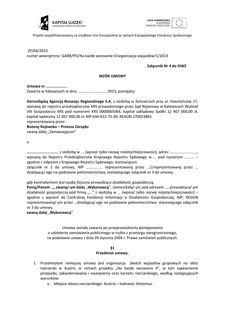 Projekt współfinansowany ze środków Unii Europejskiej w ramach Europejskiego Funduszu Społecznego ZP/04/2013 numer wewnętrzny: GARR/PIS/Na każde wezwanie II/organizacja wyjazdów/1/2013 Załącznik Nr 4 do SIWZ WZÓR UMOWY Umowa nr …………………. Zawarta w Katowicach w dniu ………………………… 2013, pomiędzy: Górnośląską Agencją Rozwoju Regionalnego S.A. z siedzibą w Katowicach przy ul. Powstańców 17, wpisaną do rejestru przedsiębiorców KRS prowadzonego przez Sąd Rejonowy w Katowicach Wydział VIII Gospodarczy KRS pod numerem KRS 0000065064, kapitał zakładowy Spółki 12 467 000,00 zł, kapitał wpłacony 12 467 000,00 zł, NIP 634-012-75-30, REGON 270023865 reprezentowaną przez: Bożenę Rojewska – Prezesa Zarządu zwaną dalej „Zamawiającym” a ………………………….. z siedzibą w ... (wpisać tylko nazwę miasta/miejscowości), adres: ………………………., wpisaną do Rejestru Przedsiębiorców Krajowego Rejestru Sądowego w … pod numerem ………. – zgodnie z odpisem z Krajowego Rejestru Sądowego, stanowiącym załącznik nr 2 do umowy, NIP …………….. reprezentowaną przez ...1/reprezentowaną przez … działającą/-ego na podstawie pełnomocnictwa, stanowiącego załącznik nr 3 do umowy, gdy kontrahentem jest osoba fizyczna prowadząca działalność gospodarczą: Panią/Panem …, zwaną/-ym dalej „Wykonawcą”, zamieszkałą/-ym pod adresem …, prowadząca/-ym działalność gospodarczą pod firmą „…” z siedzibą w … (wpisać tylko nazwę miasta/miejscowości) – zgodnie z wpisem do Centralnej Ewidencji Informacji o Działalności Gospodarczej, NIP, REGON reprezentowaną/-ym przez …działającą/-ego na podstawie pełnomocnictwa, stanowiącego załącznik nr 3 do umowy, zwaną dalej „Wykonawcą” Umowa została zawarta po przeprowadzeniu postępowania o udzielenie zamówienia publicznego w trybie z przetargu nieograniczonego, na podstawie ustawy z dnia 29 stycznia 2004 r. Prawo zamówień publicznych. §1 Przedmiot umowy. 1. Przedmiotem niniejszej umowy jest organizacja dwóch wyjazdów grupowych na obóz narciarski w Austrii, w ramach projektu „Na każde wezwanie II”, w tym zapewnienie przejazdu, zakwaterowania i wyżywienia oraz karnetu narciarskiego, według następujących warunków: a. Miejsce obozu narciarskiego: Austria – lodowiec Hintertux. Projekt współfinansowany ze środków Unii Europejskiej w ramach Europejskiego Funduszu Społecznego b. W obozach uczestniczyć będą dwie grupy liczące po 17 osób każda – łączna liczba uczestników wyniesie 34 osoby; c. Zamawiający zastrzega sobie możliwość zmiany liczby uczestników - maksymalnie o 3 osoby od liczby wyjściowej podanej w ust. 1a niniejszego paragrafu, o czym Wykonawca zostanie powiadomiony najpóźniej na 48 godzin przed planowanym terminem wyjazdu. Dopuszcza się również możliwość zmiany liczby uczestników pomiędzy obydwoma grupami (zmniejszenie liczby uczestników jednej grupy, a zwiększenie drugiej). W przypadku zmiany liczby uczestników koszt wyjazdu wzrośnie bądź ulegnie zmniejszeniu, według ceny przedstawionej w ofercie, proporcjonalnie do liczby uczestników ostatecznie biorących udział w wyjeździe. 2. Przedmiot zamówienia obejmuje w szczególności: a. Zapewnienie zakwaterowania dla uczestników wyjazdu, w apartamentach 2/3/4osobowych o standardzie min. 3-gwiazdkowym wg. klasyfikacji krajowej, z łazienką oraz aneksem kuchennym; każdy apartament wyposażony w TV; położenie apartamentów nie dalej niż w odległości 10 km od dolnej stacji kolejki na lodowiec Hintertux; w cenie należy skalkulować ręczniki i bieliznę pościelową, opłatę klimatyczną, końcowe sprzątanie, dostęp do Internetu, narciarnia, opcjonalnie: możliwość korzystania z basenu/sauny/spa/. Pobyt obejmuje pięć noclegów; od soboty do czwartku (wyjazd z Austrii w czwartek w godzinach popołudniowych). b. Sfinansowanie kosztów wyżywienia uczestników w trakcie pobytu, poprzez zakup artykułów spożywczych dla uczestników wyjazdów, według załączonej specyfikacji. c. Zapewnienie przejazdu (transportu autokarowego) na miejsce i z powrotem, wraz z przewozem bagażu, produktów spożywczych oraz sprzętu narciarskiego (max. 2 pary nart na osobę). Zapewnienie uczestnikom wyjazdu możliwości przewozów autokarem na miejscu: dowóz pod dolną stację kolejki rano i odbiór o godz. 16.00. Autokar klasy LUX z rozkładanymi siedzeniami, klimatyzacją, TV i DVD, posiadający ubezpieczenie OC, NNW oraz aktualne badania techniczne, spełniający wymogi bezpieczeństwa zgodnie z przepisami o transporcie drogowym, obsługiwany przez kierowców posiadających odpowiednie uprawnienia. W przypadku awarii lub wypadku pojazdu w trakcie świadczenia usługi, Wykonawca zobowiązany jest do zapewnienia, w możliwie najkrótszym czasie transportu zastępczego do miejsca docelowego. d. Zapewnienie uczestnikom wyjazdu całodziennego karnetu narciarskiego na 5 dni, obejmującego wszystkie trasy dostępne na lodowcu Hintertux. e. Współpracę z Zamawiającym w ramach organizacji wyjazdów, będących przedmiotem zamówienia. f. Ochronę danych osobowych na zasadach określonych w umowie powierzenia przetwarzania danych osobowych, stanowiącej załącznik do SIWZ. 3. Przedmiot zamówienia służy realizacji projektu „Na każde wezwanie II”, współfinansowanego ze środków Unii Europejskiej w ramach Europejskiego Funduszu Społecznego, Priorytet VIII wszystkich, Działanie 8.1.1 Wspieranie rozwoju kwalifikacji zawodowych i doradztwo dla przedsiębiorstw. Projekt współfinansowany ze środków Unii Europejskiej w ramach Europejskiego Funduszu Społecznego §2 Termin wykonania przedmiotu umowy. 1. Wyjazdy zostaną przeprowadzone w następujących terminach: 1-5.12.2013 oraz 812.12.2013 (wyjazd poprzedniego dnia): i. planowane terminy wyjazdu z Polski: odpowiednio 30 listopada oraz 7 grudnia 2013, parking prz