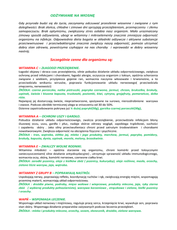 ODŻYWIANIE NA WIOSNĘ Gdy przyroda budzi się do życia, zaczynamy odczuwać przesilenie wiosenne i związane z rym dolegliwości. Brak słońca, chłodne i zimowe dni sprzyjają przeziębieniom, przemęczeniu i złemu samopoczuciu. Brak optymizmu, zwiększony stres osłabia nasz organizm. Mało urozmaicony zimowy sposób odżywiania, ubogi w witaminy i mikroelementy znacznie zmniejsza odporność organizmu na infekcje. Odpowiednia dieta bogata w składniki odżywcze i aktywne substancje przeciwwirusowe i przeciwbakteryjne znacznie zwiększy naszą odporność, pomoże utrzymać dobry stan zdrowia, powstrzyma czyhające na nas choroby i wprowadzi w dobry wiosenny nastrój. Szczególnie cenne dla organizmu są: WITAMINA C – ZŁAGODZI PRZEZIĘBIENIE. Łagodzi objawy i skraca czas przeziębienia, silnie pobudza działanie układu odpornościowego, zwiększa ochronę przed infekcjami i chorobami, łagodzi alergie, oczyszcza organizm z toksyn, opóźnia schorzenia związane z wiekiem, przyśpiesza gojenie ran, wzmacnia naczynia włosowate i krwionośne, a to przeciwdziała wnikaniu wirusów, poprawia funkcjonowanie układu nerwowego( przeciwdziała zmęczeniu, nerwowości) ŹRÓDŁA: czarna porzeczka, natka pietruszki, papryka czerwona, jarmuż, chrzan, brukselka, brokuły, szpinak, świeża i kiszona kapusta, truskawki, poziomki, kiwi, cytryna, grejpfruty, pomarańcze, dzika róża. Najwięcej jej dostarczają świeże, nieprzetworzone, spożywane na surowo, nierozdrobnione warzywa i owoce. Podczas obróbki termicznej ulega w zniszczeniu od 30 do 50%. Dzienne zapotrzebowanie pokrywa już ¼ dużej papryki(50g), garstka czarnej porzeczki(30g), WITAMINA A – OCHRONI USZY I GARDŁO. Pobudza działanie układu odpornościowego, zwalcza przeziębienie, przeciwdziała infekcjom błony śluzowej oczu, uszu, gardła i płuc, nadaje skórze zdrowy wygląd, zapobiega trądzikowi, suchości i zapaleniu skóry . Jako silny przeciwutleniacz chroni przed zatrutym środowiskiem i chorobami nowotworowymi. Zwiększa odporność na obciążenia fizyczne i psychiczne. ŹRÓDŁA : tran, wątroba, żółtko jaj, mleko i jego produkty, marchew, jarmuż, papryka, pomidory, brokuły, kapusta, dynia, szpinak, morele, melony, brzoskwinie. WITAMINA E – ZWALCZY WOLNE RODNIKI. Witamina młodości – opóźnia starzenie się organizmu, chroni komórki przed toksycznymi zanieczyszczeniami( silne działanie antyoksydacyjne) , utrzymuje sprawność układu immunologicznego, wzmacnia oczy, skórę, komórki nerwowe, czerwone ciałka krwi. ŹRÓDŁA: zarodki pszenicy, oleje z kiełków zbóż ( pszenicy, kukurydzy), oleje roślinne, masło, orzechy, zielone liście warzyw, jaja, wątroba. WITAMINY Z GRUPY B – POPRAWIAJĄ NASTRÓJ. Uspokajają nerwy, poprawiają refleks, koordynację ruchów i rąk, zwiększają energię mięśni, wspomagają przeminę materii, wzmacniają układ odpornościowy. ŹRÓDŁA : drożdże piwne, podroby, mięso wołowe i wieprzowe, produkty mleczne, jaja, ryby ziarna zbóż ( wybieraj produkty pełnoziarniste), warzywa korzeniowe , strączkowe i zielone, kiełki pszenicy i orzechy. WAPŃ – WSPOMAGA LECZENIE. Wspomaga układ nerwowy i mięśniowy, reguluje pracę serca, krzepnięcie krwi, wywołuje sen, poprawia stan skóry. Wspomaga działanie preparatów zażywanych podczas leczenia przeziębień. ŹRÓDŁA : mleko i produkty mleczne, orzechy, sezam, słonecznik, drożdże, zielone warzywa. CYNK – UŁATWI WALKĘ Z CHOROBĄ. Działa antywirusowo i antytoksycznie, wzmacnia ochronę organizmu przeciw chorobom, przeziębieniom i zakażeniom, przyspiesza gojenie ran, uszkodzeń skóry, poprawia sprawność intelektualną, wpływa na przeminę białkową i węglowodanową. ŹRÓDŁA : ryby, skorupiaki ( ostrygi),produkty mleczne ,jaja, warzywa strączkowe, produkty pełnoziarniste. SELEN – DODA ENERGII Ma właściwości przeciwutleniające, neutralizuje wolne rodniki, zapobiega chorobom zwyrodnieniowym., chroni przed zatruciami, zwiększa odporność, opóźnia starzenie się, dodaje energii. ŹRÓDŁA : ryby słodkowodne i morskie, nasiona, ziarna soi, orzechy, cebula. MAGNEZ – POKONA STRES. Utrzymuje równowagę psychiczną i fizyczną, wzmaga koncentrację, uwagę i pamięć, jest ukojeniem dla naszych nerwów, usuwa zmęczenie, wzmacnia układ odpornościowy, reguluje pracę serca i chroni przed zawałem serca. ŹRÓDŁA: orzechy, mleko, warzywa zielone i strączkowe( fasola, groch), pełnoziarniste produkty( chleb razowy), kakao, owoce morza. SIARKA – UCHRONI PRZED INFEKCJAMI. Zwalcza infekcje bakteryjne, poprawia funkcjonowanie mózgu, zapewnia skórze gładkość i elastyczność, ŹRÓDŁA: kapusta, fasola, ryby, baranina, jaja, orzechy. BŁONNIIK - USUNIE TOKSYNY. Zapobiega zaparciom i zapaleniom, usuwa toksyny, chroni przed drobnoustrojami, łagodzi uczucie głodu. ŹRÓDŁA: otręby pszenne, produkty pełnoziarniste, warzywa i owoce( jabłka, gruszki, marchew, pomidory, ziemniaki, fasola itp.) Pomocne produkty: Jogurt na przeziębienie. Zawarte w jogurcie naturalnym bakterie probiotyczne Lactobacillus bulgaricus i Streptococcus thermophilus niszczą i unieczynniają bakterie, pobudzają odporność organizmu, hamują rozwój wirusów i rozprzestrzenianie się infekcji. Systematyczne spożywanie 170g jogurtu dziennie zapobiega przeziębieniom 0 25%. Kiełki źródłem energii życiowej. Są bogatym źródłem witamin, aminokwasów, błonnika, kwasów nukleinowych, chlorofilu i składników mineralnych. Zawarta w nich witamina C wzmacnia odporność, a magnez i potas wpływa na poprawę nastroju i dobrą formę. Czosnek ochrania. Zawarte w czosnku makrofagi zabijają chorobotwórcze drobnoustroje. Działa przeciwzapalnie, wykrztuśnie, rozkurczowo, przeciwnowotworowo. Dodając codziennie 2 – 3 ząbki do potraw zmniejszamy ryzyko zawału serca o połowę. Herbatka z miodem i cytryną kontra chili. Rozgrzewająca herbatka z miodem i cytryną jest znanym sposobem na przeziębi