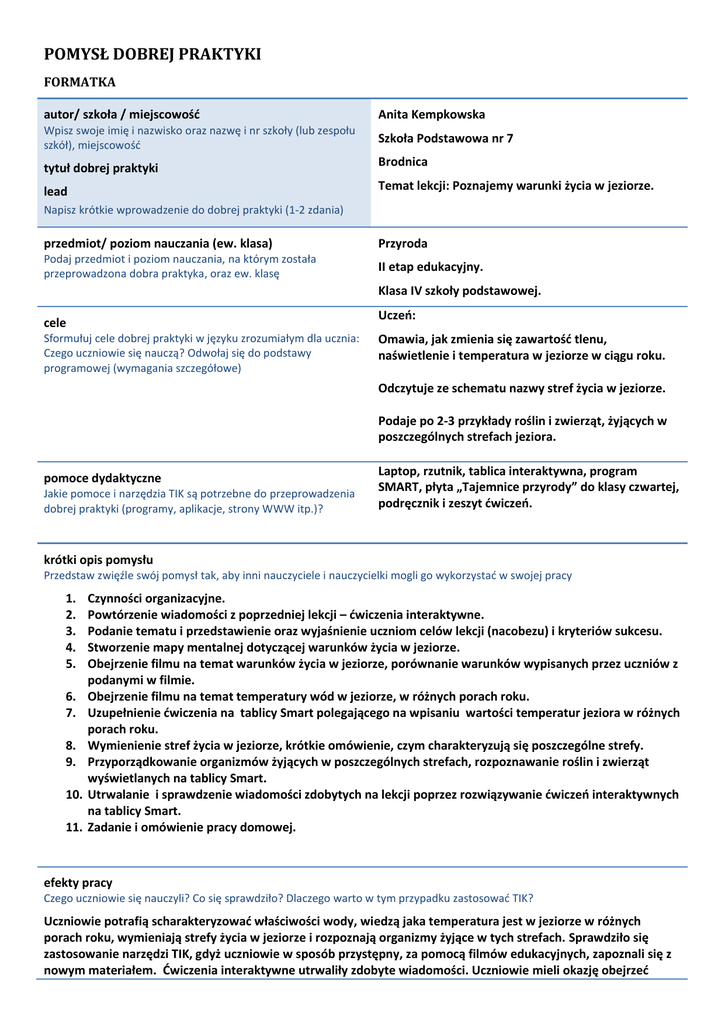 POMYSŁ DOBREJ PRAKTYKI FORMATKA autor/ szkoła / miejscowośd Anita Kempkowska Wpisz swoje imię i nazwisko oraz nazwę i nr szkoły (lub zespołu szkół), miejscowośd Szkoła Podstawowa nr 7 tytuł dobrej praktyki Brodnica lead Temat lekcji: Poznajemy warunki życia w jeziorze. Napisz krótkie wprowadzenie do dobrej praktyki (1-2 zdania) przedmiot/ poziom nauczania (ew. klasa) Przyroda Podaj przedmiot i poziom nauczania, na którym została przeprowadzona dobra praktyka, oraz ew. klasę II etap edukacyjny. Klasa IV szkoły podstawowej. Uczeo: cele Sformułuj cele dobrej praktyki w języku zrozumiałym dla ucznia: Czego uczniowie się nauczą? Odwołaj się do podstawy programowej (wymagania szczegółowe) Omawia, jak zmienia się zawartośd tlenu, naświetlenie i temperatura w jeziorze w ciągu roku. Odczytuje ze schematu nazwy stref życia w jeziorze. Podaje po 2-3 przykłady roślin i zwierząt, żyjących w poszczególnych strefach jeziora. pomoce dydaktyczne Jakie pomoce i narzędzia TIK są potrzebne do przeprowadzenia dobrej praktyki (programy, aplikacje, strony WWW itp.)? Laptop, rzutnik, tablica interaktywna, program SMART, płyta „Tajemnice przyrody” do klasy czwartej, podręcznik i zeszyt dwiczeo. krótki opis pomysłu Przedstaw zwięźle swój pomysł tak, aby inni nauczyciele i nauczycielki mogli go wykorzystad w swojej pracy 1. 2. 3. 4. 5. 6. 7. 8. 9. 10. 11. Czynności organizacyjne. Powtórzenie wiadomości z poprzedniej lekcji – dwiczenia interaktywne. Podanie tematu i przedstawienie oraz wyjaśnienie uczniom celów lekcji (nacobezu) i kryteriów sukcesu. Stworzenie mapy mentalnej dotyczącej warunków życia w jeziorze. Obejrzenie filmu na temat warunków życia w jeziorze, porównanie warunków wypisanych przez uczniów z podanymi w filmie. Obejrzenie filmu na temat temperatury wód w jeziorze, w różnych porach roku. Uzupełnienie dwiczenia na tablicy Smart polegającego na wpisaniu wartości temperatur jeziora w różnych porach roku. Wymienienie stref życia w jeziorze, krótkie omówienie, czym charakteryzują się poszczególne strefy. Przyporządkowanie organizmów żyjących w poszczególnych strefach, rozpoznawanie roślin i zwierząt wyświetlanych na tablicy Smart. Utrwalanie i sprawdzenie wiadomości zdobytych na lekcji poprzez rozwiązywanie dwiczeo interaktywnych na tablicy Smart. Zadanie i omówienie pracy domowej. efekty pracy Czego uczniowie się nauczyli? Co się sprawdziło? Dlaczego warto w tym przypadku zastosowad TIK? Uczniowie potrafią scharakteryzowad właściwości wody, wiedzą jaka temperatura jest w jeziorze w różnych porach roku, wymieniają strefy życia w jeziorze i rozpoznają organizmy żyjące w tych strefach. Sprawdziło się zastosowanie narzędzi TIK, gdyż uczniowie w sposób przystępny, za pomocą filmów edukacyjnych, zapoznali się z nowym materiałem. Ćwiczenia interaktywne utrwaliły zdobyte wiadomości. Uczniowie mieli okazję obejrzed zdjęcia kilkunastu organizmów żyjących w jeziorze, przedwiczyd ich rozpoznawanie, dzięki czemu nie tylko będą potrafili wymienid organizmy żyjące w wodzie, ale również rozpoznad je zarówno np. w książce, jak i w terenie. uwagi Jakie działania planujesz w przyszłości? Czy zamierzasz zmienid lub rozwinąd swój pomysł? Przed czym chcesz przestrzec naśladowców dobrej praktyki? W przyszłości na pewno będę kontynuowad zastosowanie narzędzi Tik w nauczaniu przyrody. Nie zamierzam zmienid mojego pomysłu na tę lekcję, gdyż ten sprawdził się dobrze. załączniki Materiały przygotowane przez nauczyciela (np. karty pracy, krzyżówki, quizy) oraz strona WWW, na której znajduje się dobra praktyka (prace uczniów stworzone w jej ramach) Efektem pracy na tej lekcji są dwiczenia interaktywne przygotowane w programie Smart, utrwalające wiadomości z lekcji : „Poznajemy warunki życia w jeziorze.” oraz praca domowa wykonana w programie Microsoft Office Word: „Organizmy żyjące w jeziorze”.