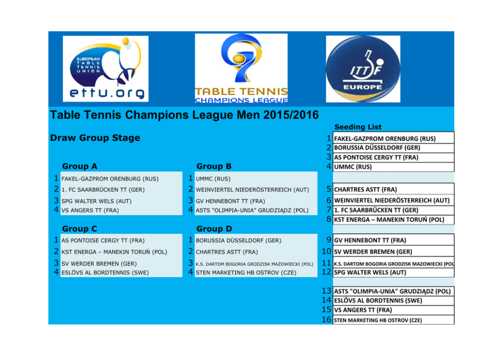 Table Tennis Champions League Men 2015/2016 Seeding List Draw Group Stage Group A 1 2 3 4 FAKEL-GAZPROM ORENBURG (RUS) 1. FC SAARBRÜCKEN TT (GER) SPG WALTER WELS (AUT) VS ANGERS TT (FRA) Group B 1 2 3 4 Group C 1 2 AS PONTOISE CERGY TT (FRA) 3 4 SV WERDER BREMEN (GER) KST ENERGA – MANEKIN TORUŃ (POL) ESLÖVS AL BORDTENNIS (SWE) 1 2 3 4 FAKEL-GAZPROM ORENBURG (RUS) BORUSSIA DÜSSELDORF (GER) AS PONTOISE CERGY TT (FRA) UMMC (RUS) 5 6 7 8 CHARTRES ASTT (FRA) UMMC (RUS) WEINVIERTEL NIEDERÖSTERREICH (AUT) GV HENNEBONT TT (FRA) ASTS "OLIMPIA-UNIA" GRUDZIĄDZ (POL) WEINVIERTEL NIEDERÖSTERREICH (AUT) 1. FC SAARBRÜCKEN TT (GER) KST ENERGA – MANEKIN TORUŃ (POL) Group D 1 2 3 4 BORUSSIA DÜSSELDORF (GER) CHARTRES ASTT (FRA) K.S. DARTOM BOGORIA GRODZISK MAZOWIECKI (POL) STEN MARKETING HB OSTROV (CZE) 9 GV HENNEBONT TT (FRA) 10 SV WERDER BREMEN (GER) 11 K.S. DARTOM BOGORIA GRODZISK MAZOWIECKI (POL) 12 SPG WALTER WELS (AUT) 13 ASTS "OLIMPIA-UNIA" GRUDZIĄDZ (POL) 14 ESLÖVS AL BORDTENNIS (SWE) 15 VS ANGERS TT (FRA) 16 STEN MARKETING HB OSTROV (CZE)