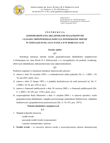 GIM ZJ NA U M IM BC ZY CA CH JE “WY Ą” IEJ DZ CIE MO JĄ N EŚ A ST G I M N A Z J U M I M . J A N A P A W Ł A II W D O B C Z Y C A C H ul. Parkowa 4, 32-410 Dobczyce, tel./fax 012 271 11 93, e-mail: [email protected] DO . JA NA PAW ŁA II W Załącznik Nr 1 do Zarządzenia Nr 10/2010 Dyrektora Gimnazjum im. Jana Pawła II w Dobczycach z dnia 8 listopada 2010 r. INSTRUKCJA GOSPODAROWANIA SKŁADNIKAMI MAJĄTKOWYMI I ZASADY ODPOWIEDZIALNOŚCI ZA POWIERZONE MIENIE W GIMNAZJUM IM. JANA PAWŁA II W DOBCZYCACH Zasady ogólne §1 Instrukcja niniejsza określa zasady gospodarowania składnikami majątkowymi w Gimnazjum im. Jana Pawła II w Dobczycach, a w szczególności ich podział, ewidencję, obrót tymi składnikami, dokumentowanie oraz odpowiedzialność. §2 Podstawę regulacji w niniejszej instrukcji stanowią akty prawne: 1) ustawa z dnia 29 września 1994 r. o rachunkowości (tekst jednolity Dz. U. z 2002 r. Nr 76, poz.694 z późn. zm.); 2) ustawa z dnia 15 lutego 1992 r. o podatku dochodowym od osób prawnych (tj. Dz. U. z 2000 r. Nr 54, poz. 654 ze zm.); 3) ustawa o finansach publicznych z dnia 30 czerwca 2005 r. o finansach publicznych (Dz. U. z 2005 r. Nr 249, poz. 2104 z późn. zm.); 4) rozporządzenie Rady Ministrów z dnia 11 sierpnia 2004 r. w sprawie sposobu i trybu gospodarowania składnikami majątku powierzonego jednostkom budżetowym, zakładom budżetowym i gospodarstwom pomocniczym (Dz. U. Nr 191, poz. 1957); Podział składników majątkowych §3 1. Majątek jednostki stanowią: – środki trwałe – pozostałe środki trwałe (wyposażenie) – wartości niematerialne i prawne 2. Środki trwałe – to rzeczowe aktywa trwałe o przewidywanym okresie ekonomicznej użyteczności dłuższym niż jeden rok, kompletne i zdatne do użytku. Za środki trwałe uważa się składniki majątku, których cena nabycia przekracza wartość określoną w ustawie o podatku dochodowym od osób prawnych tj. 3 500,00. 3. Bez względu na wartość na koncie środków trwałych ewidencjonuje się grunty, budowle i budynki. 4. Wartość środka trwałego może być zwiększona lub zmniejszona w wyniku zarządzanej aktualizacji wyceny. Zwiększenie wartości początkowej środków trwałych może nastąpić o równowartość kosztów inwestycji związanych z ich ulepszeniem. 5. Dokonywanie odpisów amortyzacyjnych danego środka trwałego odbywa się w trybie zapisu rocznego. Rozpoczęcie amortyzacji ustala się proporcjonalnie, od miesiąca następującego po miesiącu, w którym środek trwały został przyjęty do używania i wprowadzony do ewidencji jednostki, a jej zakończenie do końca tego miesiąca, w którym następuje zrównanie sumy odpisów z ich wartością początkową lub w którym postawiono je w stan likwidacji, zbyto lub stwierdzono niedobór. 6. Wyceny składników majątkowych dokonuje się zgodnie z zasadami określonymi w ustawie o rachunkowości, z tym, że środki trwałe stanowiące własność jednostki otrzymane nieodpłatnie na podstawie decyzji właściwego organu, wycenia się według wartości określonej w decyzji. 7. Pozostałe środki trwałe (wyposażenie) – pozostałe środki trwałe, o wartości nie przekraczającej wielkości stanowiącej dolną granicę środka trwałego, umarza się w pełnej wartości poprzez spisanie w koszty w miesiącu przyjęcia do używania. Ustala się dolną granicę wartości pozostałych środków trwałych podlegających ewidencji ilościowowartościowej na poziomie 5% wartości środków trwałych określonych odrębnymi przepisami (na dzień sporządzania instrukcji dolna granica środka trwałego zgodnie z ustawą o podatku dochodowym od osób prawnych wynosi 3 500 zł x 5% =175,00 zł ). Ustalona granica może ulec zmianie w przypadku zmiany powyższych przepisów. 8. Pozostałe środki trwałe w używaniu wycenia się według cen zakupu brutto, tj. łącznie z podatkiem VAT. 9. Wartości niematerialne i prawne – Wartości niematerialne i prawne, których wartość nie przekracza 3 500 zł umarza się jednorazowo w 100% poprzez odpisanie w koszty w miesiącu przyjęcia do używania, gdy wartość ich jest wyższa niż 3 500 zł umarza się w wysokości 20% - 30% w stosunku rocznym. 10. Szczegółowy wykaz środków trwałych umarzanych stopniowo określa „Klasyfikacja Środków Trwałych” stanowiąca załącznik do rozporządzenia Rady Ministrów z dnia 30 2|S tr o na grudnia 1999 r. w sprawie Klasyfikacji Środków Trwałych (Dz. U. z 1999r. Nr 112, poz. 1317 z późn. zm.). Ewidencja składników majątkowych §4 1. Ewidencja składników majątkowych w Gimnazjum im. Jana Pawła II w Dobczycach prowadzona jest na następujących kontach: 011 – Środki trwałe 013 – Pozostałe środki trwałe w używaniu 014 – Księgozbiór 020 – Wartości niematerialne i prawne umarzane jednorazowo 71 – Umorzenie środków trwałych oraz wartości niematerialnych i prawnych 072 – Umorzenie pozostałych środków trwałych w używaniu oraz wartości niematerialnych i prawnych 401 – Amortyzacja 2. Ewidencją ilościowo – wartościową objęte są pozostałe środki trwałe, wartości niematerialne i prawne od 5 % wartości środków trwałych (obecnie 175 zł). 3. Nie podlegają ewidencji pozostałe środki trwałe na stałe wbudowane w budynek lub w urządzenie techniczne. 4. Dla drobnych składników majątkowych o wartości poniżej kwoty 175 zł (obecnie) takie jak np.: kalkulatory, kwietniki, kosze na śmieci prowadzona jest przez pracownika oddziału administracji ewidencja ilościowa. 5. Ewidencją ilościowo - wartościową należy objąć, bez względu na ich wartość meble, dywany, telefony. 6. Ewidencji analitycznej w książkach inwentarzowych dokonuje się w porządku chronologicznym. 7. Dla środków trwałych prowadzi się dla każdego składnika mienia kartę środka trwałego z tabelą umorzeń. 8. Ewidencję środków trwałych oraz tabele amortyzacyjne prowadzi główna księgowa rę