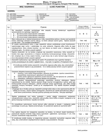 Mława, 17 lutego 2013. WS Ciechanowsko-Ostrołęcki Okręgowy Związek Piłki Nożnej IMIĘ I NAZWISKO ILOŚĆ PUNKTÓW OCENA LEGENDA: G - grać dalej B – rzut wolny bezpośredni P – rzut wolny pośredni K – rzut karny TAK J – jeszcze raz S – rzut sędziowski Br – bramka W – wrzut NIE R – rzut rożny Z – zakończenie Rb – rzut od bramki + - napomnienie ++ - wykluczenie 1. Lp. 1. 2. 3. 4. 5. 6. Pytanie Na zawodach szczebla centralnego oba zespoły muszą dostarczyć wypełnione sprawozdanie do sędziego najpóźniej: A – 60 minut przed rozpoczęciem zawodów B – 75 minut przed rozpoczęciem zawodów C – 90 minut przed rozpoczęciem zawodów Mecz odbywał się w niskiej temperaturze i kilku zawodników jednej z drużyn pod spodenki koloru zielonego założyło czarne rajtuzy, na które założyli czarne getry. Sędzia zezwolił na taki ubiór. Czy postąpił prawidłowo? W czasie wykonywania rzutu z rogu napastnik celowo podskakuje przed bramkarzem, ograniczając jego ruchy i zasłaniając mu pole widzenia. Zagrana piłka trafia do jego współpartnera, który strzela bramkę i po tym fakcie na bieżni wraz z kolegami, fetuje zdobycie gola. Co winien uczynić sędzia? Sędzia stwierdził, że na boisku znajduje się zawodnik rezerwowy, który wszedł na boisko bez jego zezwolenia w miejsce wcześniej kontuzjowanego kolegi. Zawodnik ten znajduje się w innej części boiska, a gra toczy się w polu karnym jego drużyny. Co w tej sytuacji winien uczynić sędzia? Zawodnik wykluczony z gry udał się do szatni. Po przebraniu się w garnitur stanął w tunelu prowadzącym do szatni i oglądał mecz. Czy było to zgodne z Przepisami Gry? W środkowej strefie boiska zawodnik rozmyślnie zagrywa piłkę ręką, aby uniemożliwić przeciwnikowi wejście w jej posiadanie. Co w takiej sytuacji winien uczynić sędzia? 9. Osobami oficjalnie towarzyszącymi drużynie są: A - trenerzy i inne osoby towarzyszące, wpisane do protokołu (oprócz zawodników i zawodników rezerwowych wpisanych do protokołu) B - każda osoba zgłoszona sędziemu przed meczem, ale nie wpisana do protokołu, C - zawodnicy, zawodnicy rezerwowi wpisani do protokołu Sędzia asystent zasygnalizował spalonego zawodnika drużyny atakującej. Sędzia sygnalizacji tej nie widział. Sędzia asystent długo trzymał chorągiewkę w górze, gdyż grę kontynuowała drużyna atakująca. Jednak przerwał swoją sygnalizację, gdy piłkę przejął zawodnik drużyny broniącej i podał ją do współpartnera. Czy sędzia asystent postąpił słusznie? Znajdując się w środku pola gry napastnik pomógł sobie ręką w celu opanowania piłki źle odbitej od murawy. Zanim sędzia zareagował, zawodnik ten zdołał dośrodkować piłkę w pole karne przeciwników, tworząc groźną sytuację pod bramką. Decyzja sędziego? 10. Sędzia podyktował rzut wolny pośredni i zanim zdążył uniesionym ramieniem zasygnalizować rodzaj rzutu, zawodnik uderzył piłkę, która trafiła w słupek, następnie w tył głowy leżącego bramkarza i wpadła do bramki. 7. 8. 11. 12. 13. Po prawidłowo wykonanym rzucie karnym piłka uderzyła w słupek i następnie pękła pozostając na polu gry. Sędzia przerwał grę. Co postanowi sędzia po wymianie piłki? Czy sędzia dopuści do rozegrania zawodów na boisku, na którym słupki bramkowe i poprzeczki obydwu bramek mają równą szerokość i głębokość, wynoszącą 11 cm, linie boczne i bramkowe mają szerokość 11 cm? W środkowej strefie boiska, w niegroźnej sytuacji, zawodnik rozmyślnie zagrywa piłkę ręką, aby uniemożliwić współpartnerowi wejście w jej posiadanie. Decyzja. Oznacz kółkiem prawidłowy symbol A B C TAK - NIE G B P K J S Br W R Z Rb + + + + + + + + + + + + G B P K J S Br W R Z Rb + + + + + + + + + + + + TAK – NIE G B Br W + + + + A P K J S R Z Rb. + + + + + + + + B C TAK – NIE G B Br W + + + + P K J S R Z Rb. + + + + + + + + G B P K J S Br W R Z Rb. + + + + + + + + + + + + G B P K J S Br W R Z Rb. + + + + + + + + + + + + TAK – NIE G B Br W + + + + P K J S R Z Rb. + + + + + + + + Ilość punktów Ocena Komisji B Pkt 6 Str 136 Nie s. 18 P Str 109 G + s.57 Nie s.138 B+ s. 107 A s. 56 Tak s.88 B s.107 BR, str 156 pkt 3, str 119 procedura wykonania S, Art. 2 str 13 TAK ,Str. 9 „Bramki”, str. 6 „Wymiary pola gry” B, Str. 107 „Sankcje dyscyplinarne” ptk 1 Mława, 17 lutego 2013. WS Ciechanowsko-Ostrołęcki Okręgowy Związek Piłki Nożnej 14. 15. 16. 17. 18. 19. 20. 21. 22. 23. 24. 25. 26. 27. 28. 29. 30. Dwóch zawodników jednej drużyny w czasie próby zagrania piłki zderza się głowami. Sędzia przerwał grę i wezwał pomoc medyczną. Po opatrzeniu obu zawodników sędzia zezwolił im na pozostanie na polu gry. Czy słusznie? Pierwsza połowa zawodów odbywała się w strugach ulewnego deszczu. W przerwie drużyna gospodarzy, dbając o zdrowie zawodników, zmieniła koszulki na identyczne, jednak bez numerów. Ponieważ na spodenkach numery zawodników były wyraźnie widoczne sędzia zezwolił na kontynuowanie zawodów w suchych koszulkach. Czy postępowanie było zgodne z przepisami gry? Zawodnik podczas wykonywania wrzutu nie odrywając stóp od podłoża przykucnął i wrzucił piłkę na pole gry. Sędzia uznał, że narusza to zapisy art. 15. Czy słusznie? Po zakończeniu zawodów drużyna gości, sędzia, sędziowie asystenci oraz sędzia techniczny udali się bezpośrednio do szatni. Fetujący zwycięstwo gospodarze pozostali na płycie boiska. Czy postępowanie sędziów było prawidłowe? Sędzia wskazał, że pierwsza połowa zawodów przedłużona będzie o jedną minutę, gdyż kompensował czas związany z przerwą spowodowaną kontuzją zawodnika. Przerwa trwała 75 sekund. Czy postępowanie sędziego było prawidłowe? Czy sędzia ma obowiązek w sposób wyraźny, gwizdkiem sygnalizować zawodnikom i publiczności tuż przed zakończeniem każdej połowy zawodów (względnie dogrywki) ilość minimalnego