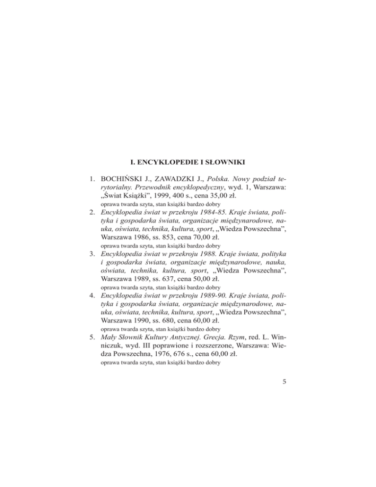 I. ENCYKLOPEDIE I SŁOWNIKI 1. BOCHIŃSKI J., ZAWADZKI J., Polska. Nowy podział terytorialny. Przewodnik encyklopedyczny, wyd. 1, Warszawa: „Świat Książki”, 1999, 400 s., cena 35,00 zł. oprawa twarda szyta, stan książki bardzo dobry 2. Encyklopedia świat w przekroju 1984-85. Kraje świata, polityka i gospodarka świata, organizacje międzynarodowe, nauka, oświata, technika, kultura, sport, „Wiedza Powszechna”, Warszawa 1986, ss. 853, cena 70,00 zł. oprawa twarda szyta, stan książki bardzo dobry 3. Encyklopedia świat w przekroju 1988. Kraje świata, polityka i gospodarka świata, organizacje międzynarodowe, nauka, oświata, technika, kultura, sport, „Wiedza Powszechna”, Warszawa 1989, ss. 637, cena 50,00 zł. oprawa twarda szyta, stan książki bardzo dobry 4. Encyklopedia świat w przekroju 1989-90. Kraje świata, polityka i gospodarka świata, organizacje międzynarodowe, nauka, oświata, technika, kultura, sport, „Wiedza Powszechna”, Warszawa 1990, ss. 680, cena 60,00 zł. oprawa twarda szyta, stan książki bardzo dobry 5. Mały Słownik Kultury Antycznej. Grecja. Rzym, red. L. Winniczuk, wyd. III poprawione i rozszerzone, Warszawa: Wiedza Powszechna, 1976, 676 s., cena 60,00 zł. oprawa twarda szyta, stan książki bardzo dobry 5 I. Encyklopedie i słowniki 6. Mały Słownik Kultury Dawnych Słowian, red. L. Leciejewicz, Warszawa: Wiedza Powszechna, 1972, 676 s., cena 40,00 zł. oprawa twarda szyta, stan książki bardzo dobry 7. Słownik Języka Adama Mickiewicza, red. K. Górski, S. Hrabiec, t. II, IV, VII, wyd. 1, Wrocław-Warszawa-Kraków: „Czytelnik”, 1964-1971, 581 + 505 + 577 s., cena 50,00 zł/ 1 tom. oprawa twarda szyta, stan książki bardzo dobry 8. Współcześni uczeni polscy. Słownik biograficzny, t. 4, S-Ż, Ośrodek Przetwarzania Informacji, Warszawa 2002, ss. 930, cena 20,00 zł. oprawa twarda szyta, stan książki bardzo dobry 6