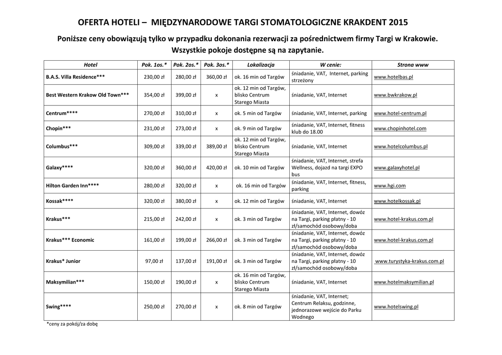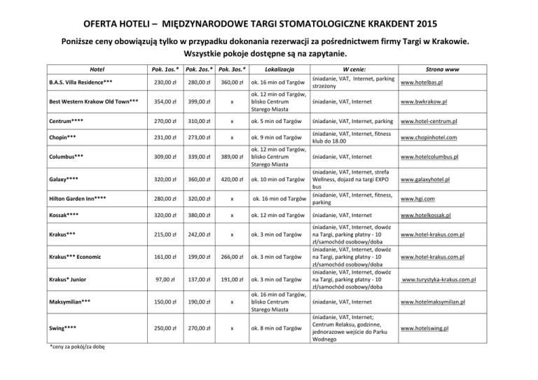 OFERTA HOTELI – MIĘDZYNARODOWE TARGI STOMATOLOGICZNE KRAKDENT 2015 Poniższe ceny obowiązują tylko w przypadku dokonania rezerwacji za pośrednictwem firmy Targi w Krakowie. Wszystkie pokoje dostępne są na zapytanie. Hotel Pok. 1os.* Pok. 2os.* Pok. 3os.* Lokalizacja W cenie: Strona www www.hotelbas.pl B.A.S. Villa Residence*** 230,00 zł 280,00 zł 360,00 zł ok. 16 min od Targów śniadanie, VAT, Internet, parking strzeżony Best Western Krakow Old Town*** 354,00 zł 399,00 zł x ok. 12 min od Targów, blisko Centrum Starego Miasta śniadanie, VAT, Internet www.bwkrakow.pl Centrum**** 270,00 zł 310,00 zł x ok. 5 min od Targów śniadanie, VAT, Internet, parking www.hotel-centrum.pl Chopin*** 231,00 zł 273,00 zł x ok. 9 min od Targów śniadanie, VAT, Internet, fitness klub do 18.00 www.chopinhotel.com Columbus*** 309,00 zł 339,00 zł 389,00 zł ok. 12 min od Targów, blisko Centrum Starego Miasta śniadanie, VAT, Internet www.hotelcolumbus.pl Galaxy**** 320,00 zł 360,00 zł 420,00 zł ok. 10 min od Targów Hilton Garden Inn**** 280,00 zł 320,00 zł x ok. 16 min od Targów Kossak**** 320,00 zł 380,00 zł x ok. 12 min od Targów Krakus*** 215,00 zł 242,00 zł x ok. 3 min od Targów Krakus*** Economic 161,00 zł 199,00 zł 266,00 zł ok. 3 min od Targów Krakus* Junior 97,00 zł 137,00 zł 191,00 zł ok. 3 min od Targów Maksymilian*** 150,00 zł 190,00 zł x Swing**** *ceny za pokój/za dobę 250,00 zł 270,00 zł x śniadanie, VAT, Internet, strefa Wellness, dojazd na targi EXPO bus śniadanie, VAT, Internet, fitness, parking śniadanie, VAT, Internet śniadanie, VAT, Internet, dowóz na Targi, parking płatny - 10 zł/samochód osobowy/doba śniadanie, VAT, Internet, dowóz na Targi, parking płatny - 10 zł/samochód osobowy/doba śniadanie, VAT, Internet, dowóz na Targi, parking płatny - 10 zł/samochód osobowy/doba www.galaxyhotel.pl www.hgi.com www.hotelkossak.pl www.hotel-krakus.com.pl www.hotel-krakus.com.pl www.turystyka-krakus.com.pl ok. 16 min od Targów, blisko Centrum Starego Miasta śniadanie, VAT, Internet www.hotelmaksymilian.pl ok. 8 min od Targów śniadanie, VAT, Internet; Centrum Relaksu, godzinne, jednorazowe wejście do Parku Wodnego www.hotelswing.pl