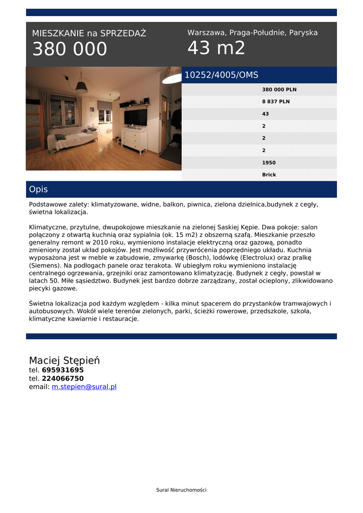 MIESZKANIE na SPRZEDAŻ 380 000 Warszawa, Praga-Południe, Paryska 43 m2 10252/4005/OMS 380 000 PLN 8 837 PLN 43 2 2 2 1950 Brick Opis Podstawowe zalety: klimatyzowane, widne, balkon, piwnica, zielona dzielnica,budynek z cegły, świetna lokalizacja. Klimatyczne, przytulne, dwupokojowe mieszkanie na zielonej Saskiej Kępie. Dwa pokoje: salon połączony z otwartą kuchnią oraz sypialnia (ok. 15 m2) z obszerną szafą. Mieszkanie przeszło generalny remont w 2010 roku, wymieniono instalacje elektryczną oraz gazową, ponadto zmieniony został układ pokojów. Jest możliwość przywrócenia poprzedniego układu. Kuchnia wyposażona jest w meble w zabudowie, zmywarkę (Bosch), lodówkę (Electrolux) oraz pralkę (Siemens). Na podłogach panele oraz terakota. W ubiegłym roku wymieniono instalację centralnego ogrzewania, grzejniki oraz zamontowano klimatyzację. Budynek z cegły, powstał w latach 50. Miłe sąsiedztwo. Budynek jest bardzo dobrze zarządzany, został ocieplony, zlikwidowano piecyki gazowe. Świetna lokalizacja pod każdym względem - kilka minut spacerem do przystanków tramwajowych i autobusowych. Wokół wiele terenów zielonych, parki, ścieżki rowerowe, przedszkole, szkoła, klimatyczne kawiarnie i restauracje. Maciej Stępień tel. 695931695 tel. 224066750 email: [email protected] Sural Nieruchomości Powered by TCPDF (www.tcpdf.org)