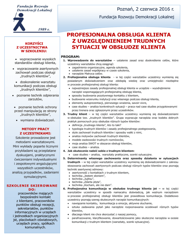 Poznań, 2 czerwca 2016 r. Rozwiązania informatyczne Fundacja Rozwoju Demokracji Lokalnej KORZYŚCI Z UCZESTNICTWA W SZKOLENIU: wypracowanie wysokich standardów obsługi klienta, wypracowanie asertywnych zachowań podczas obsługi „trudnych klientów”, doskonalenie warsztatu komunikacji podczas obsługi „trudnych klientów”, poznanie technik odpierania zarzutów, poznanie technik ochrony przed manipulacją ze strony „trudnych klientów”, wymiana doświadczeń. METODY PRACY Z UCZESTNIKAMI: Szkolenie prowadzone jest metodami warsztatowymi. Mini wykłady poparte licznymi przykładami są przeplatane dyskusjami, praktycznymi ćwiczeniami indywidualnymi i zespołowymi angażującymi wszystkich uczestników, analizą przypadków, zadaniami symulacyjnymi. SZKOLENIE SKIEROWANE DO: pracowników mających bezpośredni kontakt z klientami, pracowników punktów obsługi recepcji, sekretariatów, punktów informacyjnych w urzędach i jednostkach organizacyjnych jst, placówkach oświatowych, urzędach pracy, spółkach komunalnych. PROFESJONALNA OBSŁUGA KLIENTA Z UWZGLĘDNIENIEM TRUDNYCH SYTUACJI W OBSŁUDZE KLIENTA PROGRAM: 1. Wprowadzenie do warsztatów – ustalenie zasad oraz dookreślenie celów, które uczestnicy warsztatów chcą osiągnąć: zagadnienia organizacyjne, agenda szkolenia, ustalenie zasad współpracy w czasie szkolenia, narzędzie Matryca celów. 2. Profesjonalna obsługa klienta - w tej części warsztatów uczestnicy wymienią się posiadanym doświadczeniem oraz zdobędą wiedzę oraz umiejętności niezbędne w procesie profesjonalnej obsługi klienta: najważniejsze zasady profesjonalnej obsługi klienta w urzędzie – wyodrębnienie narzędzi wspomagających profesjonalną obsługę klienta, sposoby budowania pozytywnego kontaktu z klientem, budowanie wizerunku instytucji oraz własnego podczas obsługi klienta, elementy autoprezentacji, pierwszego wrażenia, savoir-vivre, case studies – analiza konkretnych sytuacji – praca nad case studies przygotowanymi przez trenera oraz zgłoszonymi przez uczestników. 3. Trudny klient – w tej części warsztatów uczestnicy wymienią się doświadczeniami w obsłudze tzw. „trudnych klientów”. Grupa wypracuje narzędzia oraz kodeks dobrych praktyk pomocnych przy obsłudze różnych typów klientów: definicja „trudnego klienta”, kto to taki? typologia trudnych klientów i zasady profesjonalnego postępowania, style zachowań trudnych klientów i sposoby walki z nimi, analiza motywów zachowań trudnych klientów, modele osobowości trudnych rozmówców, moja analiza SWOT w obszarze obsługi klientów, case studies – analiza. 4. Jak skutecznie radzić sobie z trudnym klientem: case studies – analiza, warsztaty praktyczne, scenki sytuacyjne. 5. Determinanty własnego zachowania oraz sposoby działania w sytuacjach trudnych – w tej części warsztatów uczestnicy wymienią się doświadczeniami z zakresu stosowania zachowań asertywnych podczas obsługi różnych typów klientów oraz poznają techniki asertywnej odmowy: asertywność z kontaktach z trudnym klientem, technika „Jestem słoniem”, technika „Jujitsu”, technika „Zdarta płyta”, technika „Kocham, ale nie dam”. 6. Profesjonalna komunikacja w obsłudze trudnego klienta jst – w tej części warsztatów uczestnicy w sposób namacalny doświadczą, jak ważnym narzędziem w procesie profesjonalnej obsługi klientów jest prawidłowa komunikacja. Dodatkowo uczestnicy poznają szereg skutecznych narzędzi komunikacyjnych: nawiązanie kontaktu, komunikacja a emocje, aktywne słuchanie, sztuka zadawania pytań jako narzędzie rozpoznawania oczekiwań różnych typów klientów, dlaczego klient nie chce skorzystać z naszej pomocy, parafrazowanie, klaryfikowanie, dowartościowanie jako skuteczne narzędzia w ocesie komunikacji z trudnym klientem (warsztaty, scenki sytuacyjne). MIEJSCE SZKOLENIA: Poznań, ul. Dąbrowskiego 79, Sale Omega XI piętro. Mapkę dojazdu do miejsca szkolenia znajdą Państwo na www.okst.pl/dojazd. TERMIN SZKOLENIA: Poznań, 2 czerwca godz. 10.00 – 15.00. CENA: 359 zł netto/os. Uwaga! przy zgłoszeniu do 25 maja br. cena promocyjna 310 zł netto/os. Udział w szkoleniu zwolniony z VAT w przypadku finansowania szkolenia ze środków publicznych. Cena zawiera materiały szkoleniowe, zaświadczenie o ukończeniu szkolenia, poczęstunek i serwis kawowy. ZGŁOSZENIA: Wypełnioną kartę zgłoszenia należy przesłać mailem, faksem lub poprzez formularz na www.okst.pl do 6 maja 2016 r. DANE DO KONTAKTU: Ośrodek Kształcenia Samorządu Terytorialnego im. Waleriana Pańki 40-014 Katowice ul. Mariacka 1 kanały w komunikacji (wzrokowy, słuchowy, kinestetyczny) + elementy NLP praktyczne warsztaty nt tego, w jaki sposób dotrzeć do poszczególnych grup klientów, bariery w komunikacji - czego należy unikać - case studies, warsztaty, scenki sytuacyjne, osiem ukrytych programów, analiza transakcyjna Ericha Berne'a. 7. Odpieranie zastrzeżeń klienta – ta część warsztatów zostanie poświęcona wypracowaniu praktycznych narzędzi niezbędnych do profesjonalnej obsługi klientów: uzasadniona krytyka, zarzuty pozorne, asertywna odmowa, ochrona przed manipulacją klienta, case studies – analiza, warsztaty praktyczne, scenki sytuacyjne. 8. Techniki obsługi trudnego klienta w czasie rozmowy telefonicznej – w tej części warsztatów uczestnicy wymienią się doświadczeniami oraz zdobędą umiejętności niezbędne w profesjonalnej obsłudze telefonicznej klientów: profesjonalna obsługa klientów w czasie rozmowy telefonicznej wychodzącej, profesjonalna obsługa klientów w czasie rozmowy telefonicznej przychodzącej. 9. Podsumowanie – podsumowanie zdobytej wiedzy i wypracowanych umiejętności. Uczestnicy warsztatów wezmą udział w ćwiczeniach praktycznych, scenkach sytuacyjnych, warsztatach z kamerą video. UWAGA!!! Wraz ze zgłoszeniem można przesłać propozycję case studies do omówienia w c