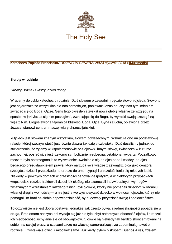 The Holy See Katecheza Papieża FranciszkaAUDIENCJA GENERALNA28 stycznia 2015 r.[Multimedia] Sieroty w rodzinie Drodzy Bracia i Siostry, dzień dobry! Wracamy do cyklu katechez o rodzinie. Dziś słowem przewodnim będzie słowo «ojciec». Słowo to jest najdroższe ze wszystkich dla nas chrześcijan, ponieważ Jezus nauczył nas tym imieniem zwracać się do Boga: Ojcze. Sens tego określenia zyskał nową głębię właśnie ze względu na sposób, w jaki Jezus się nim posługiwał, zwracając się do Boga, by wyrazić swoją szczególną więź z Nim. Błogosławiona tajemnica bliskości Boga, Ojca, Syna i Ducha, objawiona przez Jezusa, stanowi centrum naszej wiary chrześcijańskiej. «Ojciec» jest słowem znanym wszystkim, słowem powszechnym. Wskazuje ono na podstawową relację, której rzeczywistość jest równie dawna jak dzieje człowieka. Dziś doszliśmy jednak do stwierdzenia, że żyjemy w «społeczeństwie bez ojców». Innymi słowy, zwłaszcza w kulturze zachodniej, postać ojca jest rzekomo symbolicznie nieobecna, osłabiona, wyparta. Początkowo rzecz ta była postrzegana jako wyzwolenie: uwolnienie się od ojca pana i władcy, od ojca będącego przedstawicielem prawa, który narzuca swą władzę z zewnątrz, ojca jako cenzora szczęścia dzieci i przeszkodę na drodze do emancypacji i uniezależnienia się młodych ludzi. Niekiedy w pewnych domach w przeszłości panował despotyzm, a w niektórych przypadkach wręcz ucisk: rodzice traktowali dzieci jak służbę, nie szanowali indywidualnych wymogów związanych z wzrastaniem każdego z nich; byli ojcowie, którzy nie pomagali dzieciom w obraniu własnej drogi z wolnością — a nie jest łatwo wychowywać dziecko w wolności; ojcowie, którzy nie pomagali im brać na siebie odpowiedzialność, by budowały przyszłość swoją i społeczeństwa. To oczywiście nie jest dobra postawa; jednakże, jak często bywa, z jednej skrajności popada się w drugą. Problemem naszych dni wydaje się już nie tyle zbyt natarczywa obecność ojców, ile raczej ich nieobecność, uchylanie się od obowiązków. Ojcowie są niekiedy tak bardzo skoncentrowani na sobie i na swojej pracy, a czasami także na własnej samorealizacji, że zapominają nawet o rodzinie. I zostawiają dzieci i młodzież same. Już kiedy byłem biskupem Buenos Aires, zdałem 2 sobie sprawę z poczucia osierocenia, z którym żyją dziś dzieci i młodzież; często pytałem też ojców, czy bawią się ze swoimi dziećmi, czy mają odwagę i miłość, by tracić czas z dziećmi. I odpowiedź była nieładna, w większości przypadków: «No, nie mogę, bo mam tyle pracy...». I ojciec był nieobecny w życiu tego dziecka, które dorastało, nie bawił się z nim, nie, nie tracił dla niego czasu. Tak więc podążając tą wspólną drogą refleksji nad rodziną, chciałbym powiedzieć wszystkim wspólnotom chrześcijańskim, że musimy być bardziej czujni: nieobecność postaci ojca w życiu dzieci i młodzieży powoduje braki i zranienia, które mogą być nawet bardzo poważne. Faktycznie wykolejenia dzieci i nieletnich w sporej części można wiązać z tym brakiem, z niedostatkiem przykładu i wiarygodnego kierownictwa w ich codziennym życiu, z brakiem bliskości, niedostatkiem miłości ze strony ojców. Głębsze niż myślimy jest poczucie osierocenia, z którym żyją liczni młodzi ludzie. Są sierotami w rodzinie, ponieważ tatowie są często nieobecni, również fizycznie, w domu, ale przede wszystkim dlatego, że kiedy są, nie zachowują się jak ojcowie, nie dialogują ze swoimi dziećmi, nie wywiązują się ze swojego zadania wychowawczego, nie wpajają dzieciom, przez swój przykład poparty słowami, tych zasad, tych wartości, tych norm życia, których one potrzebują jak chleba. Jakość wychowawcza ojcowskiej obecności jest tym bardziej potrzebna, im bardziej tato jest zmuszony przez pracę do przebywania daleko od domu. Niekiedy wydaje się, że tatowie nie wiedzą dobrze, jakie mają zająć miejsce w rodzinie i jak wychowywać dzieci. I na wszelki wypadek trzymają się z daleka, wycofują się i zaniedbują swoje obowiązki, niekiedy szukając rozwiązania w niemożliwej relacji «partnerskiej» z dziećmi. To prawda, że powinieneś być «kompanem» twojego dziecka, ale nie możesz zapominać, że jesteś ojcem! Jeśli zachowujesz się tylko jak kompan, równy z równym, dziecku dobrze to nie zrobi. Problem ten widzimy też we wspólnocie obywatelskiej. Na wspólnocie obywatelskiej i jej instytucjach spoczywa pewna odpowiedzialność — możemy powiedzieć ojcowska — za młodych ludzi, odpowiedzialność, którą niekiedy zaniedbuje ona lub się z niej nie wywiązuje. Ona również często ich osieroca i nie przedstawia im prawdziwej perspektywy. Młodzi pozostają w ten sposób sierotami pozbawionymi pewnych dróg, którymi mogliby podążać, sierotami pozbawionymi godnych zaufania mistrzów, sierotami pozbawionymi ideałów rozpalających serca, sierotami pozbawionymi wartości i nadziei, które by ich wspierały na co dzień. Daje się im być może wiele bożków, ale kradnie się im serce; podsuwa się im marzenia o rozrywkach i przyjemnościach, ale nie daje się im pracy; łudzi się ich bogiem pieniądzem, a odmawia się im prawdziwego bogactwa. Dobrze zrobi zatem wszystkim, ojcom i dzieciom, posłuchanie na nowo obietnicy, którą Jezus złożył uczniom: «Nie zostawię was sierotami» (J 14, 18). To On jest bowiem Drogą, którą trzeba iść, Mistrzem, którego trzeba słuchać, Nadzieją, że świat może się zmienić, że miłość zwycięża nienawiść, że możliwa jest dla wszystkich przyszłość w braterstwie i pokoju. Ktoś z was może mi powiedzieć: «Dziś Ojciec był zbyt krytyczny. Mówił tylko o nieobecności ojców, o tym, co się 3 dzieje, kiedy ojcowie nie są blisko dzieci...» To prawda, chciałem podkreślić te rzeczy, bo w przyszłą środę będę kontynuował tę katechez