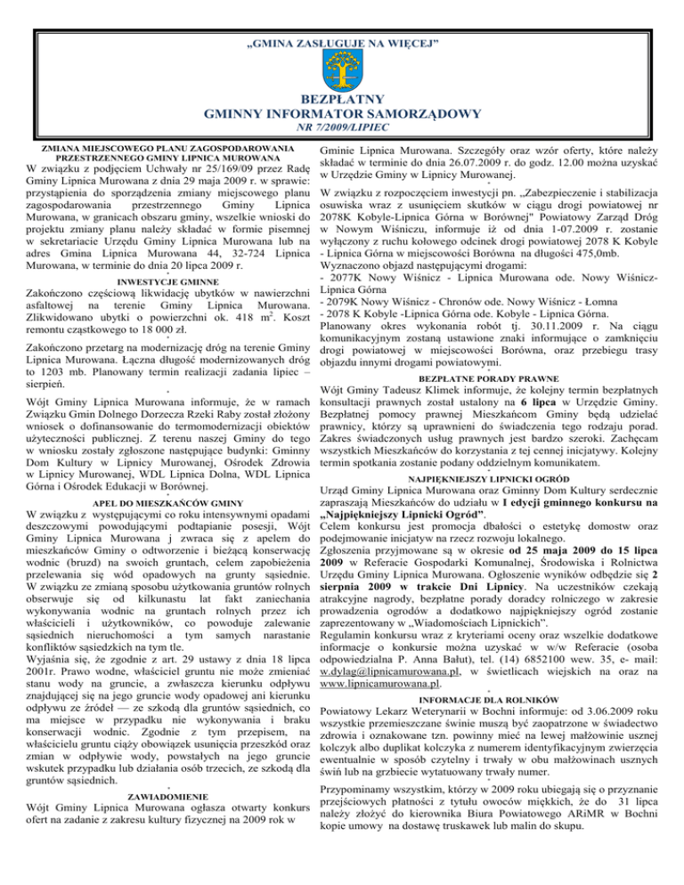 „GMINA ZASŁUGUJE NA WIĘCEJ” BEZPŁATNY GMINNY INFORMATOR SAMORZĄDOWY NR 7/2009/LIPIEC ZMIANA MIEJSCOWEGO PLANU ZAGOSPODAROWANIA PRZESTRZENNEGO GMINY LIPNICA MUROWANA Gminie Lipnica Murowana. Szczegóły oraz wzór oferty, które należy składać w terminie do dnia 26.07.2009 r. do godz. 12.00 można uzyskać W związku z podjęciem Uchwały nr 25/169/09 przez Radę w Urzędzie Gminy w Lipnicy Murowanej. Gminy Lipnica Murowana z dnia 29 maja 2009 r. w sprawie: * przystąpienia do sporządzenia zmiany miejscowego planu W związku z rozpoczęciem inwestycji pn. „Zabezpieczenie i stabilizacja zagospodarowania przestrzennego Gminy Lipnica osuwiska wraz z usunięciem skutków w ciągu drogi powiatowej nr Murowana, w granicach obszaru gminy, wszelkie wnioski do 2078K Kobyle-Lipnica Górna w Borównej" Powiatowy Zarząd Dróg projektu zmiany planu należy składać w formie pisemnej w Nowym Wiśniczu, informuje iż od dnia 1-07.2009 r. zostanie w sekretariacie Urzędu Gminy Lipnica Murowana lub na wyłączony z ruchu kołowego odcinek drogi powiatowej 2078 K Kobyle adres Gmina Lipnica Murowana 44, 32-724 Lipnica - Lipnica Górna w miejscowości Borówna na długości 475,0mb. Murowana, w terminie do dnia 20 lipca 2009 r. Wyznaczono objazd następującymi drogami: * - 2077K Nowy Wiśnicz - Lipnica Murowana ode. Nowy WiśniczINWESTYCJE GMINNE Zakończono częściową likwidację ubytków w nawierzchni Lipnica Górna asfaltowej na terenie Gminy Lipnica Murowana. - 2079K Nowy Wiśnicz - Chronów ode. Nowy Wiśnicz - Łomna Zlikwidowano ubytki o powierzchni ok. 418 m2. Koszt - 2078 K Kobyle -Lipnica Górna ode. Kobyle - Lipnica Górna. Planowany okres wykonania robót tj. 30.11.2009 r. Na ciągu remontu cząstkowego to 18 000 zł. * komunikacyjnym zostaną ustawione znaki informujące o zamknięciu Zakończono przetarg na modernizację dróg na terenie Gminy drogi powiatowej w miejscowości Borówna, oraz przebiegu trasy Lipnica Murowana. Łączna długość modernizowanych dróg objazdu innymi drogami powiatowymi. * to 1203 mb. Planowany termin realizacji zadania lipiec – BEZPŁATNE PORADY PRAWNE sierpień. Wójt Gminy Tadeusz Klimek informuje, że kolejny termin bezpłatnych * Wójt Gminy Lipnica Murowana informuje, że w ramach konsultacji prawnych został ustalony na 6 lipca w Urzędzie Gminy. Związku Gmin Dolnego Dorzecza Rzeki Raby został złożony Bezpłatnej pomocy prawnej Mieszkańcom Gminy będą udzielać wniosek o dofinansowanie do termomodernizacji obiektów prawnicy, którzy są uprawnieni do świadczenia tego rodzaju porad. użyteczności publicznej. Z terenu naszej Gminy do tego Zakres świadczonych usług prawnych jest bardzo szeroki. Zachęcam w wniosku zostały zgłoszone następujące budynki: Gminny wszystkich Mieszkańców do korzystania z tej cennej inicjatywy. Kolejny Dom Kultury w Lipnicy Murowanej, Ośrodek Zdrowia termin spotkania zostanie podany oddzielnym komunikatem. * w Lipnicy Murowanej, WDL Lipnica Dolna, WDL Lipnica NAJPIĘKNIEJSZY LIPNICKI OGRÓD Górna i Ośrodek Edukacji w Borównej. Urząd Gminy Lipnica Murowana oraz Gminny Dom Kultury serdecznie * APEL DO MIESZKAŃCÓW GMINY W związku z występującymi co roku intensywnymi opadami deszczowymi powodującymi podtapianie posesji, Wójt Gminy Lipnica Murowana j zwraca się z apelem do mieszkańców Gminy o odtworzenie i bieżącą konserwację wodnic (bruzd) na swoich gruntach, celem zapobieżenia przelewania się wód opadowych na grunty sąsiednie. W związku ze zmianą sposobu użytkowania gruntów rolnych obserwuje się od kilkunastu lat fakt zaniechania wykonywania wodnic na gruntach rolnych przez ich właścicieli i użytkowników, co powoduje zalewanie sąsiednich nieruchomości a tym samych narastanie konfliktów sąsiedzkich na tym tle. Wyjaśnia się, że zgodnie z art. 29 ustawy z dnia 18 lipca 2001r. Prawo wodne, właściciel gruntu nie może zmieniać stanu wody na gruncie, a zwłaszcza kierunku odpływu znajdującej się na jego gruncie wody opadowej ani kierunku odpływu ze źródeł — ze szkodą dla gruntów sąsiednich, co ma miejsce w przypadku nie wykonywania i braku konserwacji wodnic. Zgodnie z tym przepisem, na właścicielu gruntu ciąży obowiązek usunięcia przeszkód oraz zmian w odpływie wody, powstałych na jego gruncie wskutek przypadku lub działania osób trzecich, ze szkodą dla gruntów sąsiednich. zapraszają Mieszkańców do udziału w I edycji gminnego konkursu na „Najpiękniejszy Lipnicki Ogród”. Celem konkursu jest promocja dbałości o estetykę domostw oraz podejmowanie inicjatyw na rzecz rozwoju lokalnego. Zgłoszenia przyjmowane są w okresie od 25 maja 2009 do 15 lipca 2009 w Referacie Gospodarki Komunalnej, Środowiska i Rolnictwa Urzędu Gminy Lipnica Murowana. Ogłoszenie wyników odbędzie się 2 sierpnia 2009 w trakcie Dni Lipnicy. Na uczestników czekają atrakcyjne nagrody, bezpłatne porady doradcy rolniczego w zakresie prowadzenia ogrodów a dodatkowo najpiękniejszy ogród zostanie zaprezentowany w „Wiadomościach Lipnickich”. Regulamin konkursu wraz z kryteriami oceny oraz wszelkie dodatkowe informacje o konkursie można uzyskać w w/w Referacie (osoba odpowiedzialna P. Anna Bałut), tel. (14) 6852100 wew. 35, e- mail: [email protected], w świetlicach wiejskich na oraz na www.lipnicamurowana.pl. * INFORMACJE DLA ROLNIKÓW Powiatowy Lekarz Weterynarii w Bochni informuje: od 3.06.2009 roku wszystkie przemieszczane świnie muszą być zaopatrzone w świadectwo zdrowia i oznakowane tzn. powinny mieć na lewej małżowinie usznej kolczyk albo duplikat kolczyka z numerem identyfikacyjnym zwierzęcia ewentualnie w sposób czytelny i trwały w obu małżowinach usznych świń lub na grzbiecie wytatuowany trwały numer. * Przypominamy wszystkim, którzy w 2009 roku ubiegają się o przyznanie ZAWIADOMIENIE przejściowych płatności z tytułu owoców miękkich, że do 31 lipca Wójt Gminy Lipnica Murowana ogłasza otwarty konkurs należy zło