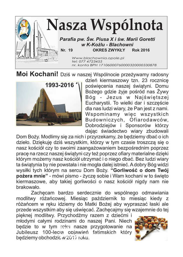 Nasza Wspólnota Parafia pw. Św. Piusa X i św. Marii Goretti w K-Koźlu - Blachowni Nr. 19 OKRES ZWYKŁY Rok 2016 Www.blachownia.opole.pl tel: 077 4723455 nr. konta BPH 17106000760000320000330878 Moi Kochani! Dziś w naszej Wspólnocie przeżywamy radosny dzień kiermaszowy tzn. 23 rocznicę 1993-2016 poświęcenia naszej świątyni. Domu Bożego gdzie żyje pośród nas Żywy Bóg - Jezus w Najświętszej Eucharystii. To wielki dar i szczęście dla nas ludzi wiary, że Pan jest z nami. Wspominamy więc wszystkich B u d o w n i c z y c h , O f i a r o d a w c ó w, Dobrodziejów i Sponsorów którzy dając świadectwo wiary zbudowali Dom Boży. Modlimy się za nich i przyrzekamy, że będziemy dbać o ich dzieło. Dziękuję dziś wszystkim, którzy w tym czasie troszczą się o nasz kościół czy to swoimi zaangażowaniem bezpośrednim poprzez pracę na rzecz naszej świątyni czy też poprzez ofiary materialne dzięki którym możemy nasz kościół utrzymać i o niego dbać. Bez ludzi wiary ta świątynia by nie powstała i nie mogła dalej istnieć. A dobry Bóg widzi wysiłki tych którym na sercu Dom Boży. “Gorliwość o dom Twój pożera mnie” - mówi pismo - życzę sobie i Wam kochani w to święto kiermaszowe, aby takiej gorliwości o nasz kościół nigdy nam nie brakowało. Zachęcam bardzo serdecznie do wspólnego odmawiania modlitwy różańcowej. Miesiąc październik to miesiąc kiedy z różańcem w ręku idziemy do Matki Bożej aby wypraszać łaski ale przede wszystkim aby się uświęcać. Zachęcajmy się wzajemnie do tej pięknej modlitwy. Przychodźmy razem z dziećmi i młodymi całymi rodzinami do naszej Pani. Niech będzie to w tym roku nasze przygotowanie na ŚDM Jubileusz 100-lecia objawień fatimskich który Hradiste - K-Koźle będziemy obchodzićUherske w 2017 roku. Intencje mszalne od 02-16.10.2016 PONIEDZIAŁEK 03.10.2016 7.30 - I Za + Krzysztofa Hus (p) II Za + ojca Stefana + brata Jana ++ z rodziny Barabasz i Uchman + Jadwigę i Agnieszkę. 17.30 - Modlitwa Różańcowa 18.00 - Za śp. Wojciecha Osóbka w 1 rocz. śmierci + teścia Bronisława Wrzecionowskiego w 14 rocz. śmierci. ----------------------------------------------------------------------------------------------------------WTOREK 04.10.2016 św. Franciszka z Asyżu 7.30 - Za + Renatę Wrzecion od matki chrzestnej z rodziną. 17.30 - Modlitwa Różańcowa i Nowenna do MBNP 18.00 - Msza św. Nowennowa 1. W int. dobrodziejów, ofiarodawców naszej Parafii 2. Przez wstawiennictwo MBNP dziękując za otrzymane łaski prosząc o dalsze błog. Boże, zdrowie i opiekę w rodzinie w p. int. 3. Przez wstawiennictwo MBNP dziękując za otrzymane łaski prosząc o dalsze błog. Boże, zdrowie i opiekę w int. Anny Czepul. 4. Za + męża, ojca i dziadka Herberta Szwedka ++ jego rodziców i teściów ++ ich córki, synów, synowe i zięciów, za ++ z rodzin Szwedka i Tiszbirek. 5. Za + Antoniego Sęga od sąsiadów. 6. Za + Stanisława Grodzki w I rocz. śmierci ++ rodziców ++ Ryszarda i Jana Kowalczyk. 7. Do MBNP w int. żony, wnuków i prawnuków. --------------------------------------------------------------------------------------------------ŚRODA 14.10.2016 św. Faustyny Kowalskiej 7.30 - Nowenna do św. Józefa W int. chorych, emerytów, rencistów, samotnych i bezrobotnych naszej Parafii 17.30 - Modlitwa Różańcowa. 18.00 - Za + ojca Richarda Bleischwitz ------------------------------------------------------------------------------------------------I CZWARTEK MIESIĄCA 15.10.2016 17.00 - GODZINA ŚWIĘTA - modlimy się o nowe powołania kapłańskie i zakonne 17.30 - Modlitwa Różańcowa 18.00 - I Za + Krzysztofa Hus od rodziny Szydłowskich z Tarnowa II Za ++ rodz. Apolonię i Franciszka Kulińskich + brata Teodora ++ z pokr. ---------------------------------------------------------------------------------------------------I PIĄTEK MIESIĄCA 07.10.2016 NMP RÓŻAŃCOWEJ 7.30 - Do NSPJ w int. Czcicieli ++ i żyjących 9.00 - odwiedziny chorych Blachownia I, ul. Przyjaźni i Lenartowice 15.00 - KORONKA DO BOŻEGO MIŁOSIERDZIA 17.00 - Msza św. szkolna. Za + Engelberta Bienia ++ rodziców, teściów, rodzeństwo ++ z rodzin Kubicki i Bienia. 17.30 - Modlitwa Różańcowa 19.00 - Msza św. pierwszopiątkowa dla młodzieży z III klasy gimnazjum i młodzieży starszej. ---------------------------------------------------------------------------------------------------SOBOTA 08.10.2016 7.30 - Do Matki Boskiej Różańcowej w int. Róż Różańcowych naszej Parafii 12.00 - ślub rzymski: Klaudia Kulesa i Dawid Föger 17.00 - okazja do sakramentu pokuty i pojednania 17.30 - Modlitwa Różańcowa 18.00 - Za + męża Krzysztofa Waszczyk ---------------------------------------------------------------------------------------------------- XXVIII NIEDZIELA ZWYKŁA - 09.10.2016 7.30 - Za + Czesława w dniu jego urodzin + mamę Mariannę i ojca Piotra. 8.45 - w j. niem. Za ++ rodz. Mieczysławę i Tadeusza Makowskich ++ z pokr. 10.00 - Za ++ rodz. Martę i Jana Szymaniec ++ Różę i Edwarda Kordys ++ siostry Elżbietę i Hildegardę + Annę Popek + brata Jana + zięcia Roberta 3 szwagrów i dusze w czyśćcu cierpiące. 11.30 - Przez wstawiennictwo MBNP dziękując za otrzymane łaski prosząc o dalsze błog. Boże, zdrowie i opiekę w int. Agnieszki i Przemysława Olejnik w 10 rocz. ślubu oraz w int. dzieci i całej rodziny. 15.15 - Modlitwa Różańcowa 16.00 - Za Parafian. -------------------------------------------------------------------------------------------------PONIEDZIAŁEK 10.10.2016 7.30 - Przez wstawiennictwo Matki Bożej Różańcowej za ++ i żyjących członków Róży Różańcowej św. Józefa. 17.30 - Modlitwa Różańcowa 18.00 - I Za ++ rodz. Helenę i Józefa Kabała + brata Stefana ++ z pokr. II Za + Antoniego Sęga w 30 dzień po śmierci. -----------------------------------------------------------------------------------------------------------------WTOREK 11.10.2016 ś