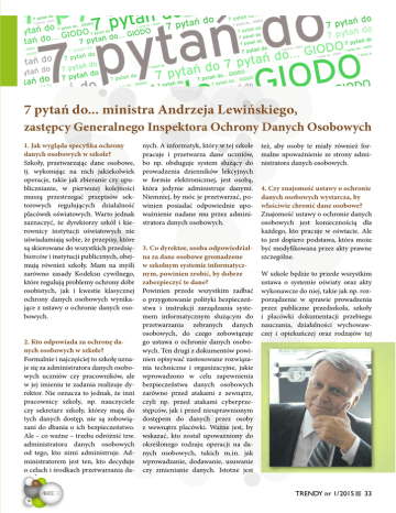7 pytań do... ministra Andrzeja Lewińskiego, zastępcy Generalnego Inspektora Ochrony Danych Osobowych 1. Jak wygląda specyfika ochrony danych osobowych w szkole? Szkoły, przetwarzając dane osobowe, tj. wykonując na nich jakiekolwiek operacje, takie jak zbieranie czy upublicznianie, w pierwszej kolejności muszą przestrzegać przepisów sektorowych regulujących działalność placówek oświatowych. Warto jednak zaznaczyć, że dyrektorzy szkół i kierownicy instytucji oświatowych nie uświadamiają sobie, że przepisy, które są skierowane do wszystkich przedsiębiorców i instytucji publicznych, obejmują również szkoły. Mam na myśli zarówno zasady Kodeksu cywilnego, które regulują problemy ochrony dóbr osobistych, jak i kwestie klasycznej ochrony danych osobowych wynikające z ustawy o ochronie danych osobowych. 2. Kto odpowiada za ochronę danych osobowych w szkole? Formalnie i najczęściej to szkołę uznaje się za administratora danych osobowych uczniów czy pracowników, ale w jej imieniu te zadania realizuje dyrektor. Nie oznacza to jednak, że inni pracownicy szkoły, np. nauczyciele czy sekretarz szkoły, którzy mają do tych danych dostęp, nie są zobowiązani do dbania o ich bezpieczeństwo. Ale – co ważne – trzeba odróżnić tzw. administratora danych osobowych od tego, kto nimi administruje. Administratorem jest ten, kto decyduje o celach i środkach przetwarzania da- nych. A informatyk, który w tej szkole pracuje i przetwarza dane uczniów, bo np. obsługuje system służący do prowadzenia dzienników lekcyjnych w formie elektronicznej, jest osobą, która jedynie administruje danymi. Niemniej, by móc je przetwarzać, powinien posiadać odpowiednie upoważnienie nadane mu przez administratora danych osobowych. 3. Co dyrektor, osoba odpowiedzialna za dane osobowe gromadzone w szkolnym systemie informatycznym, powinien zrobić, by dobrze zabezpieczyć te dane? Powinien przede wszystkim zadbać o przygotowanie polityki bezpieczeństwa i instrukcji zarządzania systemem informatycznym służącym do przetwarzania zebranych danych osobowych, do czego zobowiązuje go ustawa o ochronie danych osobowych. Ten drugi z dokumentów powinien opisywać zastosowane rozwiązania techniczne i organizacyjne, jakie wprowadzono w celu zapewnienia bezpieczeństwa danych osobowych zarówno przed atakami z zewnątrz, czyli np. przed atakami cyberprzestępców, jak i przed nieuprawnionym dostępem do danych przez osoby z wewnątrz placówki. Ważne jest, by wskazać, kto został upoważniony do określonego rodzaju operacji na danych osobowych, takich m.in. jak wprowadzanie, dodawanie, usuwanie czy zmienianie danych. Istotne jest też, aby osoby te miały również formalne upoważnienie ze strony administratora danych osobowych. 4. Czy znajomość ustawy o ochronie danych osobowych wystarcza, by właściwie chronić dane osobowe? Znajomość ustawy o ochronie danych osobowych jest koniecznością dla każdego, kto pracuje w oświacie. Ale to jest dopiero podstawa, która może być modyfikowana przez akty prawne szczególne. W szkole będzie to przede wszystkim ustawa o systemie oświaty oraz akty wykonawcze do niej, takie jak np. rozporządzenie w sprawie prowadzenia przez publiczne przedszkola, szkoły i placówki dokumentacji przebiegu nauczania, działalności wychowawczej i opiekuńczej oraz rodzajów tej TRENDY nr 1/2015 33 7 pytań do... Andrzeja Lewińskiego, zastępcy GIODO dokumentacji, czy też rozporządzenie w sprawie warunków i sposobów oceniania, klasyfikowania i promowania uczniów i słuchaczy oraz przeprowadzania sprawdzianów i egzaminów w szkołach publicznych. 5. Czy rodzic może zakazać np. umieszczenia zdjęcia dziecka w gazetce szkolnej lub stronie internetowej placówki? Czy szkoła każdorazowo powinna uzyskiwać zgodę na publikację zdjęcia dziecka? Upublicznienie wizerunku dziecka lub informacji o dziecku powinno się odbywać tylko wtedy, gdy zgodę na to wyrażą jego rodzice bądź opiekunowie prawni. Należy pamiętać, że niektóre informacje dotyczące dzieci mogą być dość wrażliwe z punktu widzenia rodziców czy opiekunów. Zachęcam dyrektorów szkół, by za każdym razem uzyskiwali zgodę na upowszechnienie określonych informacji o dzieciach. Taką zgodę można oczywiście wyrazić np. na cały rok szkolny. 6. Do kogo się zwrócić w przypadku naruszenia przepisów o ochronie danych osobowych? Najpierw najlepiej sytuację wyjaśnić w szkole, ale w przypadku naruszenia przepisów dotyczących ochrony danych osobowych, np. w przypadku nieodpowiedniego zabezpieczenia danych osobowych, które skutkuje dostępem do nich osób do tego nieuprawnionych, zawsze można wnieść skargę do GIODO. W stosunku do szkół nastawiamy się jednak na działalność edukacyjną, a nie represyjną. Dlatego w przypadkach przetwarzania przez nie danych osobowych niezgodnie z prawem Generalny Inspektor wskazuje wymagające usunięcia uchybienia, a w skrajnych sytuacjach może np. zakazać przetwarzania danych. 7. Jakie konsekwencje grożą dyrektorom za nieprzestrzeganie przepisów dotyczących ochrony danych osobowych? Pamiętajmy, że Generalny Inspektor Ochrony Danych Osobowych nie jest organem ścigania – jest przede wszystkim organem kontrolnym. W większości przypadków po prostu doradzamy, w jaki sposób najlepiej zabezpieczyć dane osobowe i wskazujemy, jakie warunki muszą być spełnione, aby dane były przetwarzane zgodnie z prawem. Gdy dyrektor szkoły czy przedszkola nie chce się podporządkować tym zaleceniom, GIODO może wydać decyzję administracyjną – dotyczącą albo zmiany sposobu przetwarzania danych, albo zaprzestania ich przetwarzania. Nie nakładamy wprost kar pieniężnych. Jednak zarówno dyrektorzy placówek oświatowych, jak i inne osoby przetwarzające dane osobowe w jednostkach oświatowych powinny pamiętać o tym, że ustawa o ochronie danych osobowych zawiera także przepisy karne, które prze