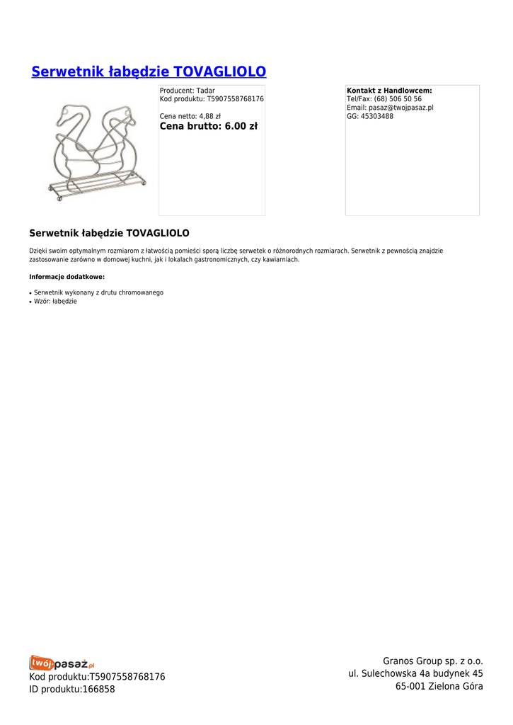 Serwetnik łabędzie TOVAGLIOLO Producent: Tadar Kod produktu: T5907558768176 Cena netto: 4,88 zł Kontakt z Handlowcem: Tel/Fax: (68) 506 50 56 Email: [email protected] GG: 45303488 Cena brutto: 6.00 zł Serwetnik łabędzie TOVAGLIOLO Dzięki swoim optymalnym rozmiarom z łatwością pomieści sporą liczbę serwetek o różnorodnych rozmiarach. Serwetnik z pewnością znajdzie zastosowanie zarówno w domowej kuchni, jak i lokalach gastronomicznych, czy kawiarniach. Informacje dodatkowe: ● ● Serwetnik wykonany z drutu chromowanego Wzór: łabędzie Kod produktu:T5907558768176 ID produktu:166858 Granos Group sp. z o.o. ul. Sulechowska 4a budynek 45 65-001 Zielona Góra