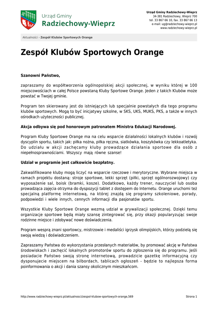 Urząd Gminy Radziechowy-Wieprz 34-381 Radziechowy, Wieprz 700 tel. 33 867 66 10, fax. 33 867 66 13 e-mail: [email protected] www.radziechowy-wieprz.pl Aktualności › Zespół Klubów Sportowych Orange Zespół Klubów Sportowych Orange Szanowni Państwo, zapraszamy do współtworzenia ogólnopolskiej akcji społecznej, w wyniku której w 100 miejscowościach w całej Polsce powstaną Kluby Sportowe Orange. Jeden z takich Klubów może powstać w Twojej gminie. Program ten skierowany jest do istniejących lub specjalnie powstałych dla tego programu klubów sportowych. Mogą to być inicjatywy szkolne, w SKS, UKS, MUKS, PKS, a także w innych ośrodkach użyteczności publicznej. Akcja odbywa się pod honorowym patronatem Ministra Edukacji Narodowej. Program Kluby Sportowe Orange ma na celu wsparcie działalności lokalnych klubów i rozwój dyscyplin sportu, takich jak: piłka nożna, piłka ręczna, siatkówka, koszykówka czy lekkoatletyka. Do udziału w akcji zachęcamy kluby prowadzące działania sportowe dla osób z niepełnosprawnościami. Wszyscy mają równe szanse! Udział w programie jest całkowicie bezpłatny. Zakwalifikowane kluby mogą liczyć na wsparcie rzeczowe i merytoryczne. Wybrane miejsca w ramach projektu dostaną: stroje sportowe, lekki sprzęt (piłki, sprzęt ogólnorozwojowy) czy wyposażenie sal, boisk (bramki, kosze). Dodatkowo, każdy trener, nauczyciel lub osoba prowadząca zajęcia otrzyma do dyspozycji tablet z dostępem do Internetu. Orange uruchomi też specjalną platformę internetową, na której znajdą się programy szkoleniowe, porady, podpowiedzi i wiele innych, cennych informacji dla pasjonatów sportu. Wszystkie Kluby Sportowe Orange wezmą udział w grywalizacji społecznej. Dzięki temu organizacje sportowe będą miały szansę zintegrować się, przy okazji popularyzując swoje rodzinne miejsce i zdobywać nowe doświadczenia. Program wesprą znani sportowcy, mistrzowie i medaliści igrzysk olimpijskich, którzy podzielą się swoją wiedzą i doświadczeniem. Zapraszamy Państwa do wykorzystania przesłanych materiałów, by promować akcję w Państwa środowiskach i zachęcić lokalnych promotorów sportu do zgłoszenia się do programu. Jeśli posiadacie Państwo swoją stronę internetową, prowadzicie gazetkę informacyjną czy dysponujecie miejscem na bilbordach, tablicach ogłoszeń - będzie to najlepsza forma poinformowania o akcji i dania szansy okolicznym mieszkańcom. http://www.radziechowy-wieprz.pl/aktualnosci/zespol-klubow-sportowych-orange,569 Strona 1 Urząd Gminy Radziechowy-Wieprz 34-381 Radziechowy, Wieprz 700 tel. 33 867 66 10, fax. 33 867 66 13 e-mail: [email protected] www.radziechowy-wieprz.pl Aktualności › Zespół Klubów Sportowych Orange Więcej informacji oraz przewodnik www.klubysportoweorange.pl. po programie znajdą Państwo na Zachęcamy do kontaktu z nami i skorzystania z chatu online lub telefonu informacyjnego o programie: 510 555 666 (aktywne w dni robocze od godziny 9.00 do 17.00). Pytania można kierować także na adres: [email protected]. Z poważaniem, Zespół Klubów Sportowych Orange http://www.radziechowy-wieprz.pl/aktualnosci/zespol-klubow-sportowych-orange,569 Strona 2