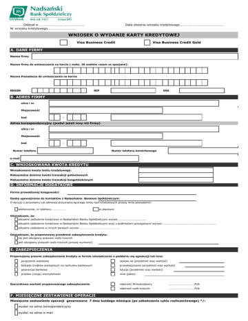 …………….Oddział w ………………………………………………. Nr wniosku kredytowego……………………………. Data złożenia wniosku kredytowego…………………………………………….. WNIOSEK O WYDANIE KARTY KREDYTOWEJ Visa Business Credit Visa Business Credit Gold A. DANE FIRMY Nazwa firmy Nazwa firmy do umieszczenia na karcie ( maks. 26 znaków razem ze spacjami): Nazwa Posiadacza do umieszczenia na karcie REGON NIP KRS B. ADRES FIRMY ulica i nr Miejscowość kod - Adres korespondencyjny (podać jeżeli inny niż firmy) ulica i nr Miejscowość kod - Numer telefonu Numer telefonu komórkowego e-mail C. WNIOSKOWANA KWOTA KREDYTU Wnioskowana kwota limitu kredytowego: Maksymalna dzienna kwota transakcji gotówkowych Maksymalna dzienna kwota transakcji bezgotówkowych D. INFORMACJE DODATKOWE Forma prowadzonej księgowości: Osoba upoważniona do kontaktów z Nadsańskim Bankiem Spółdzielczym: O decyzji o przyznaniu lub odmowie przyznania łącznego limitu kart kredytowych proszę mnie powiadomić: telefonicznie, nr telefonu………………… w placówce Oświadczam, że: aktualne zadłużenie kredytowe w Nadsańskim Banku Spółdzielczym wynosi…………………………………. aktualne zadłużenie kredytowe w Nadsańskim Banku Spółdzielczym wraz z podmiotami powiązanymi wynosi:………………………………………………………………… aktualne zadłużenie w innych bankach wynosi:………………………………………………. Oświadczam, że proponowany przedmiot zabezpieczenia kredytu: nie jest obciążony prawami osób trzecich jest obciążony prawami osób trzecich (proszę wymienić) E. ZABEZPIECZENIA Proponujemy prawne zabezpieczenie kredytu w formie oświadczenia o poddaniu się egzekucji lub inne: poręczenie wekslowe zastaw na (przedmiot oraz wartość) blokada środków pieniężnych na rachunku bankowym przewłaszczenie (przedmiot oraz wartość) gwarancja bankowa kaucja (przedmiot oraz wartość) przelew (cesja) wierzytelności inne (jakie): Szacunkowa wartość proponowanego zabezpieczenia: własność Wnioskodawcy ………………………………PLN własność osób trzecich ………………………………PLN F. MIESIĘCZNE ZESTAWIENIE OPERACJI Miesięczne zestawienie operacji generowane 7 dnia każdego miesiąca (po zakończenia cyklu rozliczeniowego) */: wysłać na adres korespondencyjny wysłać na adres e-mail Informujemy, że w przypadku nie dokonania żadnej operacji w danym cyklu rozliczeniowym oraz braku zadłużenia wobec Banku z tytułu posługiwania się kartą Zestawienie operacji nie będzie generowane i przesyłane. G. DO WNIOSKU ZAŁACZAM/Y: 1) dokumenty formalno-prawne tj. dokumenty założycielskie: KRS, zaświadczenie o wpisie do ewidencji działalności gospodarczej lub odpis z rejestru właściwego dla formy prawnej Wnioskodawcy, 2) zaświadczenie*/oświadczenie* o nie zaleganiuz płatnościami na rzecz ZUS, 3) zaświadczenie*/oświadczenie* o nie zaleganiu z płatnościami na rzecz US, 4) kserokopię dowodu osobistego bądź innego dokumentu zwierającego zdjęcie i numer PESEL Wnioskodawcy i Użytkowników karty, 5) sprawozdanie finansowe z 2 pełnych lat obrotowych i bieżącego okresu 6) inne dokumenty (wymienić):…………………………………………………………………………………………………………………………………………………………………………………………. H. OŚWIADCZENIA 1. Oświadczam, że toczy / nie toczy* się wobec mnie/firmy postępowanie sądowe cywilne/karne* w sprawie ................................................................................................................................................ 2. Oświadczam, że zalegam* / nie zalegam*/firma zalega*/ firma nie zalega* ze spłatą zobowiązań wobec Nadsańskiego Banku Spółdzielczego i innych banków. 3. Oświadczam, że jestem / nie jestem* /firma jest*/firma nie jest* udziałowcem Nadsańskiego Banku Spółdzielczego i posiadam .............. udziałów Nadsańskiego Banku Spółdzielczego 4. Upoważniam Nadsański Bank Spółdzielczy do sprawdzenia wiarygodności danych zawartych we wniosku i załączonych dokumentach. 5. W zakresie określonym w art. 2 ust. 1, po spełnieniu warunków określonych w art.15 ustawy z dnia 9 kwietnia 2010 r. o udostępnianiu informacji gospodarczych ( dz. U. Nr 81, poz. 530) upoważniam Nadsański Bank Spółdzielczy do wystąpienia za pośrednictwem Biura Informacji Kredytowej S.A. z siedzibą w Warszawie - Biuro Obsługi Klienta przy ul. Pruszkowskiej 17, 02-119 Warszawa, do biur informacji gospodarczej o ujawnienie informacji gospodarczych dotyczących moich zobowiązań. 6. Oświadczam, że łączą/nie łączą* mnie/firmę* powiązania kapitałowe lub organizacyjne z udziałowcami Nadsańskiego Banku Spółdzielczego , osobami zajmującymi kierownicze stanowiska w tym Banku lub pełniącymi funkcje w Radzie Nadzorczej Banku bądź Zarządzie Banku (w przypadku występowania w/w powiązań proszę podać ich charakter ze wskazaniem funkcji pełnionej we władzach Banku przez osobę powiązaną z Wnioskodawcą). ..................................................................................................................................... 7. Czy istnieją powiązania organizacyjne, osobowe i kapitałowe Wnioskodawcy z innymi podmiotami? TAK NIE Jeśli TAK - proszę podać nazwę podmiotu gospodarczego, wysokość udziałów oraz czy posiada kredyt w Nadsańskim Banku Spółdzielczym ………………………………………………………………………………………………………………………………………………………………………………………………………………………. 8. Oświadczam pod rygorem odpowiedzialności karnej przewidzianej w art. 297 § 1 Kodeksu karnego, że informacje podane w tym wniosku są zgodne