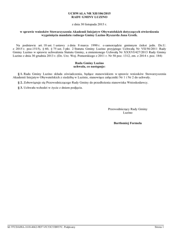 UCHWAŁA NR XII/106/2015 RADY GMINY LUZINO z dnia 30 listopada 2015 r. w sprawie wniosków Stowarzyszenia Akademii Inicjatyw Obywatelskich dotyczących stwierdzenia wygaśnięcia mandatu radnego Gminy Luzino Ryszarda Jana Groth. Na podstawie art. 18 ust. 1 ustawy z dnia 8 marca 1990 r. o samorządzie gminnym (tekst jedn. Dz.U. z 2015 r. poz.1515), § 60, § 75 ust. 3 pkt. 2 Statutu Gminy Luzino przyjętego Uchwałą Nr VII/56/2011 Rady Gminy Luzino w sprawie uchwalenia Statutu Gminy, a zmienionego Uchwałą Nr XXXVI/427/2013 Rady Gminy Luzino z dnia 30 grudnia 2013 r. (Dz. Urz. Woj. Pomorskiego z 2011 r. Nr 58 poz. 1312, zm. z 2014 r. poz. 184) Rada Gminy Luzino uchwala, co następuje: § 1. Rada Gminy Luzino składa oświadczenia, będące stanowiskiem w sprawie wniosków Stowarzyszenia Akademii Inicjatyw Obywatelskich z siedzibą w Luzinie, stanowiące załączniki Nr 1 i Nr 2 do uchwały. § 2. Zobowiązuje się Przewodniczącego Rady Gminy do przedłożenia stanowiska Wnioskodawcy. § 3. Uchwała wchodzi w życie z dniem podjęcia. Przewodniczący Rady Gminy Luzino Bartłomiej Formela Id: 97CDA08A-1610-4662-9EF7-FC53C53B937C. Podpisany Strona 1 Załącznik Nr 1 do Uchwały Nr XII/106/2015 Rady Gminy Luzino z dnia 30 listopada 2015 r. Oświadczenie W dniu 4 października 2015 roku, za pośrednictwem elektronicznej Platformy Usług Administracji Publicznej wpłynął do Rady Gminy Luzino wniosek Stowarzyszenia Akademia Inicjatyw Lokalnych w Luzinie o podjęcie uchwały w sprawie wygaśnięcia mandatu radnego Rady Gminy Luzino – Ryszarda Jana Groth. We wniosku, zarząd stowarzyszenia uzasadnia swoje stanowisko faktem, iŜ radny ten jest jednocześnie członkiem komisji rewizyjnej Banku Spółdzielczego w Krokowej, co zdaniem wnioskodawcy jest niezgodne z art.383 §1 pkt 5 ustawy z dnia 5 stycznia 2011 roku Kodeks wyborczy w związku z art.24f ustawy z dnia 8 marca 1990 roku o samorządzie gminnym. Po przeanalizowaniu treści zapisów w Krajowym Rejestrze Sądowym, dotyczących przedmiotowego banku okazało się, Ŝe Bank Spółdzielczy w Krokowej nie posiada w ogóle takiego organu jak komisja rewizyjna, a wobec tego, radny Ryszard Jan Groth, nie moŜe być członkiem komisji rewizyjnej Banku Spółdzielczego w Krokowej, bowiem w jego strukturach nie funkcjonuje taki organ, i w związku z tym, Rada Gminy Luzino uznaje wniosek niniejszy jako bezprzedmiotowy. Reasumując, Rada Gminy Luzino uznaje wniosek Stowarzyszenia Akademia Inicjatyw Obywatelskich w Luzinie, w sprawie stwierdzenia wygaśnięcia mandatu radnego Ryszarda Jana Groth, za bezprzedmiotowy. Id: 97CDA08A-1610-4662-9EF7-FC53C53B937C. Podpisany Strona 2 Załącznik Nr 2 do Uchwały Nr XII/106/2015 Rady Gminy Luzino z dnia 30 listopada 2015 r. Oświadczenie W dniu 4 października 2015 roku, za pośrednictwem elektronicznej Platformy Usług Administracji Publicznej wpłynął do Rady Gminy Luzino wniosek Stowarzyszenia Akademia Inicjatyw Lokalnych w Luzinie o podjęcie uchwały w sprawie wygaśnięcia mandatu radnego Rady Gminy Luzino – Ryszarda Jana Groth. We wniosku, zarząd stowarzyszenia uzasadnia swoje stanowisko faktem, iŜ radny ten jest jednocześnie Prezesem Stowarzyszenia Ochotnicza StraŜ PoŜarna w Zelewie, która prowadzi działalność z wykorzystaniem mienia komunalnego gminy, co zdaniem wnioskodawcy jest niezgodne z art.383 §1 pkt 5 ustawy z dnia 5 stycznia 2011 roku Kodeks wyborczy w związku z art.24f ustawy z dnia 8 marca 1990 roku o samorządzie gminnym. Rada Gminy Luzino, zajmując stanowisko w sprawie wniosku, po zapoznaniu się z obowiązującym stanem prawnym, stwierdziła co następuje: Ochotnicza StraŜ PoŜarna w Zelewie jest stowarzyszeniem zwykłym zarejestrowanym w Krajowym Rejestrze Sądowym, nie prowadzącym działalności gospodarczej. Korzysta z mienia gminnego oddanego w uŜyczenie, a mianowicie z części budynku komunalnego połoŜonego w Zelewie przy ul.Długiej 31, tj. z garaŜu przeznaczonego dla samochodu i sprzętu poŜarniczego oraz pomieszczenia gospodarczego znajdującego się przy tym garaŜu. Natomiast pozostała część budynku komunalnego stanowi świetlicę wiejską, którą w imieniu gminy zarządza Urząd Gminy. Wynajmowi podlega ta część budynku komunalnego, która nie jest oddana w uŜyczenie OSP. Wynajmem świetlicy wiejskiej zajmuje się osoba, która posiada do tego stosowne upowaŜnienie Wójta Gminy. Ochotnicza StraŜ PoŜarna w Zelewie nie posiada w swoim uŜytkowaniu pomieszczeń stanowiących własność gminy, która podlega wynajmowi, a ponadto naleŜy zaznaczyć, Ŝe nie prowadzi takiego wynajmu, gdyŜ jak wyŜej wskazano nie prowadzi działalności gospodarczej. Jej statutowym celem jest m.in. realizacja zadań związanych z zapobieganiem poŜarom i innym miejscowym zagroŜeniom, działaniem na rzecz ochrony środowiska, bez prowadzenia działalności zarobkowej. Ochotnicza StraŜ PoŜarna swoją działalnością statutową wspiera realizację zadań gminy, współdziałając w zakresie ochrony przeciwpoŜarowej. W związku z tym, Ŝe nie prowadzi działalności gospodarczej, w tym działalności gospodarczej na własny rachunek lub wspólnie z innymi osobami z wykorzystaniem mienia komunalnego, nie ma przeszkód prawnych, aby Pan Ryszard Jan Groth, radny Gminy Luzino, pełnił funkcję Prezesa Ochotniczej StraŜy PoŜarnej w Zelewie. Zgodnie bowiem, z obowiązującymi przepisami tj. z art. 383 § 1 pkt 5 ustawy z dnia 05 stycznia 2011 roku - Kodeks wyborczy (Dz.U. Nr 21 poz.112 z póź. zm.) mandat radnego wygasa w przypadku naruszenia ustawowego zakazu łączenia mandatu radnego z wykonywaniem określonych, w odrębnych przepisach funkcji lub działalności. W sytuacji poruszonej we wniosku, chodzi o przepisy ustawy z dnia 08 marca 1990 roku o samorządzie gminnym (tekst jedn. Dz.U. z 2015r. poz.1515), a mianowicie o art.24f ust.1 który stanowi, Ŝe radni nie mogą prowadzić działalności gospodarczej na własny rachunek lub wspólnie z innymi osobami