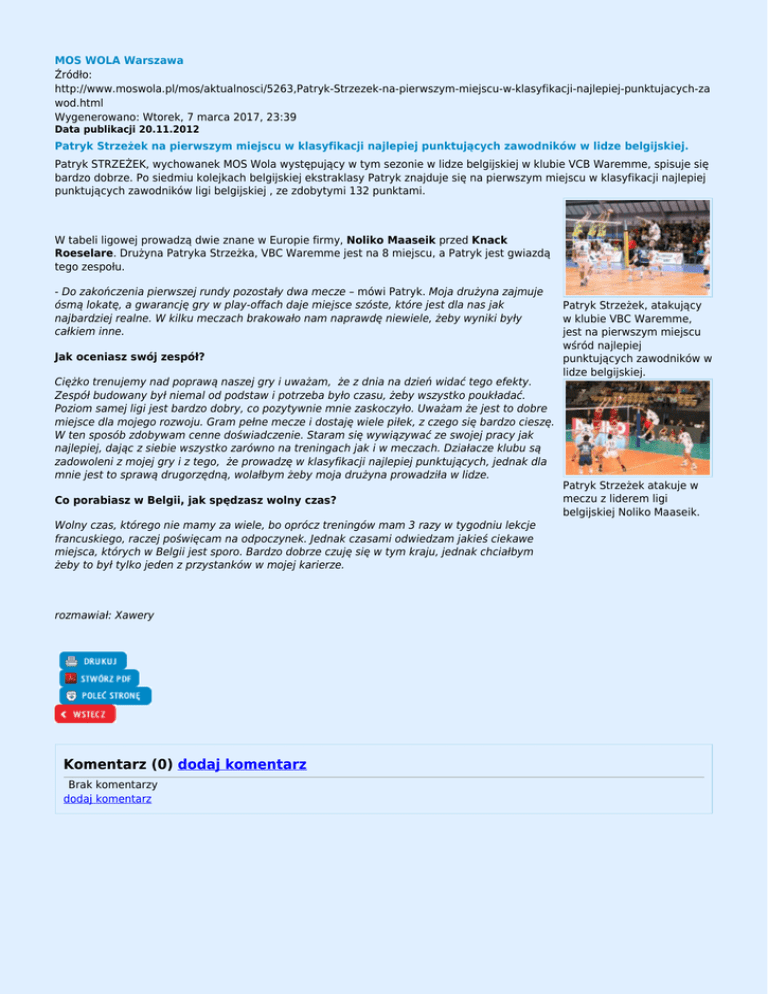 MOS WOLA Warszawa Źródło: http://www.moswola.pl/mos/aktualnosci/5263,Patryk-Strzezek-na-pierwszym-miejscu-w-klasyfikacji-najlepiej-punktujacych-za wod.html Wygenerowano: Wtorek, 7 marca 2017, 23:39 Data publikacji 20.11.2012 Patryk Strzeżek na pierwszym miejscu w klasyfikacji najlepiej punktujących zawodników w lidze belgijskiej. Patryk STRZEŻEK, wychowanek MOS Wola występujący w tym sezonie w lidze belgijskiej w klubie VCB Waremme, spisuje się bardzo dobrze. Po siedmiu kolejkach belgijskiej ekstraklasy Patryk znajduje się na pierwszym miejscu w klasyfikacji najlepiej punktujących zawodników ligi belgijskiej , ze zdobytymi 132 punktami. W tabeli ligowej prowadzą dwie znane w Europie firmy, Noliko Maaseik przed Knack Roeselare. Drużyna Patryka Strzeżka, VBC Waremme jest na 8 miejscu, a Patryk jest gwiazdą tego zespołu. - Do zakończenia pierwszej rundy pozostały dwa mecze – mówi Patryk. Moja drużyna zajmuje ósmą lokatę, a gwarancję gry w play-offach daje miejsce szóste, które jest dla nas jak najbardziej realne. W kilku meczach brakowało nam naprawdę niewiele, żeby wyniki były całkiem inne. Jak oceniasz swój zespół? Ciężko trenujemy nad poprawą naszej gry i uważam, że z dnia na dzień widać tego efekty. Zespół budowany był niemal od podstaw i potrzeba było czasu, żeby wszystko poukładać. Poziom samej ligi jest bardzo dobry, co pozytywnie mnie zaskoczyło. Uważam że jest to dobre miejsce dla mojego rozwoju. Gram pełne mecze i dostaję wiele piłek, z czego się bardzo cieszę. W ten sposób zdobywam cenne doświadczenie. Staram się wywiązywać ze swojej pracy jak najlepiej, dając z siebie wszystko zarówno na treningach jak i w meczach. Działacze klubu są zadowoleni z mojej gry i z tego, że prowadzę w klasyfikacji najlepiej punktujących, jednak dla mnie jest to sprawą drugorzędną, wolałbym żeby moja drużyna prowadziła w lidze. Co porabiasz w Belgii, jak spędzasz wolny czas? Wolny czas, którego nie mamy za wiele, bo oprócz treningów mam 3 razy w tygodniu lekcje francuskiego, raczej poświęcam na odpoczynek. Jednak czasami odwiedzam jakieś ciekawe miejsca, których w Belgii jest sporo. Bardzo dobrze czuję się w tym kraju, jednak chciałbym żeby to był tylko jeden z przystanków w mojej karierze. rozmawiał: Xawery Komentarz (0) dodaj komentarz Brak komentarzy dodaj komentarz Patryk Strzeżek, atakujący w klubie VBC Waremme, jest na pierwszym miejscu wśród najlepiej punktujących zawodników w lidze belgijskiej. Patryk Strzeżek atakuje w meczu z liderem ligi belgijskiej Noliko Maaseik.
