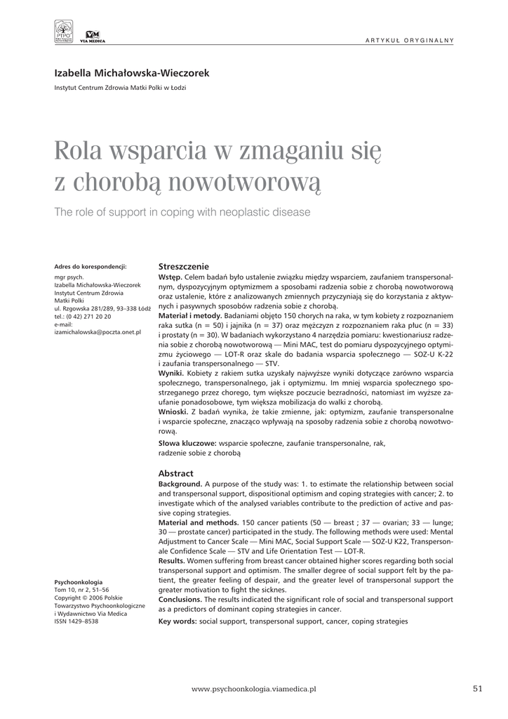 ARTYKUŁ ORYGINALNY Izabella Michałowska-Wieczorek Instytut Centrum Zdrowia Matki Polki w Łodzi Rola wsparcia w zmaganiu się z chorobą nowotworową The role of support in coping with neoplastic disease Adres do korespondencji: Streszczenie mgr psych. Izabella Michałowska-Wieczorek Instytut Centrum Zdrowia Matki Polki ul. Rzgowska 281/289, 93–338 Łódź tel.: (0 42) 271 20 20 e-mail: [email protected] Wstęp. Celem badań było ustalenie związku między wsparciem, zaufaniem transpersonalnym, dyspozycyjnym optymizmem a sposobami radzenia sobie z chorobą nowotworową oraz ustalenie, które z analizowanych zmiennych przyczyniają się do korzystania z aktywnych i pasywnych sposobów radzenia sobie z chorobą. Materiał i metody. Badaniami objęto 150 chorych na raka, w tym kobiety z rozpoznaniem raka sutka (n = 50) i jajnika (n = 37) oraz mężczyzn z rozpoznaniem raka płuc (n = 33) i prostaty (n = 30). W badaniach wykorzystano 4 narzędzia pomiaru: kwestionariusz radzenia sobie z chorobą nowotworową — Mini MAC, test do pomiaru dyspozycyjnego optymizmu życiowego — LOT-R oraz skale do badania wsparcia społecznego — SOZ-U K-22 i zaufania transpersonalnego — STV. Wyniki. Kobiety z rakiem sutka uzyskały najwyższe wyniki dotyczące zarówno wsparcia społecznego, transpersonalnego, jak i optymizmu. Im mniej wsparcia społecznego spostrzeganego przez chorego, tym większe poczucie bezradności, natomiast im wyższe zaufanie ponadosobowe, tym większa mobilizacja do walki z chorobą. Wnioski. Z badań wynika, że takie zmienne, jak: optymizm, zaufanie transpersonalne i wsparcie społeczne, znacząco wpływają na sposoby radzenia sobie z chorobą nowotworową. Słowa kluczowe: wsparcie społeczne, zaufanie transpersonalne, rak, radzenie sobie z chorobą Abstract Psychoonkologia Tom 10, nr 2, 51–56 Copyright © 2006 Polskie Towarzystwo Psychoonkologiczne i Wydawnictwo Via Medica ISSN 1429–8538 Background. A purpose of the study was: 1. to estimate the relationship between social and transpersonal support, dispositional optimism and coping strategies with cancer; 2. to investigate which of the analysed variables contribute to the prediction of active and passive coping strategies. Material and methods. 150 cancer patients (50 — breast ; 37 — ovarian; 33 — lunge; 30 — prostate cancer) participated in the study. The following methods were used: Mental Adjustment to Cancer Scale — Mini MAC, Social Support Scale — SOZ-U K22, Transpersonale Confidence Scale — STV and Life Orientation Test — LOT-R. Results. Women suffering from breast cancer obtained higher scores regarding both social transpersonal support and optimism. The smaller degree of social support felt by the patient, the greater feeling of despair, and the greater level of transpersonal support the greater motivation to fight the sicknes. Conclusions. The results indicated the significant role of social and transpersonal support as a predictors of dominant coping strategies in cancer. Key words: social support, transpersonal support, cancer, coping strategies www.psychoonkologia.viamedica.pl 51 Psychoonkologia 2006, tom 10, nr 2 Wstęp Tabela 1. Charakterystyka socjodemograficzna badanych pacjentów Choroba nowotworowa jest postrzegana jako ciężka choroba zagrażająca życiu, budząca lęk i niepokój. To, jak człowiek radzi sobie z chorobą, zależy od stanu zdrowia, a także od różnych czynników psychologicznych i społecznych. Literatura przedmiotu zwraca uwagę między innymi na znaczenie predyspozycji osobowościowych, rolę lęku oraz na strategie radzenia sobie z chorobą. Również duży wpływ na proces zmagania się z chorobą ma otoczenie chorego, a więc rodzina, przyjaciele oraz personel medyczny, które daje choremu wsparcie. Wsparcie społeczne należy do najbardziej zbadanych zasobów odporności na stres, w tym zwłaszcza na stres związany z chorobą. Wsparcie społeczne wyraża zasoby dostarczane przez interakcje z innymi ludźmi [1]. Może mieć ono charakter emocjonalny lub praktyczny. Osoby cierpiące dzięki wsparciu emocjonalnemu mogą się uwolnić od własnych napięć i negatywnych uczuć, wyrazić swoje lęki, obawy, smutek oraz wyzwolić poczucie nadziei [2]. Wsparcie praktyczne to wymiana i udzielanie informacji oraz dawanie rad, które sprzyjają lepszemu zrozumieniu sytuacji, własnego położenia życiowego i problemów. Wsparcie to oznacza także dostarczanie informacji zwrotnych o skuteczności podejmowanych przez osobę wspieraną różnych działań zaradczych, przekazywanie informacji o konkretnych sposobach postępowania oraz formę modelowania skutecznych zachowań zaradczych. Table 1. Sociodemographic characteristics of patients Cel badań Celem przeprowadzonych badań było ustalenie znaczenia różnego rodzaju wsparcia w radzeniu sobie z chorobą nowotworową. Uwzględniono nie tylko spostrzegane wsparcie społeczne, czyli zasoby dostarczane przez inne osoby, lecz także wsparcie ponadosobowe (transpersonalne), co prawdopodobnie ma szczególne znaczenie w obliczu poważnego zagrożenia życia, jakie stwarza choroba nowotworowa. Zasobów wsparcia doszukiwano się również we własnych predyspozycjach osobowościowych, czyli uogólnionych oczekiwaniach wobec przyszłości, określanych pojęciem dyspozycyjnego optymizmu [3]. Wiara w siłę wyższą i przejawiany optymizm, podobnie jak wsparcie społeczne, mogą modyfikować zachowania człowieka. Przyjęto hipotezę, że chorzy deklarujący wyższy poziom wsparcia społecznego, transpersonalnego oraz przejawiający wyższy poziom optymizmu, preferują bardziej aktywne strategie radzenia sobie z chorobą nowotworową. 52 Stan cywilny n % 18 12,0 Żonaty/mężatka 89 59,3 Rozwiedziony/a 12 8,0 Wdowiec/wdowa 31 20,7 Kawaler/panna Wykształcenie Podstawowe 13 8,7 Zawodowe 20 13,3 Średnie 82 54,7 Wyższe 35 23,3 Wieś 37 24,7 Małe miasto 52 34,7 Duże miasto 61 40,6 Zamieszkanie Materiał i metody Badane g