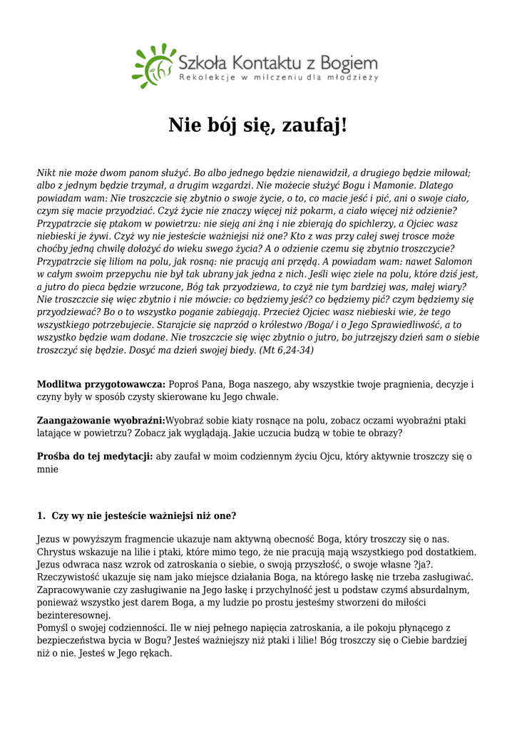 Nie bój się, zaufaj! Nikt nie może dwom panom służyć. Bo albo jednego będzie nienawidził, a drugiego będzie miłował; albo z jednym będzie trzymał, a drugim wzgardzi. Nie możecie służyć Bogu i Mamonie. Dlatego powiadam wam: Nie troszczcie się zbytnio o swoje życie, o to, co macie jeść i pić, ani o swoje ciało, czym się macie przyodziać. Czyż życie nie znaczy więcej niż pokarm, a ciało więcej niż odzienie? Przypatrzcie się ptakom w powietrzu: nie sieją ani żną i nie zbierają do spichlerzy, a Ojciec wasz niebieski je żywi. Czyż wy nie jesteście ważniejsi niż one? Kto z was przy całej swej trosce może choćby jedną chwilę dołożyć do wieku swego życia? A o odzienie czemu się zbytnio troszczycie? Przypatrzcie się liliom na polu, jak rosną: nie pracują ani przędą. A powiadam wam: nawet Salomon w całym swoim przepychu nie był tak ubrany jak jedna z nich. Jeśli więc ziele na polu, które dziś jest, a jutro do pieca będzie wrzucone, Bóg tak przyodziewa, to czyż nie tym bardziej was, małej wiary? Nie troszczcie się więc zbytnio i nie mówcie: co będziemy jeść? co będziemy pić? czym będziemy się przyodziewać? Bo o to wszystko poganie zabiegają. Przecież Ojciec wasz niebieski wie, że tego wszystkiego potrzebujecie. Starajcie się naprzód o królestwo /Boga/ i o Jego Sprawiedliwość, a to wszystko będzie wam dodane. Nie troszczcie się więc zbytnio o jutro, bo jutrzejszy dzień sam o siebie troszczyć się będzie. Dosyć ma dzień swojej biedy. (Mt 6,24-34) Modlitwa przygotowawcza: Poproś Pana, Boga naszego, aby wszystkie twoje pragnienia, decyzje i czyny były w sposób czysty skierowane ku Jego chwale. Zaangażowanie wyobraźni:Wyobraź sobie kiaty rosnące na polu, zobacz oczami wyobraźni ptaki latające w powietrzu? Zobacz jak wyglądają. Jakie uczucia budzą w tobie te obrazy? Prośba do tej medytacji: aby zaufał w moim codziennym życiu Ojcu, który aktywnie troszczy się o mnie 1. Czy wy nie jesteście ważniejsi niż one? Jezus w powyższym fragmencie ukazuje nam aktywną obecność Boga, który troszczy się o nas. Chrystus wskazuje na lilie i ptaki, które mimo tego, że nie pracują mają wszystkiego pod dostatkiem. Jezus odwraca nasz wzrok od zatroskania o siebie, o swoją przyszłość, o swoje własne ?ja?. Rzeczywistość ukazuje się nam jako miejsce działania Boga, na którego łaskę nie trzeba zasługiwać. Zapracowywanie czy zasługiwanie na Jego łaskę i przychylność jest u podstaw czymś absurdalnym, ponieważ wszystko jest darem Boga, a my ludzie po prostu jesteśmy stworzeni do miłości bezinteresownej. Pomyśl o swojej codzienności. Ile w niej pełnego napięcia zatroskania, a ile pokoju płynącego z bezpieczeństwa bycia w Bogu? Jesteś ważniejszy niż ptaki i lilie! Bóg troszczy się o Ciebie bardziej niż o nie. Jesteś w Jego rękach. 2. Starajcie się o królestwo Królestwo Jezusa jest królestwem miłości. Zaprasza nas On dziś do postawienia w centrum naszego dnia troski o miłość. Co to znaczy? Troszczyć się o miłość to nie troszczyć się o nic innego, nie zamartwiać się. W doświadczeniu bezpieczeństwa miłości człowiek ma wszystko, choć zewnętrznie może być nawet ubogi. Nie ma powodu do obaw, do lęku, gdyż Jezus ukazał nam Ojca, który dba o swoje stworzenie. Jak wygląda mój zwykły dzień? Ile czasu poświęcam na odpoczynek i modlitwę? Czy nie jestem czasem więźniem tego świata, który nieustannie musi zarabiać na poczucie własnej wartości? Rozmowa końcowa:z Jezusem o tym co myślałem, czułem w czasie modlitwy Na zakończenie odmów:Ojcze nasz
