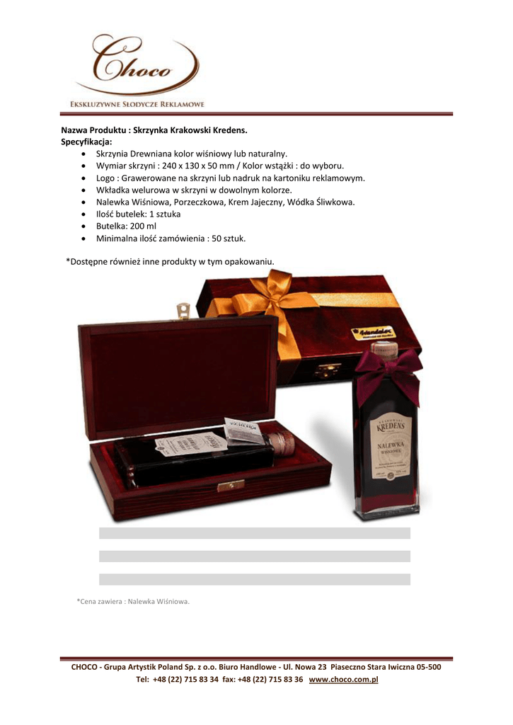 Nazwa Produktu : Skrzynka Krakowski Kredens. Specyfikacja: Skrzynia Drewniana kolor wiśniowy lub naturalny. Wymiar skrzyni : 240 x 130 x 50 mm / Kolor wstążki : do wyboru. Logo : Grawerowane na skrzyni lub nadruk na kartoniku reklamowym. Wkładka welurowa w skrzyni w dowolnym kolorze. Nalewka Wiśniowa, Porzeczkowa, Krem Jajeczny, Wódka Śliwkowa. Ilośd butelek: 1 sztuka Butelka: 200 ml Minimalna ilośd zamówienia : 50 sztuk. *Dostępne również inne produkty w tym opakowaniu. *Cena zawiera : Nalewka Wiśniowa. CHOCO - Grupa Artystik Poland Sp. z o.o. Biuro Handlowe - Ul. Nowa 23 Piaseczno Stara Iwiczna 05-500 Tel: +48 (22) 715 83 34 fax: +48 (22) 715 83 36 www.choco.com.pl