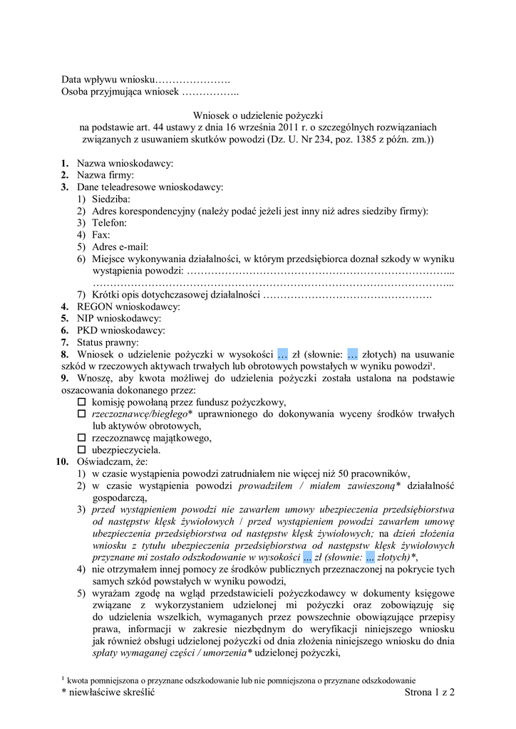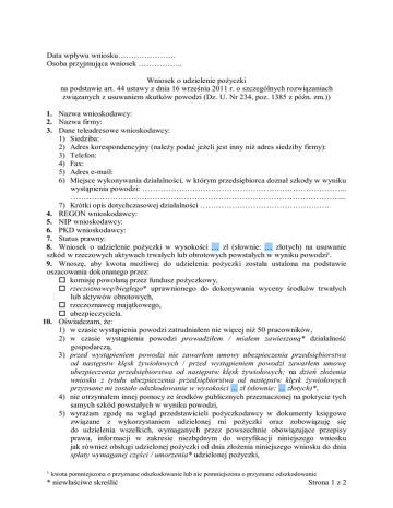 Data wpływu wniosku…………………. Osoba przyjmująca wniosek …………….. Wniosek o udzielenie pożyczki na podstawie art. 44 ustawy z dnia 16 września 2011 r. o szczególnych rozwiązaniach związanych z usuwaniem skutków powodzi (Dz. U. Nr 234, poz. 1385 z późn. zm.)) 1. Nazwa wnioskodawcy: 2. Nazwa firmy: 3. Dane teleadresowe wnioskodawcy: 1) Siedziba: 2) Adres korespondencyjny (należy podać jeżeli jest inny niż adres siedziby firmy): 3) Telefon: 4) Fax: 5) Adres e-mail: 6) Miejsce wykonywania działalności, w którym przedsiębiorca doznał szkody w wyniku wystąpienia powodzi: …………………………………………………………………... …………………………………………………………………………………………... 7) Krótki opis dotychczasowej działalności …………………………………………. 4. REGON wnioskodawcy: 5. NIP wnioskodawcy: 6. PKD wnioskodawcy: 7. Status prawny: 8. Wniosek o udzielenie pożyczki w wysokości … zł (słownie: … złotych) na usuwanie szkód w rzeczowych aktywach trwałych lub obrotowych powstałych w wyniku powodzi¹. 9. Wnoszę, aby kwota możliwej do udzielenia pożyczki została ustalona na podstawie oszacowania dokonanego przez: komisję powołaną przez fundusz pożyczkowy, rzeczoznawcę/biegłego* uprawnionego do dokonywania wyceny środków trwałych lub aktywów obrotowych, rzeczoznawcę majątkowego, ubezpieczyciela. 10. Oświadczam, że: 1) w czasie wystąpienia powodzi zatrudniałem nie więcej niż 50 pracowników, 2) w czasie wystąpienia powodzi prowadziłem / miałem zawieszoną* działalność gospodarczą, 3) przed wystąpieniem powodzi nie zawarłem umowy ubezpieczenia przedsiębiorstwa od następstw klęsk żywiołowych / przed wystąpieniem powodzi zawarłem umowę ubezpieczenia przedsiębiorstwa od następstw klęsk żywiołowych; na dzień złożenia wniosku z tytułu ubezpieczenia przedsiębiorstwa od następstw klęsk żywiołowych przyznane mi zostało odszkodowanie w wysokości … zł (słownie: … złotych)*, 4) nie otrzymałem innej pomocy ze środków publicznych przeznaczonej na pokrycie tych samych szkód powstałych w wyniku powodzi, 5) wyrażam zgodę na wgląd przedstawicieli pożyczkodawcy w dokumenty księgowe związane z wykorzystaniem udzielonej mi pożyczki oraz zobowiązuję się do udzielenia wszelkich, wymaganych przez powszechnie obowiązujące przepisy prawa, informacji w zakresie niezbędnym do weryfikacji niniejszego wniosku jak również obsługi udzielonej pożyczki od dnia złożenia niniejszego wniosku do dnia spłaty wymaganej części / umorzenia* udzielonej pożyczki, ¹ kwota pomniejszona o przyznane odszkodowanie lub nie pomniejszona o przyznane odszkodowanie * niewłaściwe skreślić Strona 1 z 2 6) jestem / nie jestem* podatnikiem podatku od towarów i usług 11. Załączniki: 1) zaświadczenie wydane przez wójta gminy, burmistrza lub prezydenta miasta*, właściwego dla miejsca faktycznego wykonywania przez przedsiębiorcę działalności gospodarczej, potwierdzające, że w okresie wskazanym w zaświadczeniu przedsiębiorca poniósł szkodę w wyniku powodzi, 2) kopia umowy ubezpieczenia, jeżeli wnioskodawca zawarł taką umowę przed wystąpieniem powodzi, 3) kopia dowodu tożsamości osoby podpisującej wniosek, 4) formularz informacji przedstawianych przy ubieganiu się o pomoc inną niż pomoc de minimis lub pomoc de minimis w rolnictwie lub rybołówstwie, 5) inne dokumenty, jeżeli wymóg ich dołączenia wynika z przepisów prawa powszechnie obowiązującego. Data i podpis Wnioskodawcy ……………………………………. ¹ kwota pomniejszona o przyznane odszkodowanie lub nie pomniejszona o przyznane odszkodowanie * niewłaściwe skreślić Strona 2 z 2